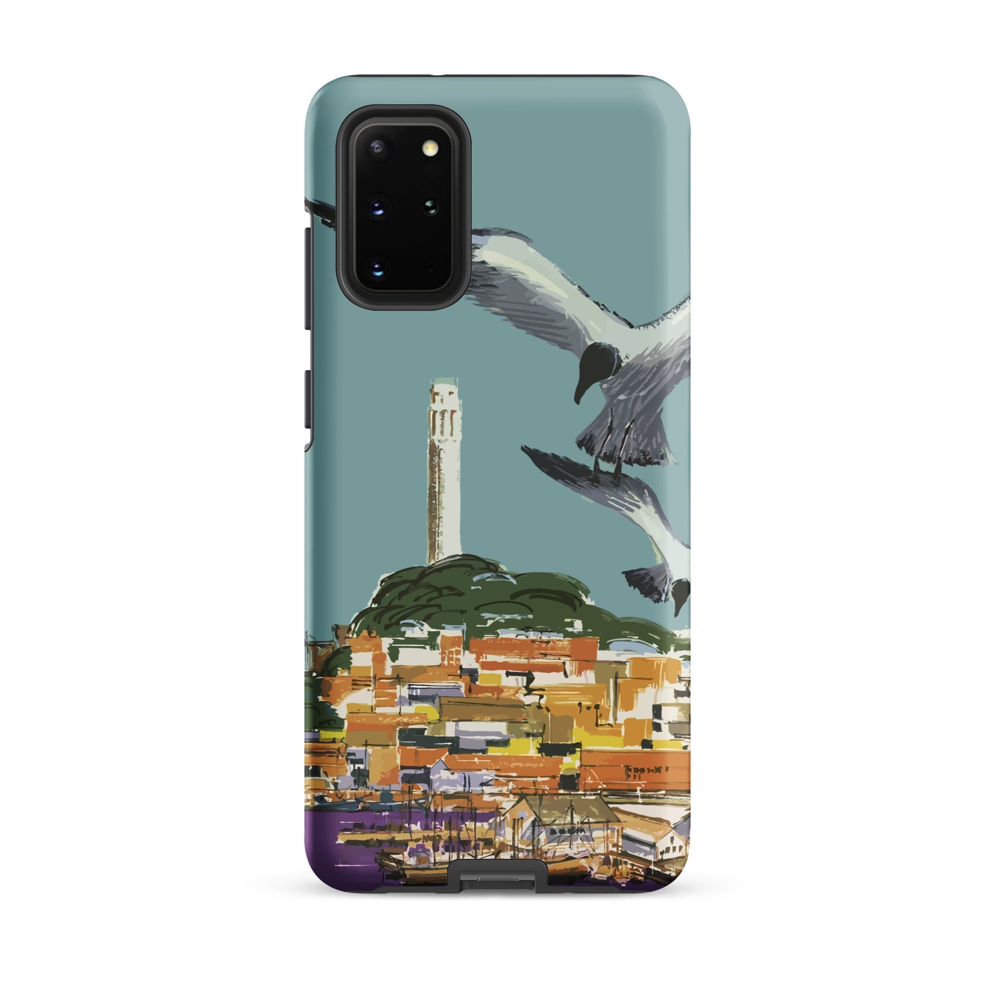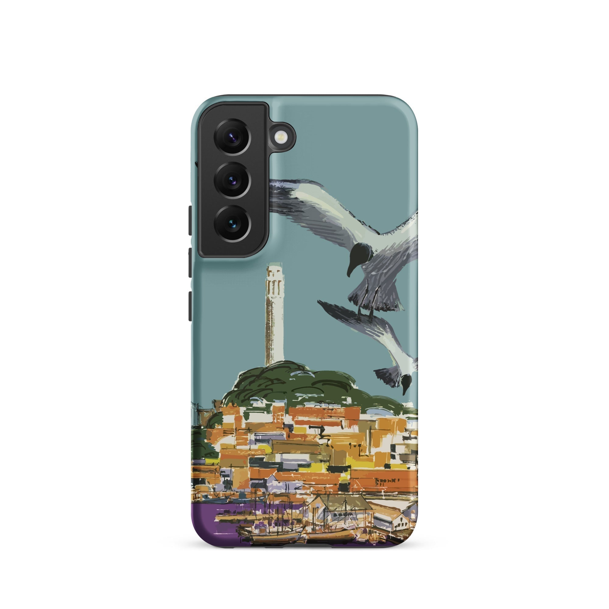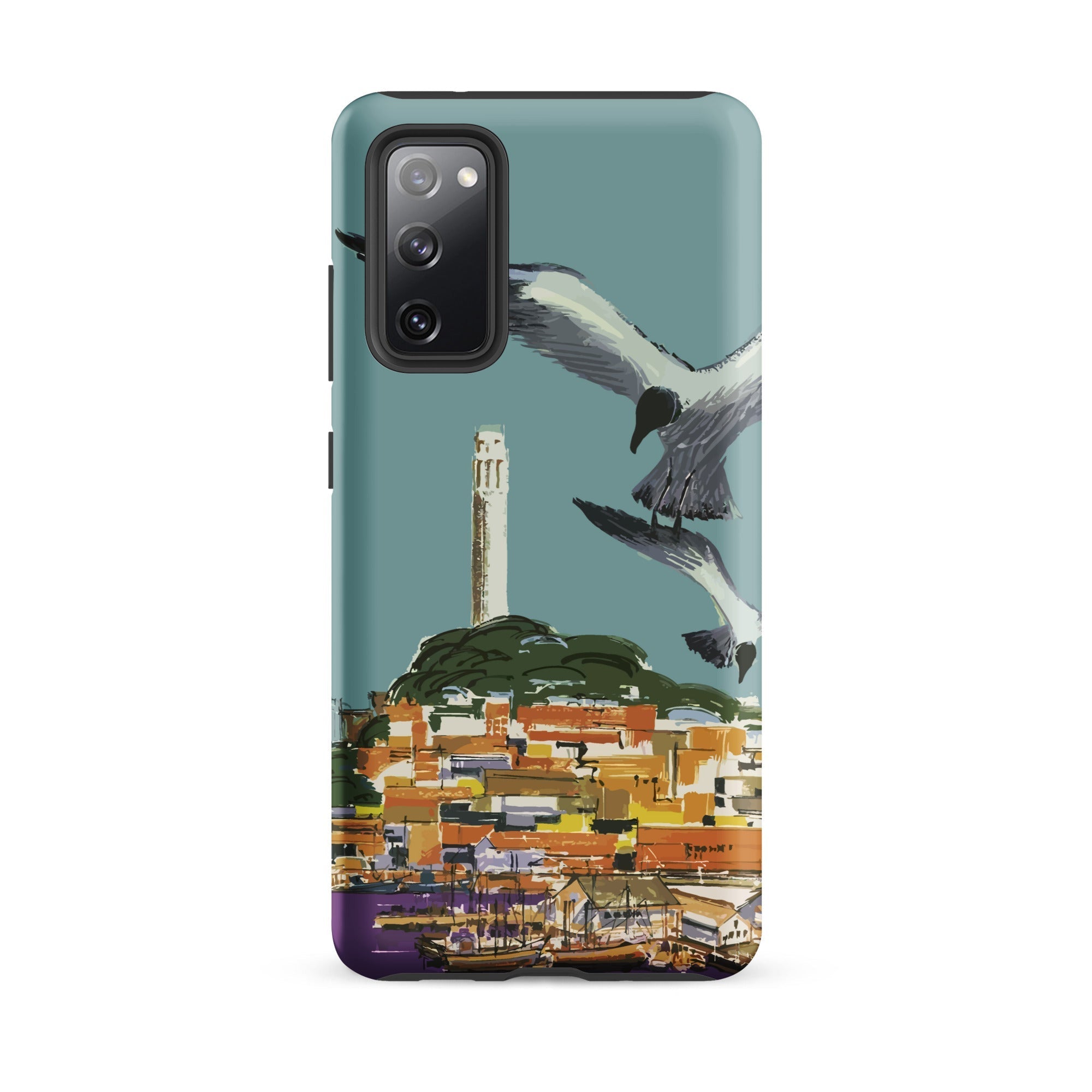 This San Francisco travel poster phone case summons Golden Gate city mythology through the lens of 1940s California promotional art, the soaring seabird a kinetic flourish above one of America's most painted peninsulas.