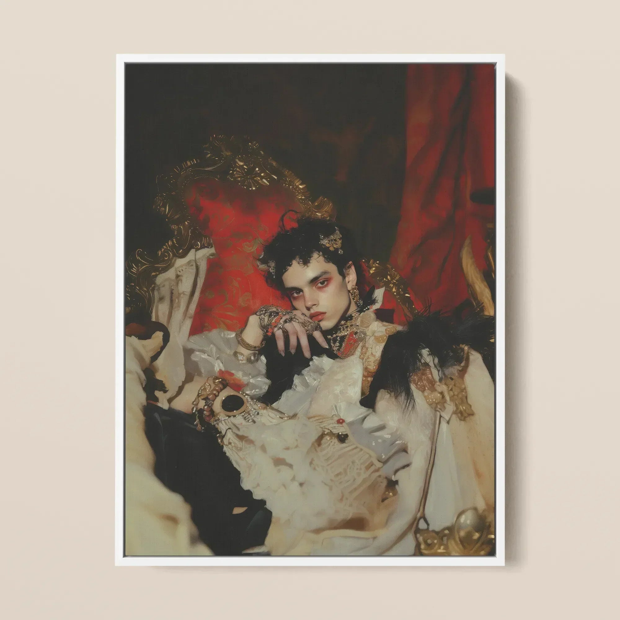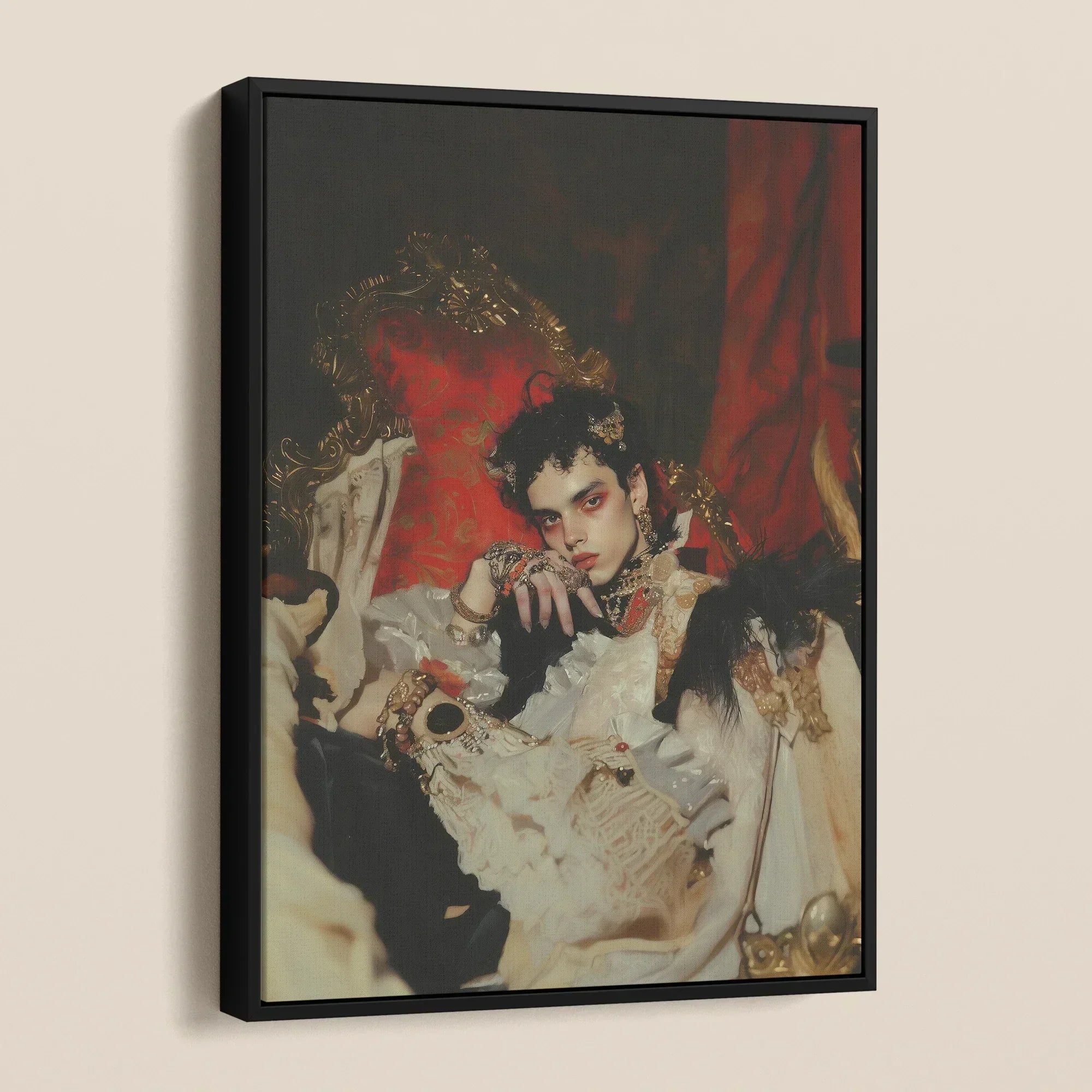 Santino's not just the queer vampire king. He's a reckoning—an immortal sovereign whose court exists beyond time, where devotion is edged with delirium, and love is a ritual carved in red. The vampire monarch lounges against his gilded throne, framed in the deep scarlet of velvet drapery, its hue echoing the quiet thrum of lifeblood beneath fragile human skin. His presence is a storm of contradictions—decadence wrapped around hunger, cruelty softened by something dangerously close to desire.