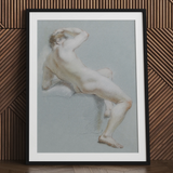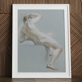 This is atelier work: a life drawing built from patience, an academic nude where every value change proves the method. Three-chalk technique softens the edges; conté lines anchor proportion; foreshortening carries the near leg toward the viewer.