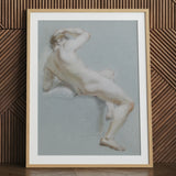 The naked man sits on a padded block, head tipped, right arm hooked overhead, body opening like a hinge. Blue-gray ground cools the field while white heightening pools along shoulder and calf. Red chalk pricks the knee and elbow.