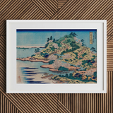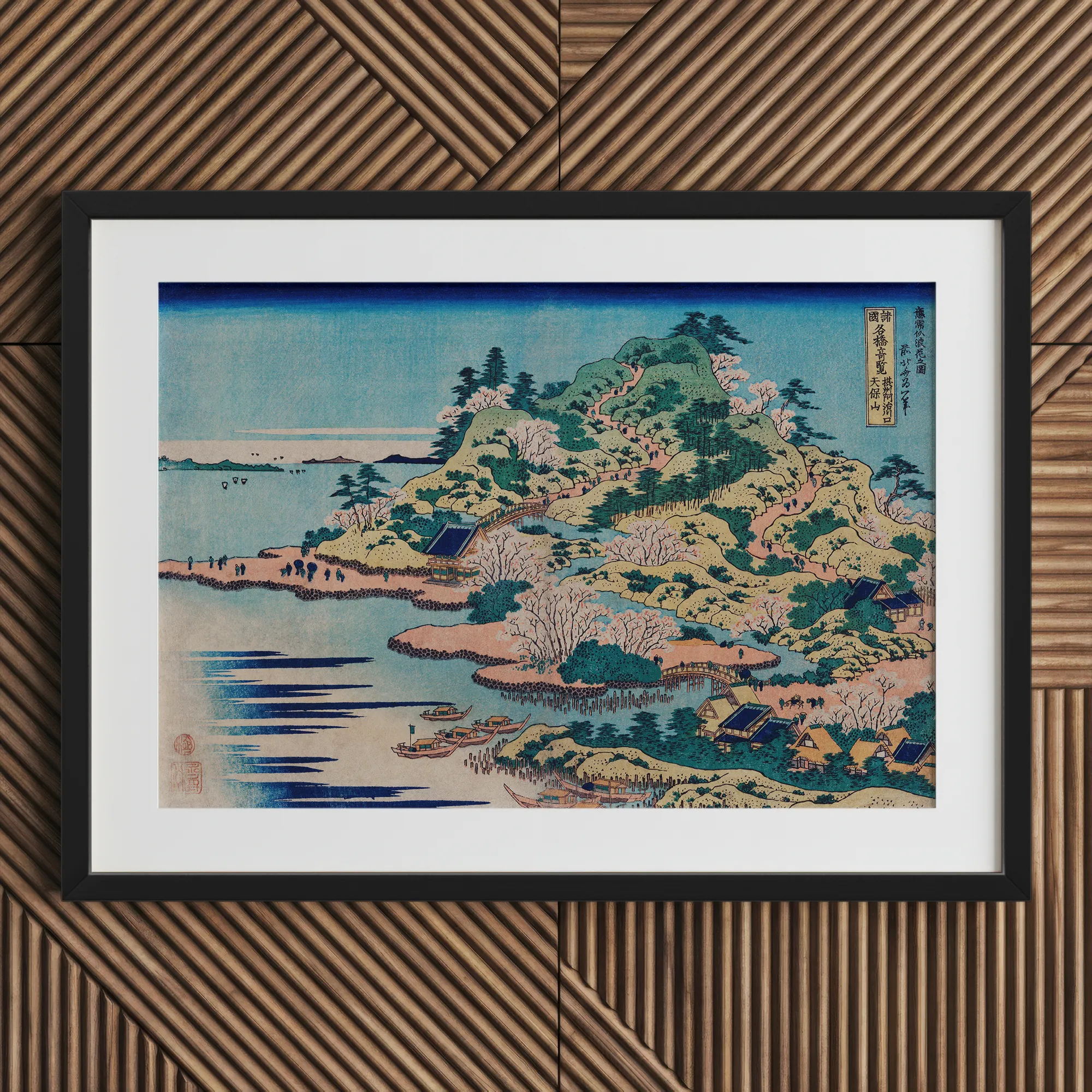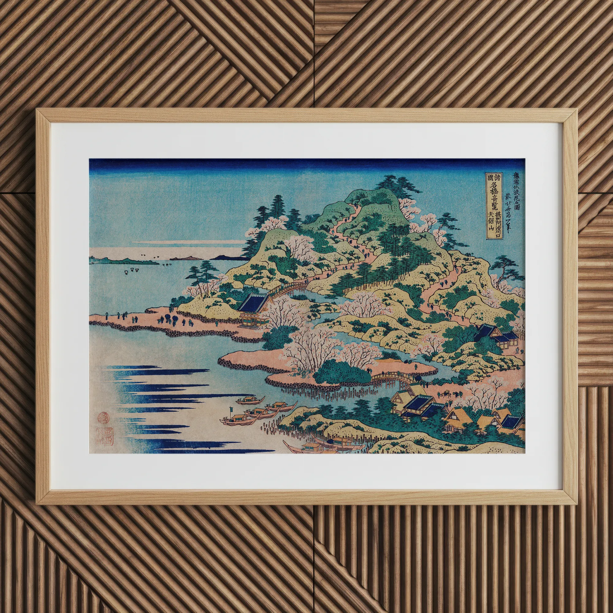 Hokusai's Sesshu Ajigawaguchi Tenposan art print features a glorious coastal dreamscape, beckoning you into Edo-period Japan. This Ukiyo-e woodblock marvel captures the essence of Japanese aesthetics, where cerulean waves caress emerald hillsides dotted with sakura blooms. Meandering paths wind through the composition, guiding your eye as they once led pilgrims on spiritual quests.