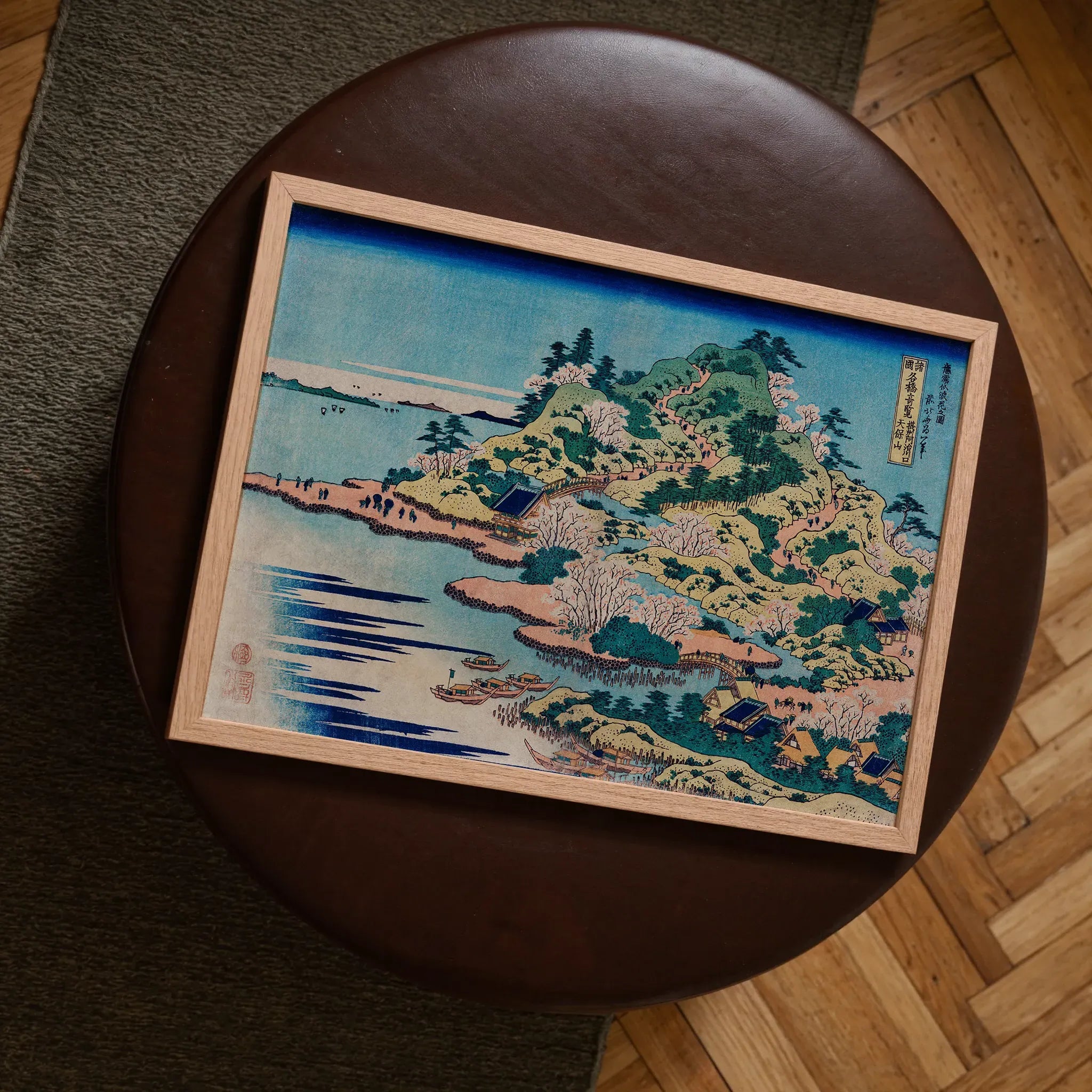 Hokusai's mastery shines in every carved detail - from the delicate veins of cherry blossoms to the rhythmic ripples on the water's surface. The print balances tranquil vistas with bustling human activity, embodying the Japanese concept of man and nature in harmony. Traditional tiled-roof structures nestle organically into the landscape, a visual haiku of earthly and human elements.