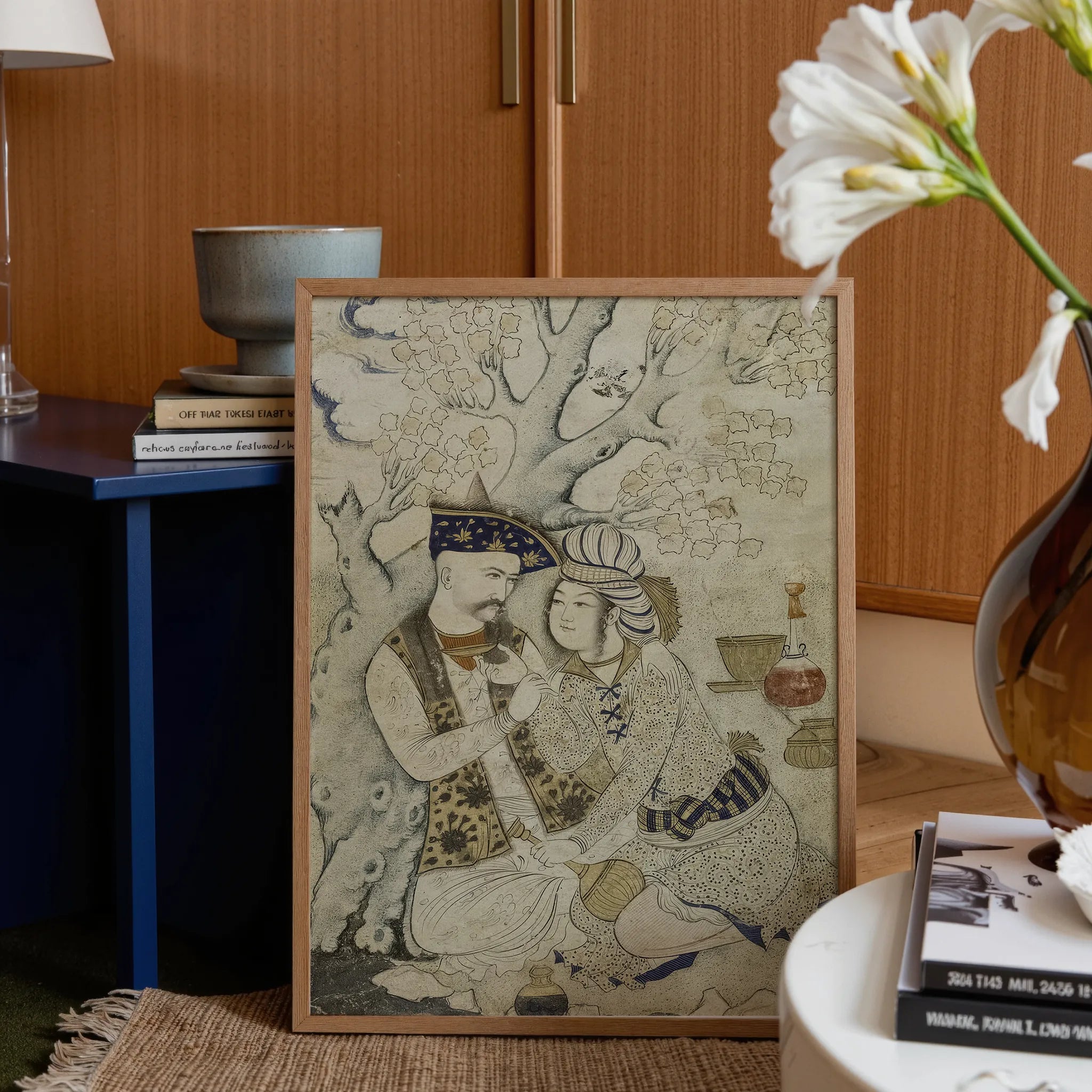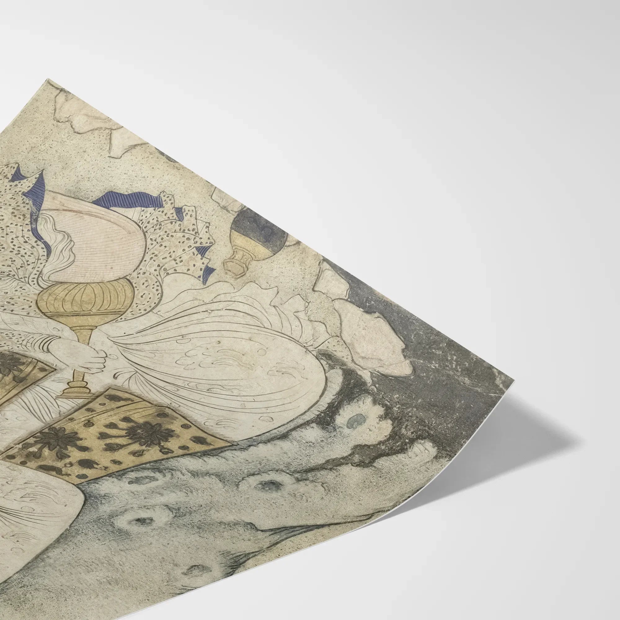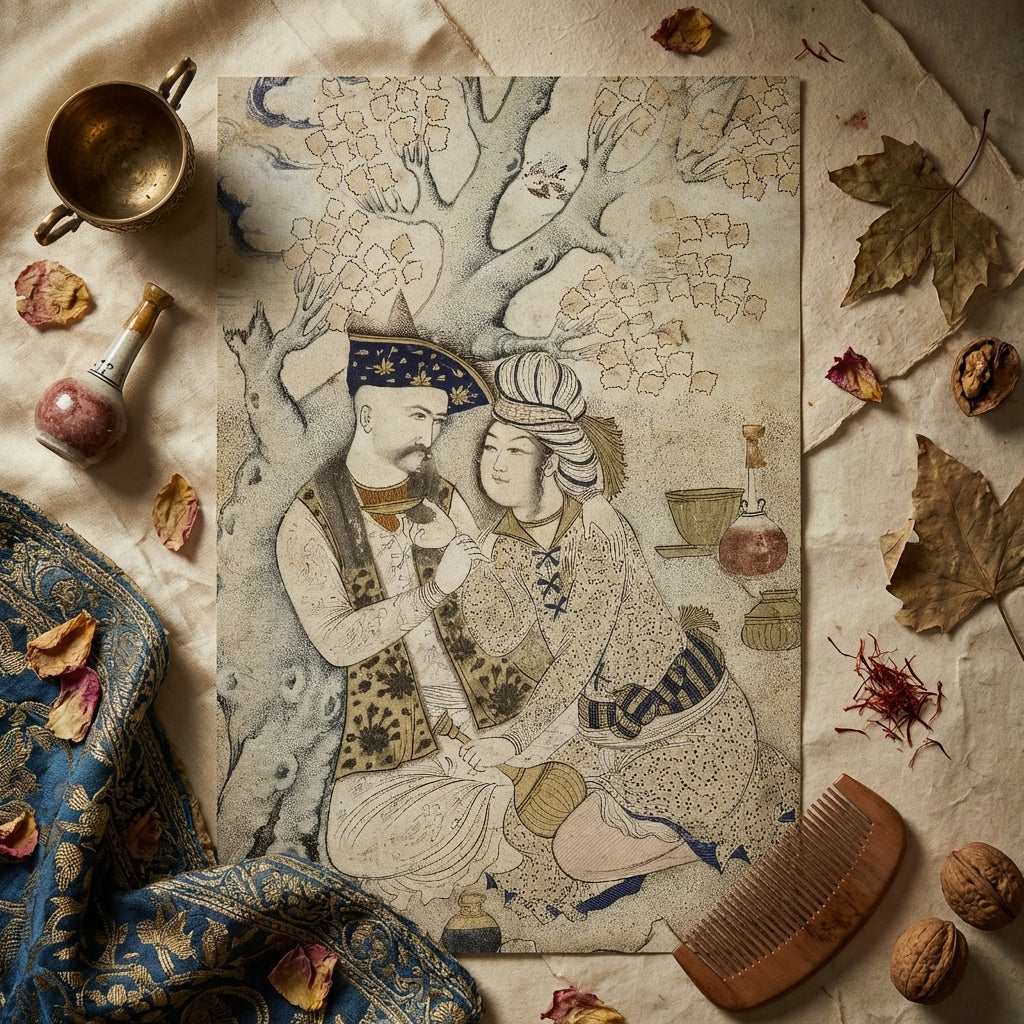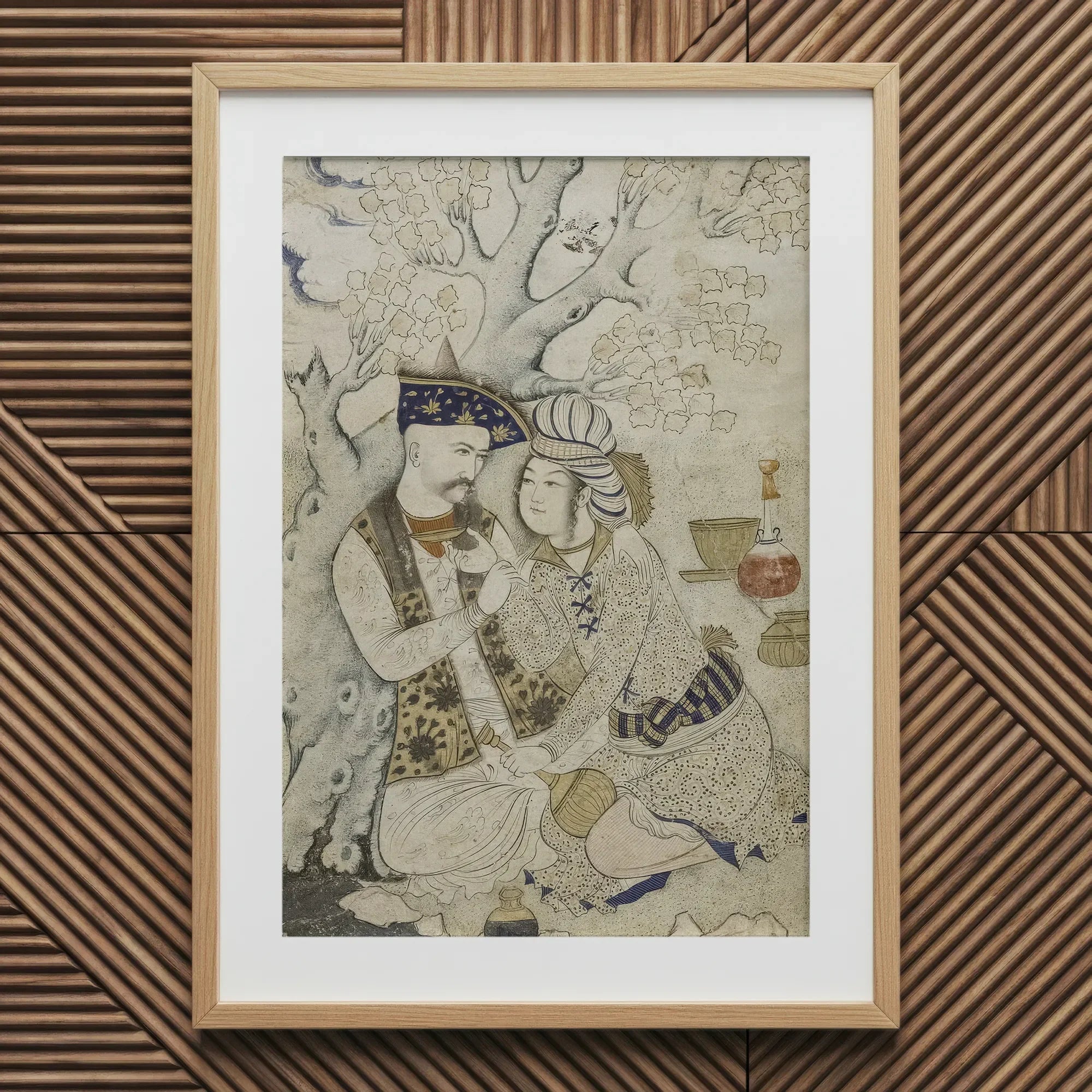 What begins as protocol blooms into passion. Shah Abbas turns toward his attendant, eyes softened, posture unarmored. Qasim Musavvir’s brush translates service into dialogue—the page’s arm curved with practiced care, garments alive with saffron shimmer and indigo threads.