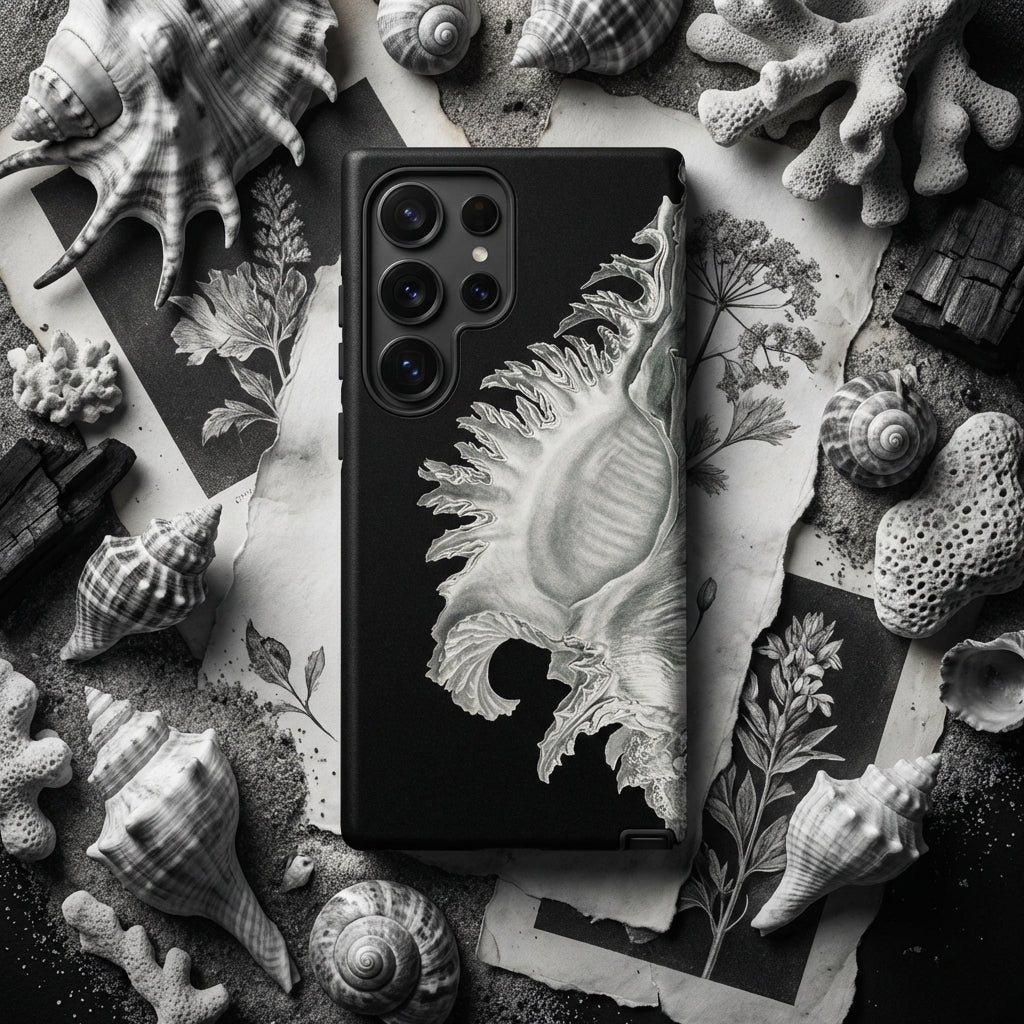 A relic of the ocean's abyss, sculpted by time’s slow hand—this Ernst Haeckel shell phone case turns your device into a portal to the deep. Intricately drawn, each ridge and curl of this vintage scientific illustration captures the quiet mathematics of marine life, where spirals echo the unseen rhythms of the sea.