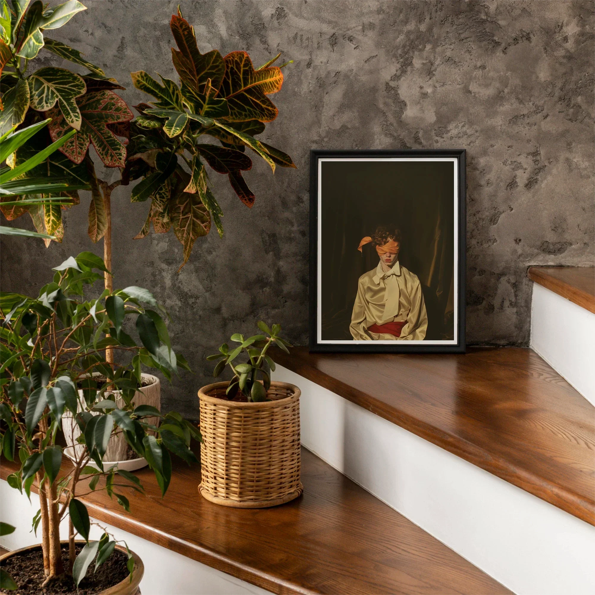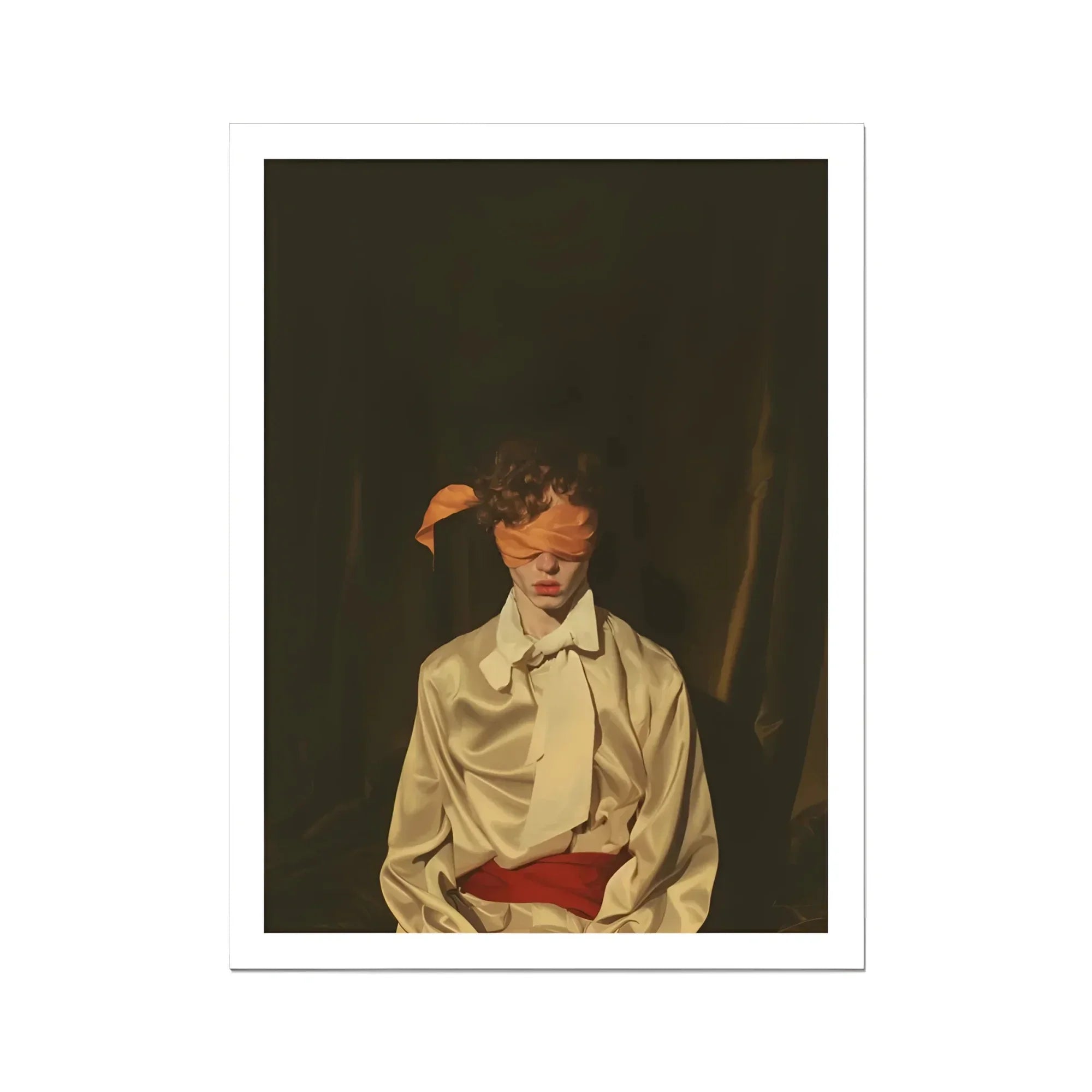 Baroque sensuality collides with queer aesthetics, the portrait steeped in chiaroscuro drama. Shadows coil like whispered confessions, swallowing everything but the glint of silk and skin. The crimson sash at his waist—bold and commanding—recalls the regalia of bygone eras, evoking Spanish court portraiture, the romance of dandy aristocracy, the theatricality of queer-coded history. This is an art print that breathes opulence, its hyperrealistic detail capturing not just fabric but the weight of narrative itself.