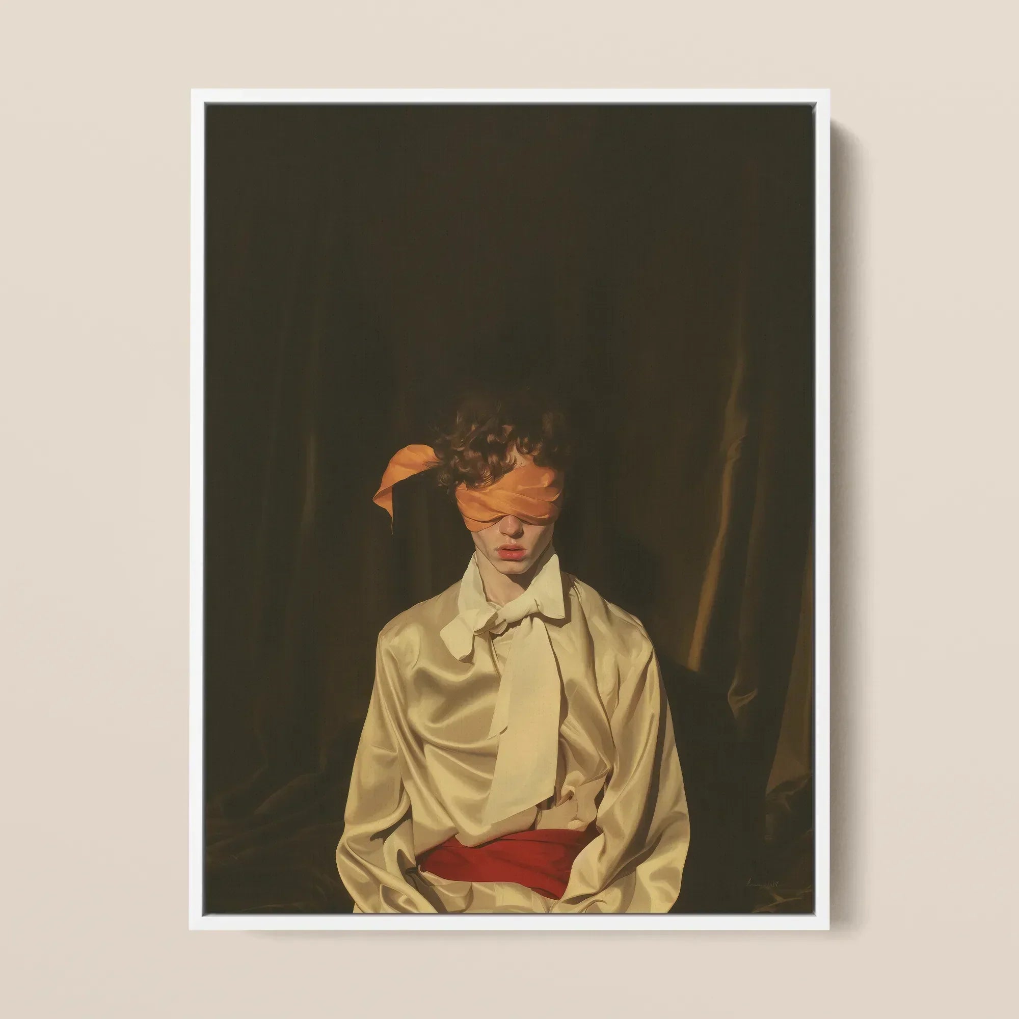 A silk ribbon of burnt-orange binds his vision, its delicate knot resting near his temple, evoking themes of trust, fate, and unseen knowledge. His cream satin blouse cascades in fluid, luminous folds, the rich texture rendered with a precision reminiscent of Old Masters like Caravaggio and Velázquez. A lavish ivory cravat spills from his throat, its historical grandeur offset by the deep crimson sash cinched at his waist—a bold contrast symbolizing passion, sacrifice, and aristocratic restraint.
