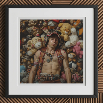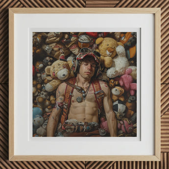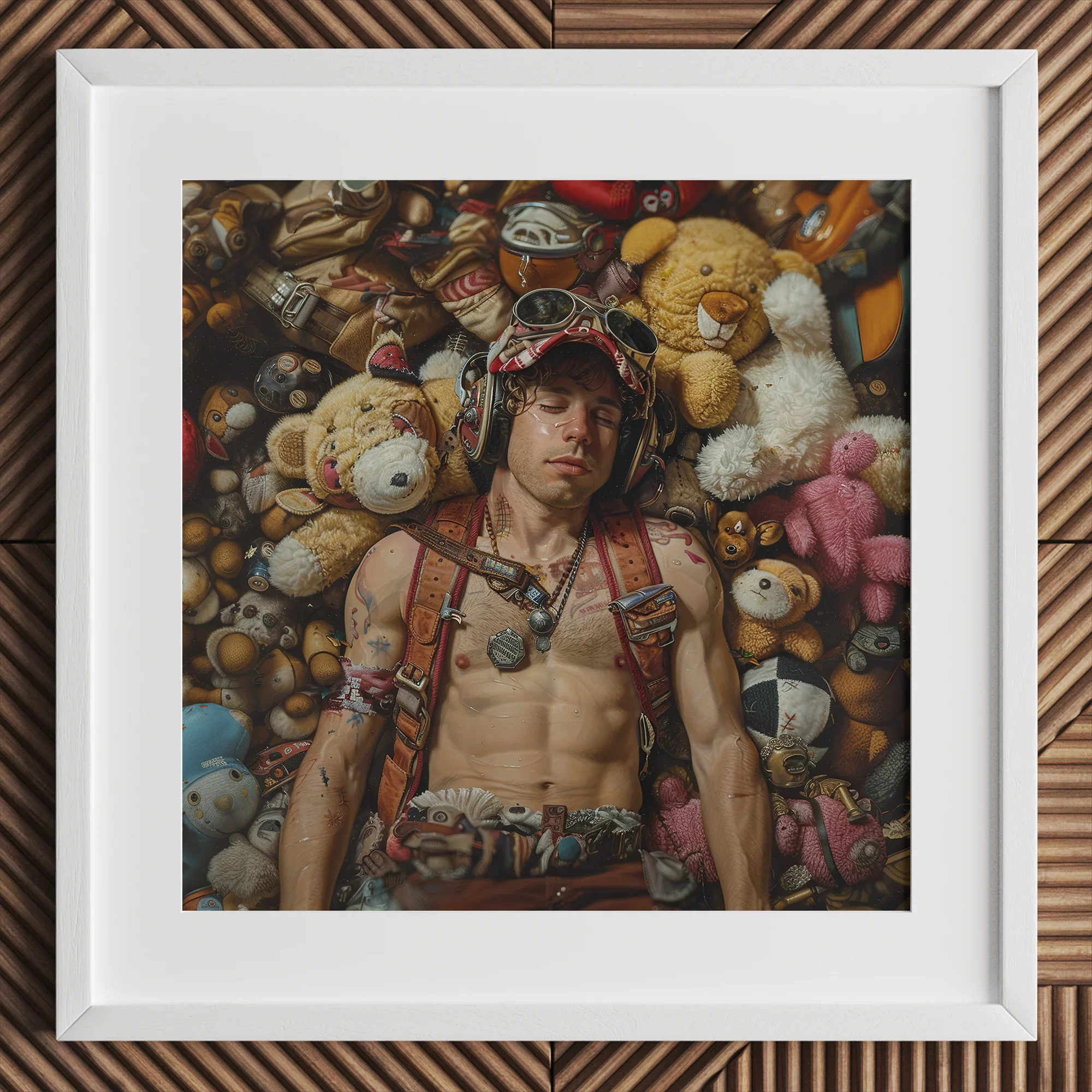 Lost in a sea of absurd nostalgia, the shirtless pilot lies suspended between childhood fantasy and homoerotic sensuality. His goggles and harness contrasting with the gentle plush army cradling his muscular form. Stuffed animals, innocent yet unsettling, surround this queer figure in a surreal embrace. Taking on an almost voyeuristic role, while the pilot himself lays bare chested and lost in dreams — bold, exposed, at your mercy. Their silent presence transforming this lowbrow gay pilot into a visual metaphor for lustful vulnerability.
