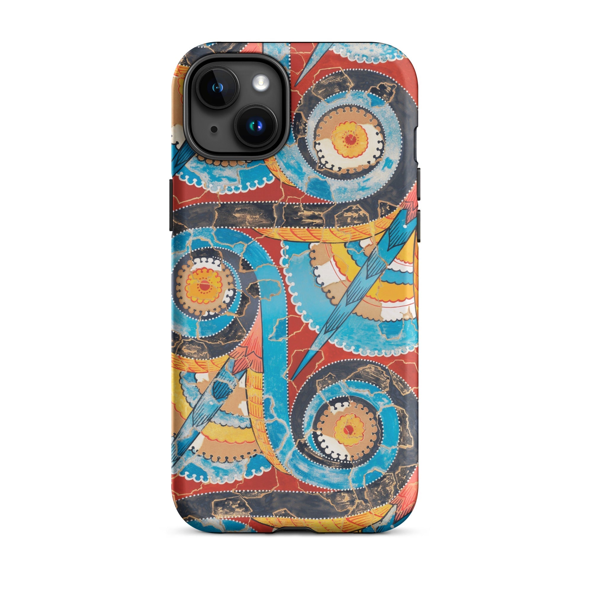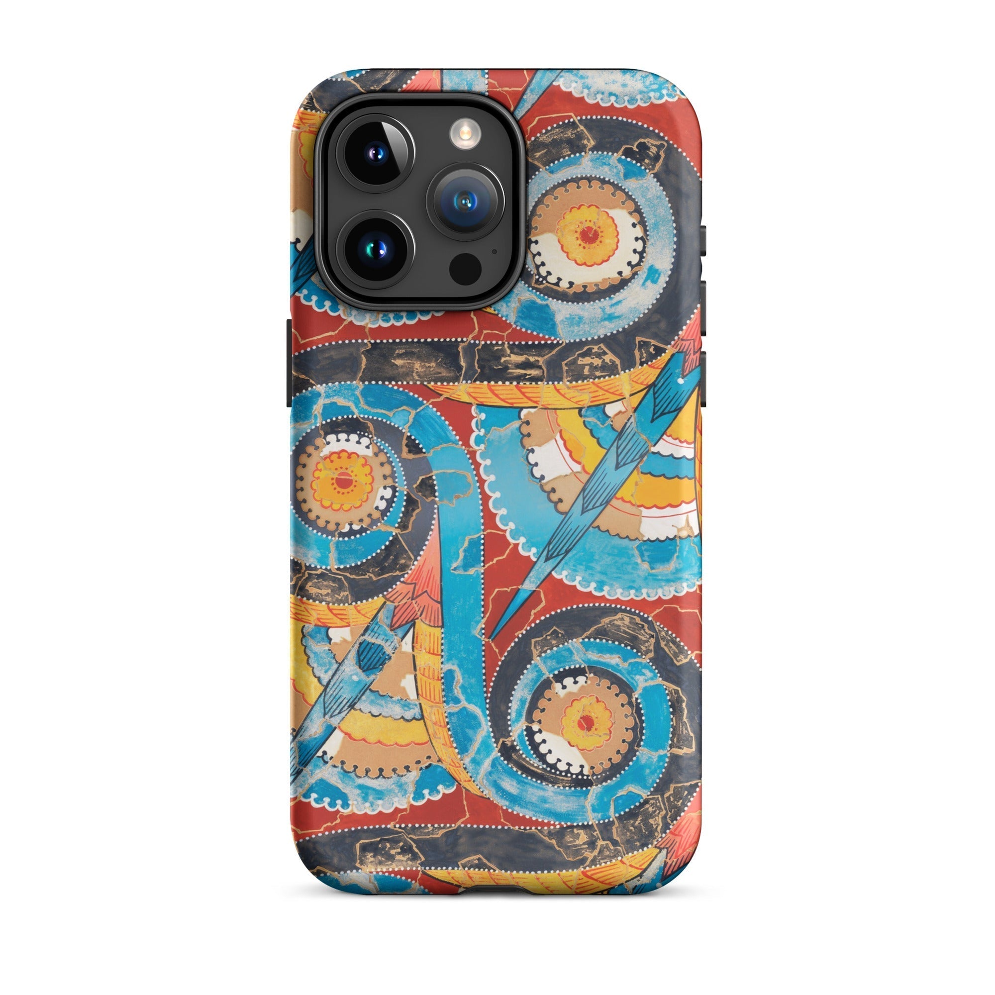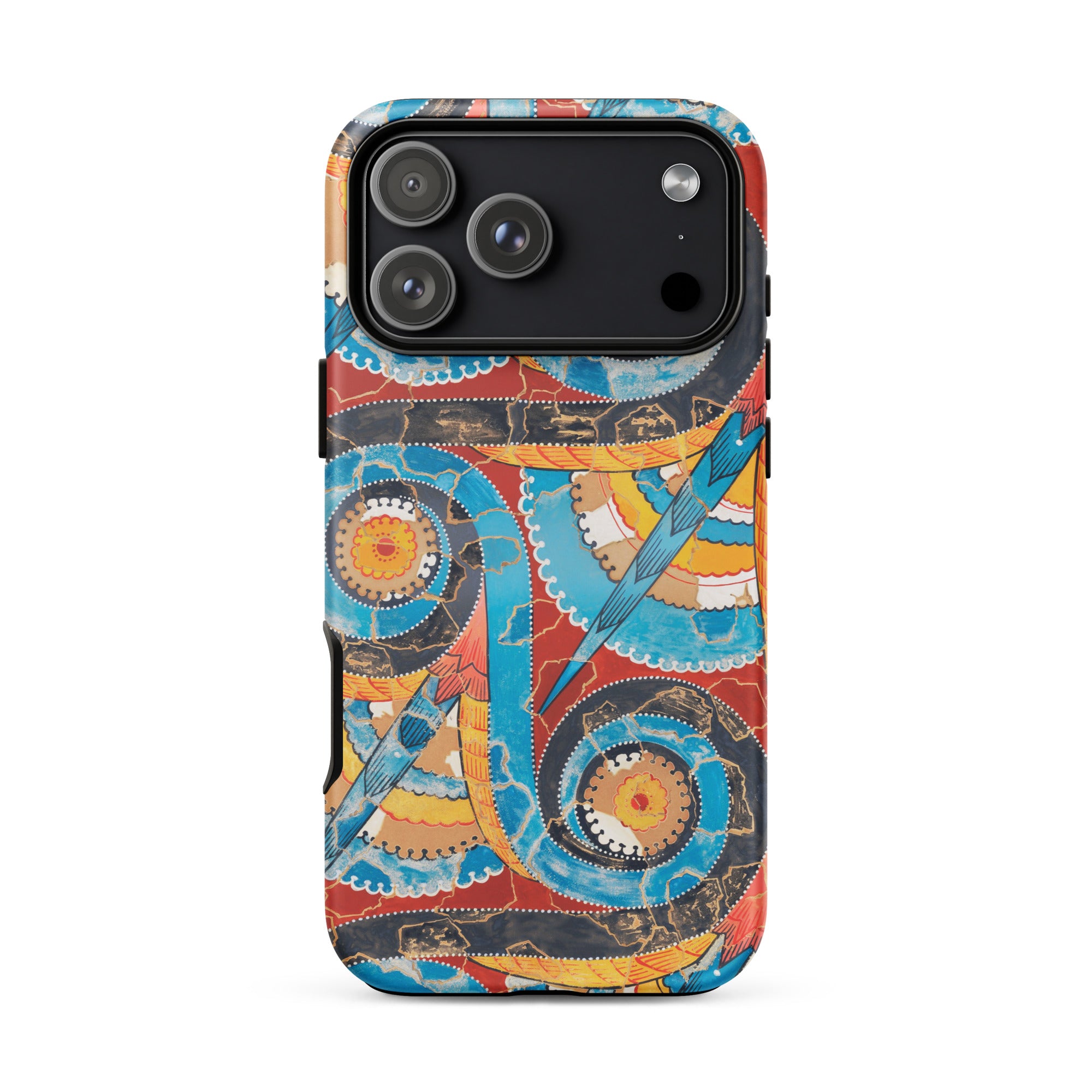 Vivid ochre, deep cobalt, and earthen sienna interlock like celestial gears, evoking the motion of tides, the rhythm of myth. Archaeological artwork meets modern protection, the cracked textures whispering of timeworn palaces, of Knossos wall paintings reborn.