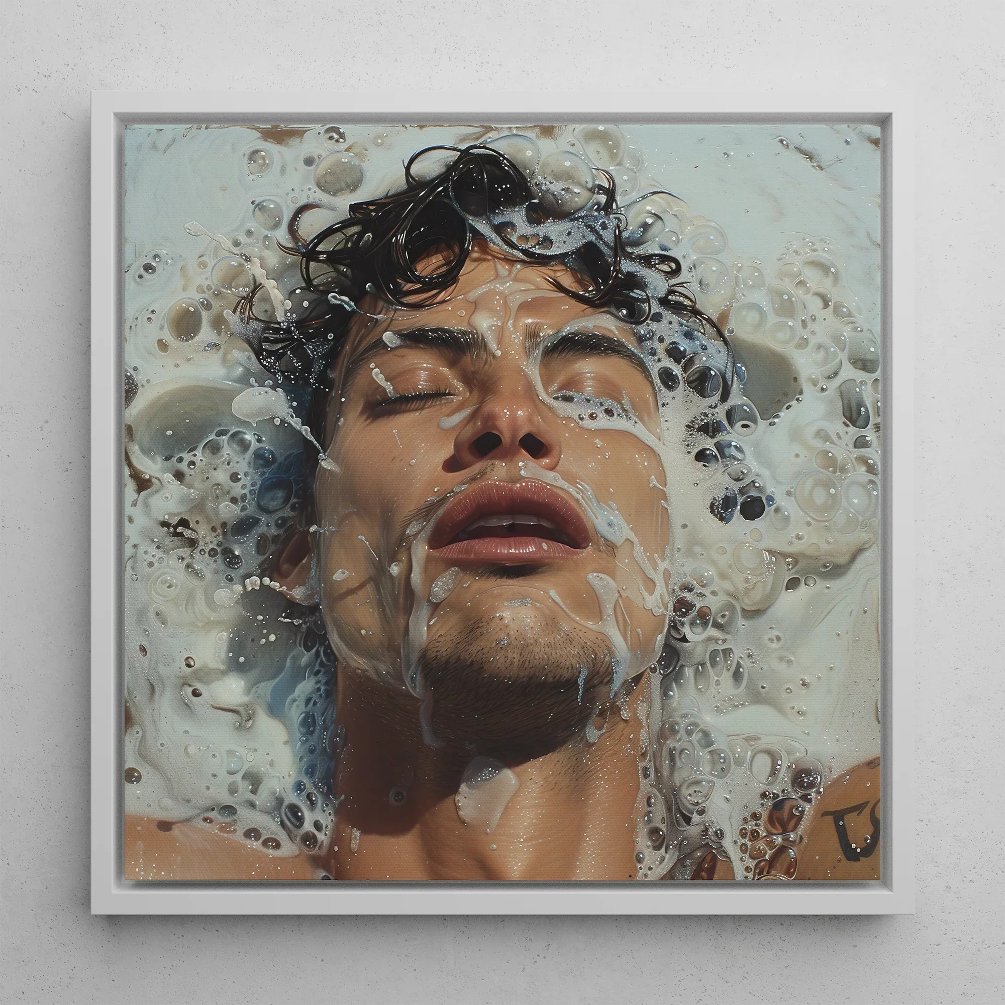 This isn’t merely a man submerged—it is a portrait of transformation. As the foam caresses his neck and shoulders, it speaks of release, a gentle unraveling of tension, where the water serves as both cradle and a cocoon, wrapping him in liquid serenity, finding peace in vulnerability. A dive into pleasure's quiet roar...