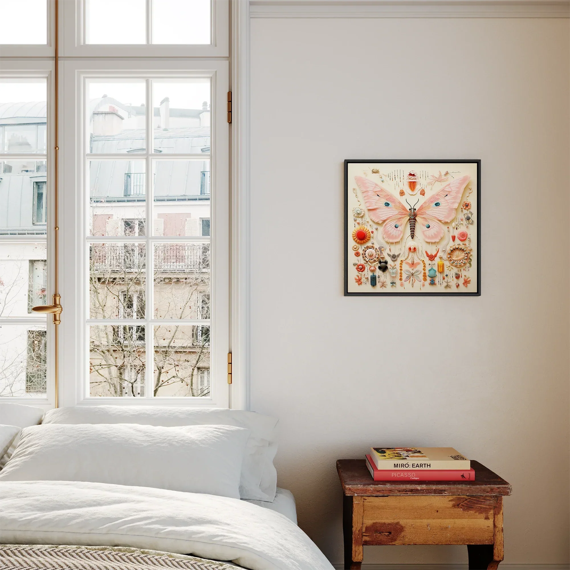 The centerpiece—a majestic pink butterfly with azure eye spots—commands attention, surrounded by a taxonomic array of fantastical insects and flora. Each element, from the vibrant orange sunburst to the delicate blue spirals, is rendered with painstaking detail, creating a visual symphony that challenges traditional notions of biological classification.