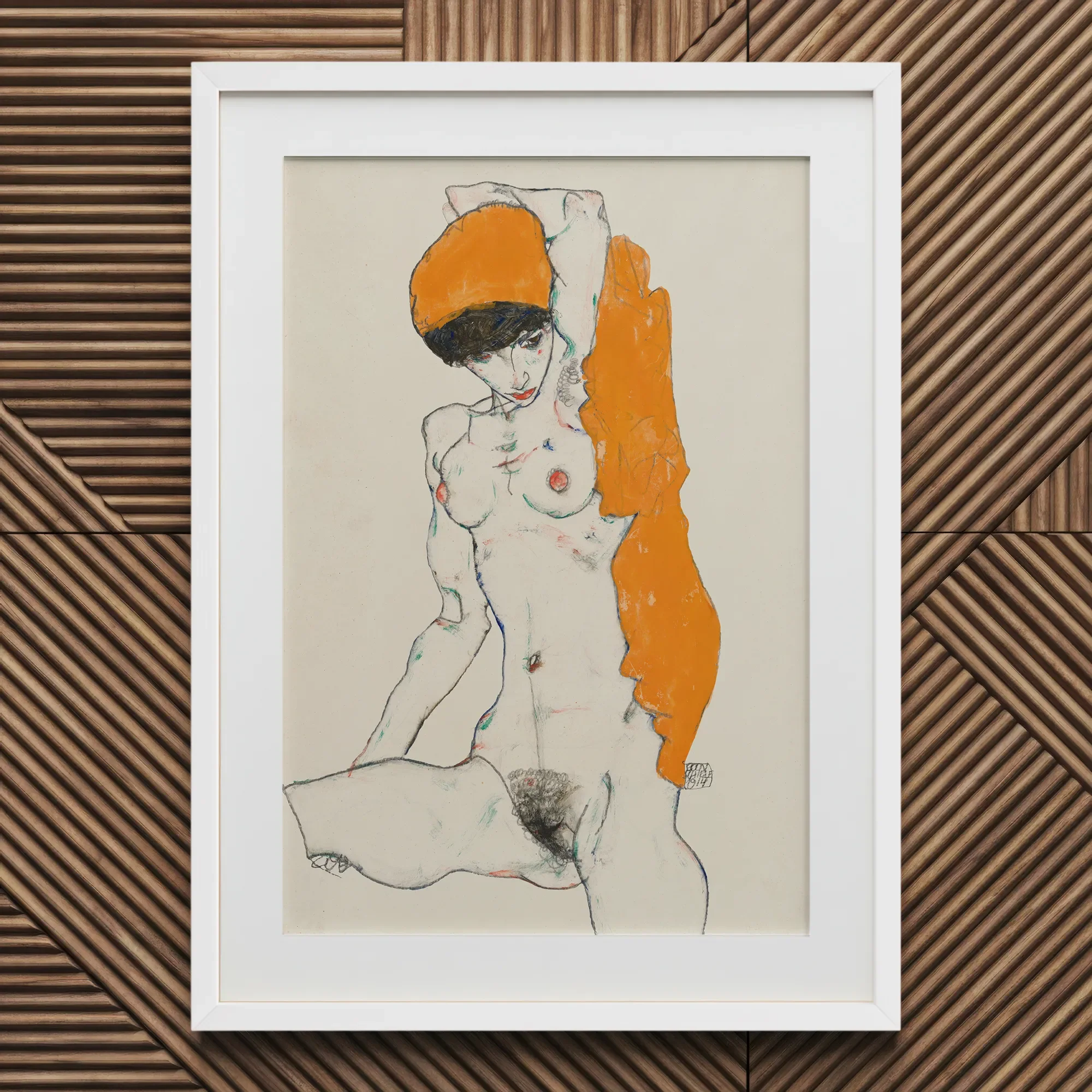 The model's contorted pose and stark nakedness confront as much as they tantalise. Her gaze averted beneath an orange shock of a scarf wrapped around her dark hair that echoes vibrant drapery and fiery passion. This juxtaposition of flesh and fabric creates a visceral interplay of texture and tone, emblematic of Schiele's grotesque yet mesmerizing aesthetic.