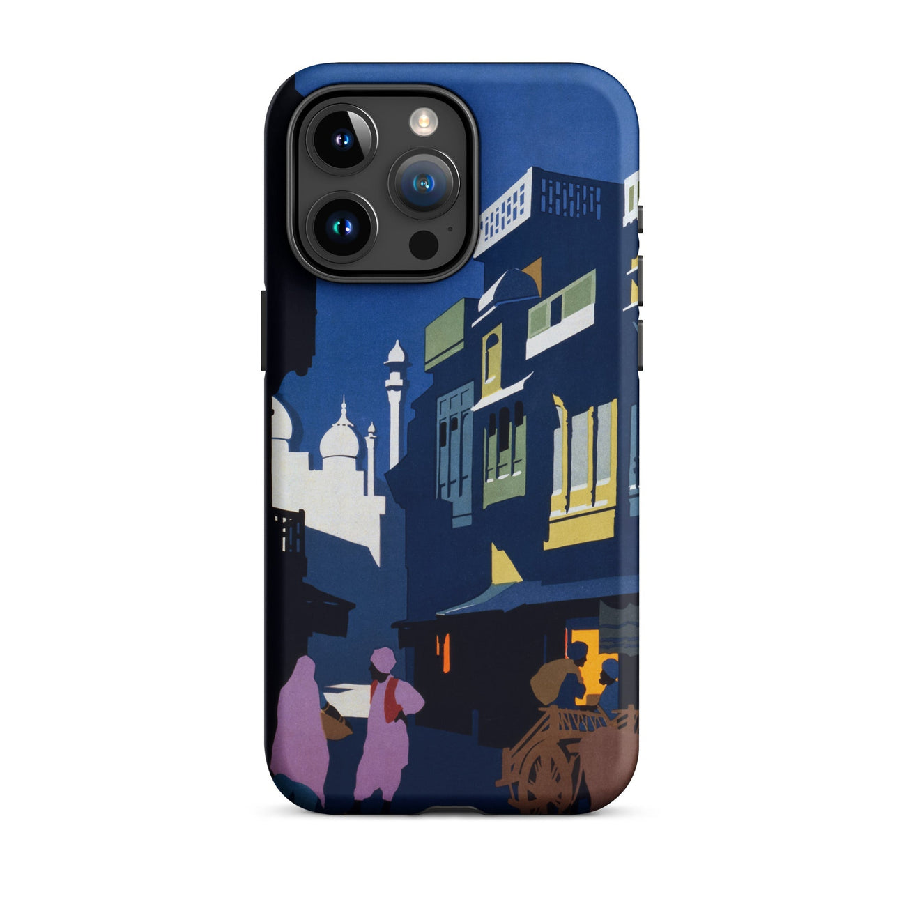 The street unfurls into an intimate horizon, its depths illuminated by the faint silhouettes of mosque domes and spires. These architectural beacons speak of Mughal grandeur, their elegance a whispered dialogue with the sky. This tableau, frozen in flat, layered lithographic hues, captures more than a nocturnal scene; it encapsulates the convergence of tradition and modernity, mystery and familiarity, casting India as both a lived experience and an eternal dreamscape.