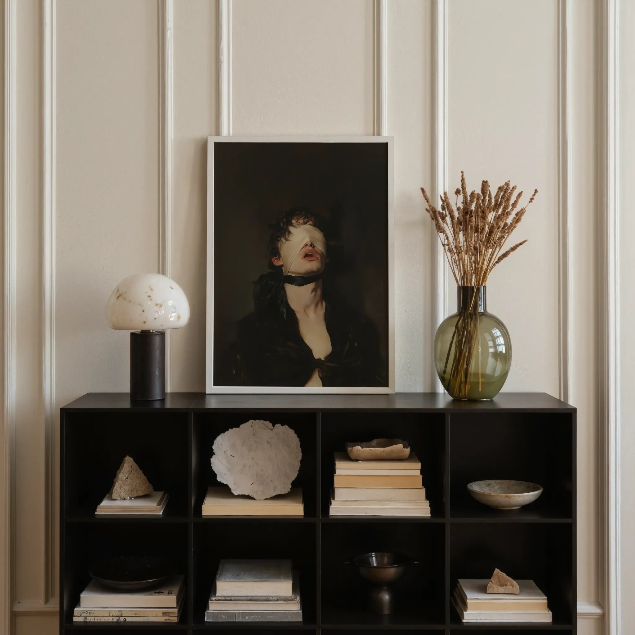 A queer reimagining of classical neo-Victorian portraiture, this artwork speaks to the intimacy of restraint, the seduction of mystery, the raw vulnerability of blindfolded submission. More than a painting—it’s an invocation. An invitation. A challenge to see—and feel—without sight... without control.