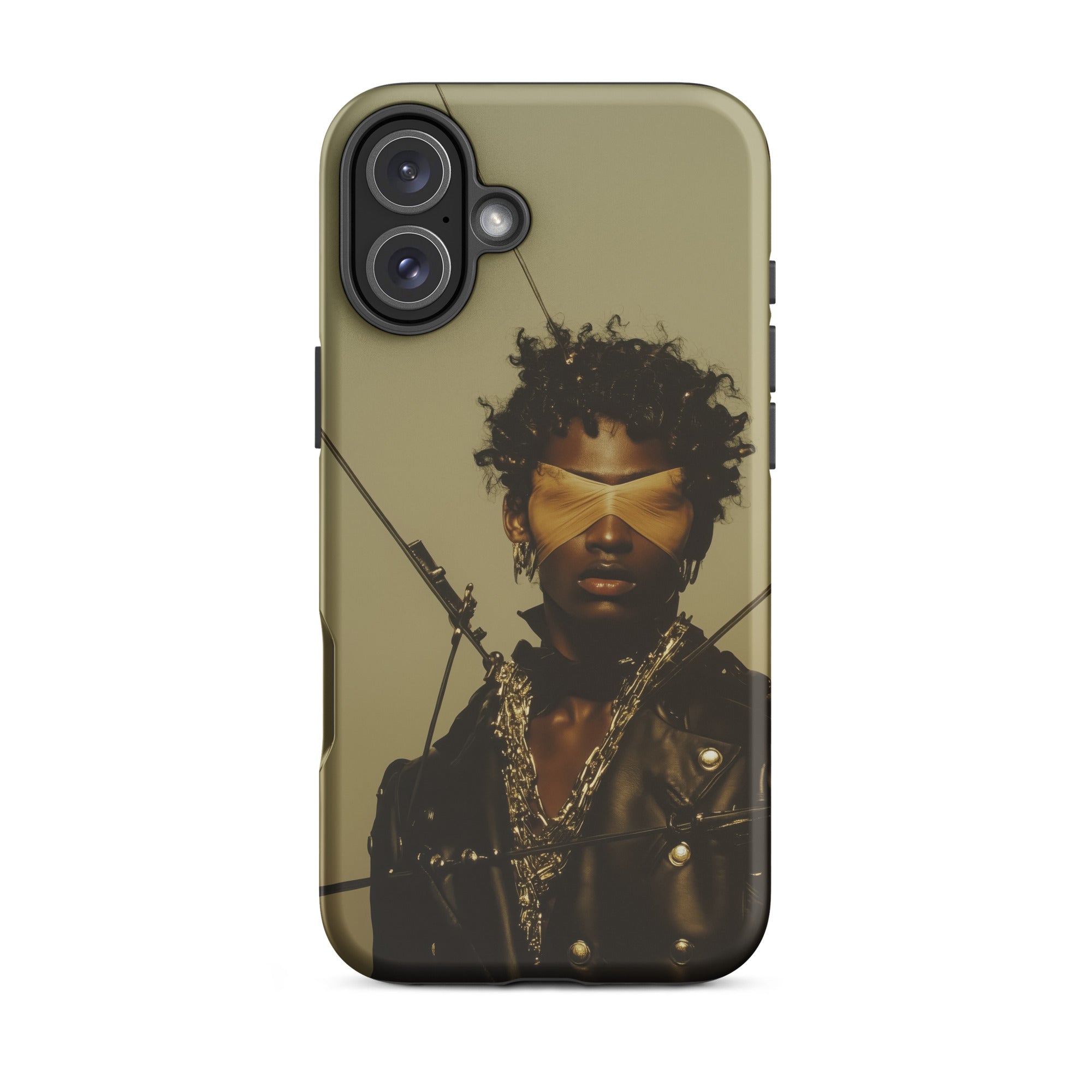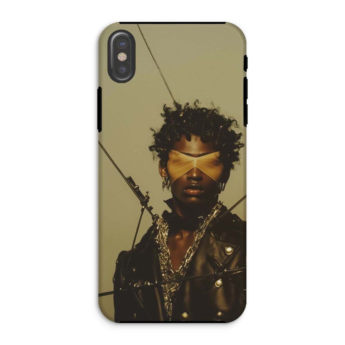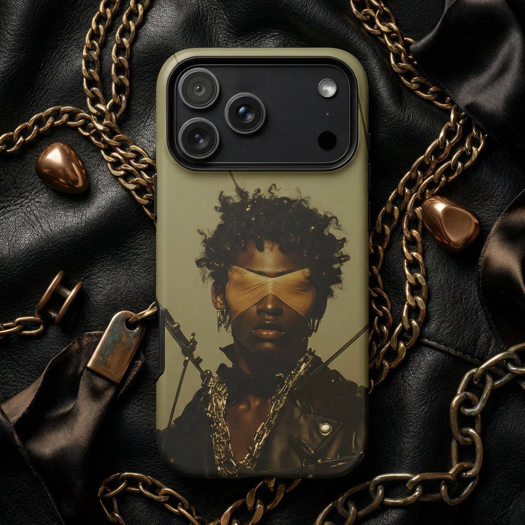 His outlaw visions thrive on style as counterweapon. Wearing a blindfold like blackout zones in the data stream. It’s ochre silk the color of withheld testimony and sex club floorlight. Tight across the eyes like someone dared him to make a new kind of justice—one that can't prosecuted or archived.