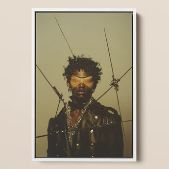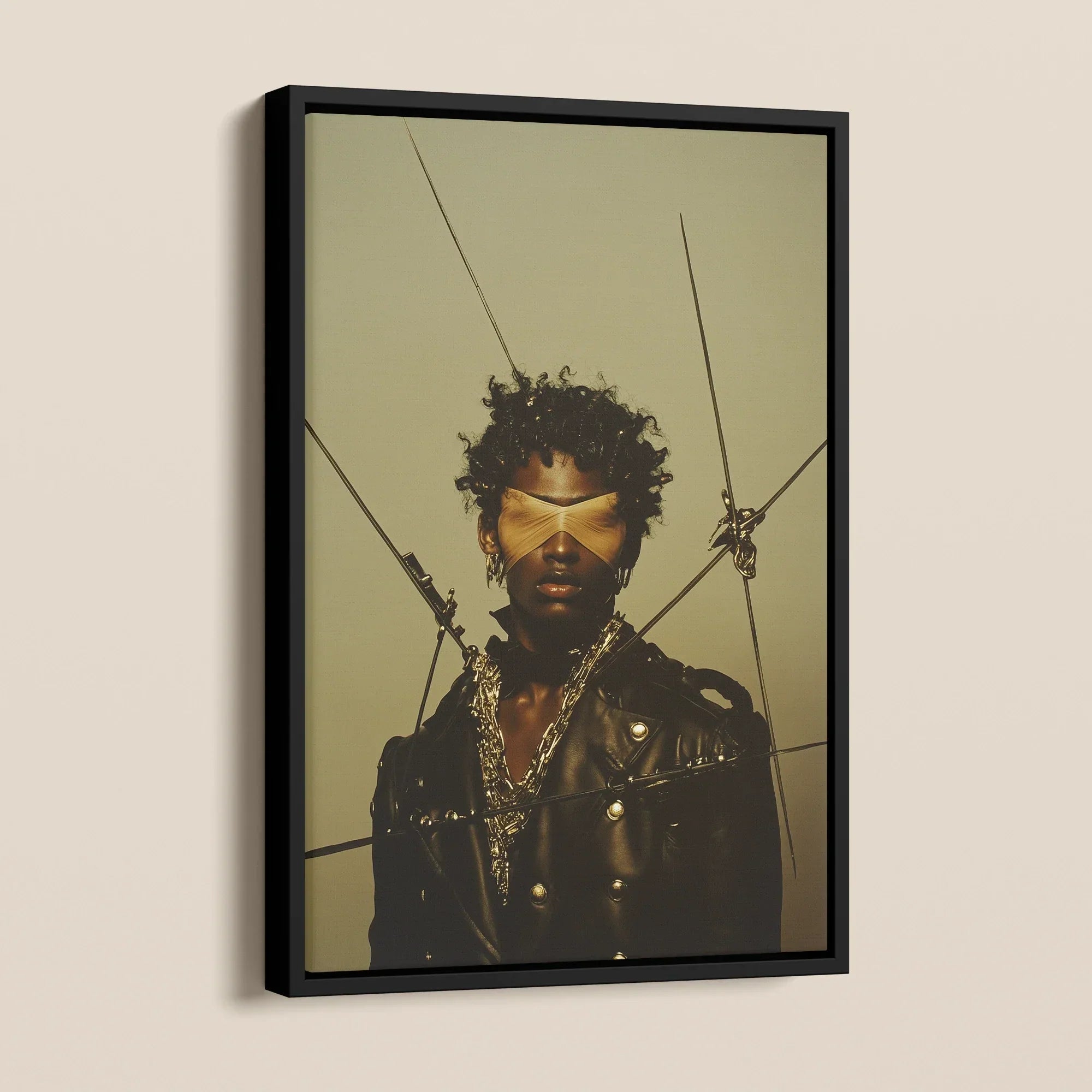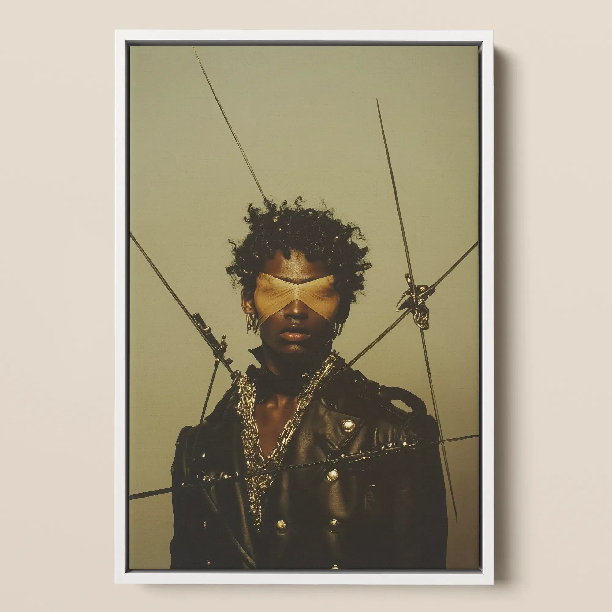 This is a portrait of sacred tension: a surrealist icon forged in Afrofuturist shadowplay. The ochre blindfold is not submission—it is refusal. A denial of spectacle. The eyes withheld are not hidden—they are guarded. The jacket gleams like weaponized memory, studded with the aesthetics of grit and survival.