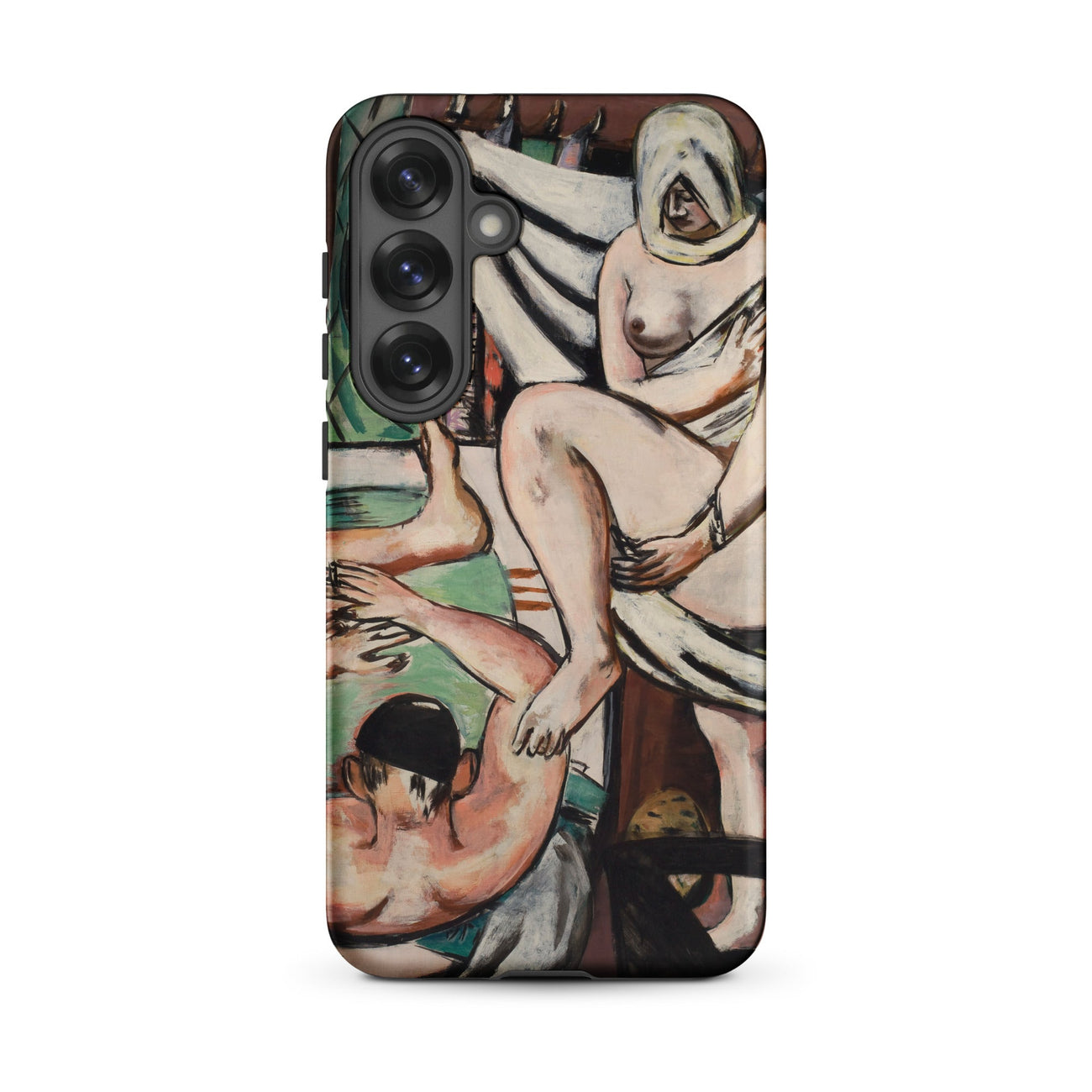 A veiled bather perches above, her gaze turned inward, while below, another body twists toward her with both longing and fatigue. Every brushstroke clings to Expressionist urgency. Distorted anatomy, cropped composition, claustrophobic framing. Pulling you into Beckmann’s post-war psyche, where pleasure tangles with disquiet.