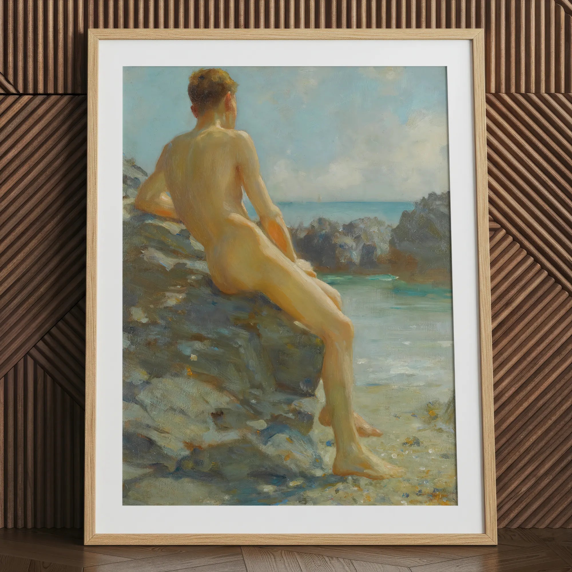This print thrums with the painter’s devotion—each stroke a quiet summons of pagan delight, each curve of the boy’s lean body a silent testament to the shimmering hush of desire and sea.