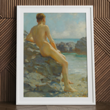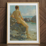 Shadows gather in rock crevices, skin pulse with the sea’s secret glow—ochre, pearl, and moss entwine, a ritual of maritime yearning. His back arcs into the salt-stung air, echoing mythic forms born of stone and water. Tuke’s brush renders the ocean’s sigh in pigment: soft blues and cold greens, the horizon’s grey embrace.