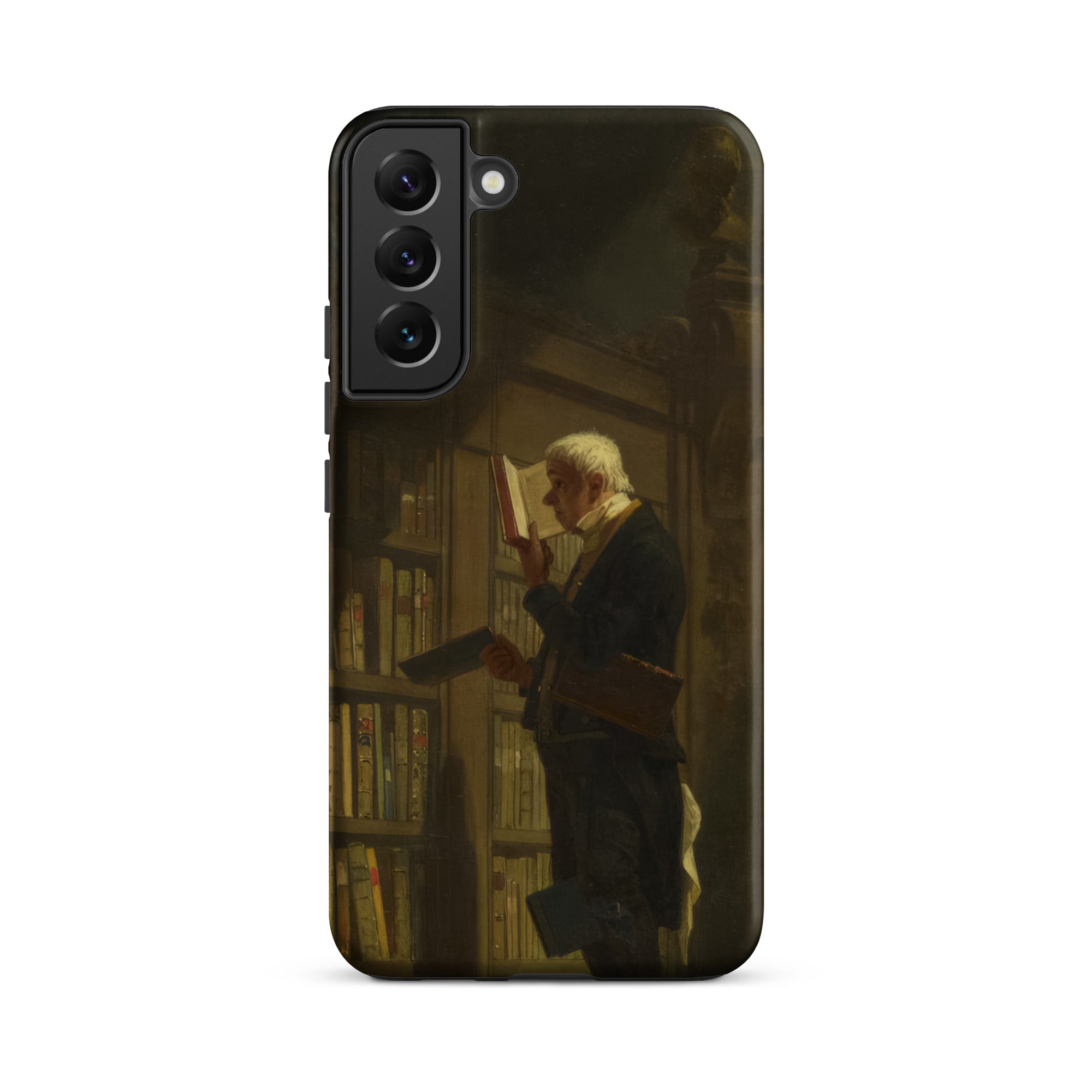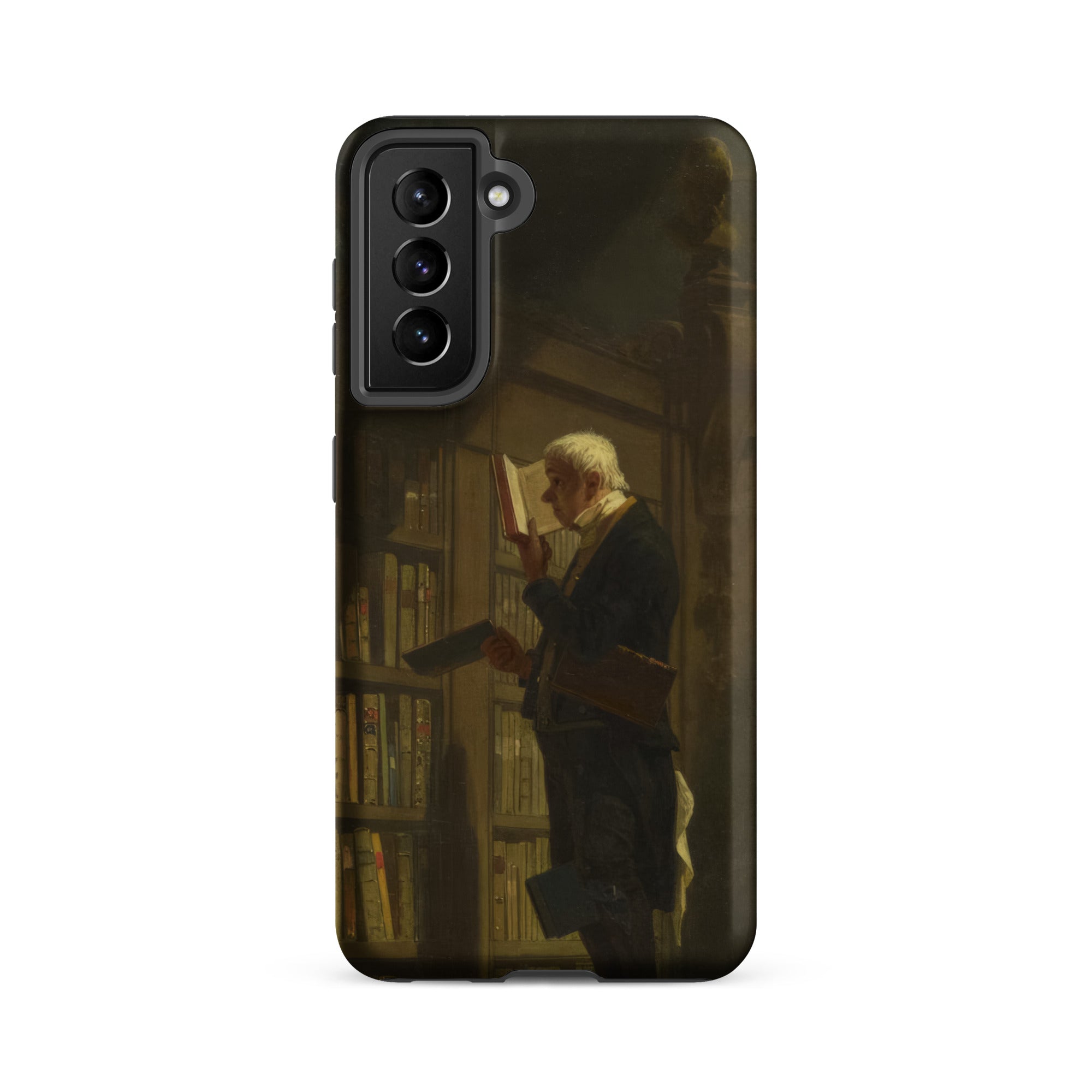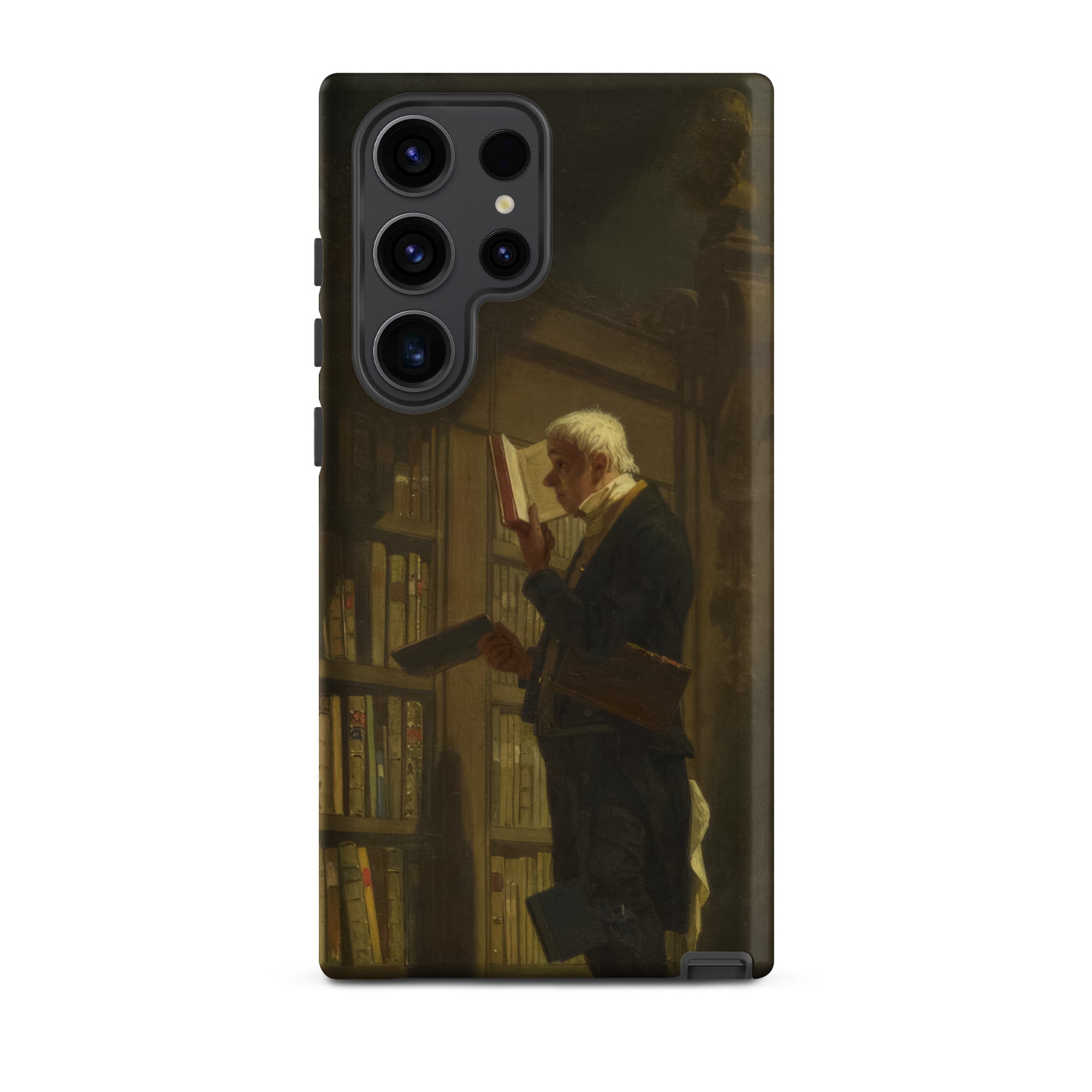 Carl Spitzweg’s The Bookworm wraps this Samsung case in the glow of a dim library, where tall shelves rise behind a scholar absorbed in fragile pages. His white hair catches the filtered light, lending gravity to his bent posture. He clutches one book, balances another, with still more tucked under his arm, suggesting obsession rather than casual reading.