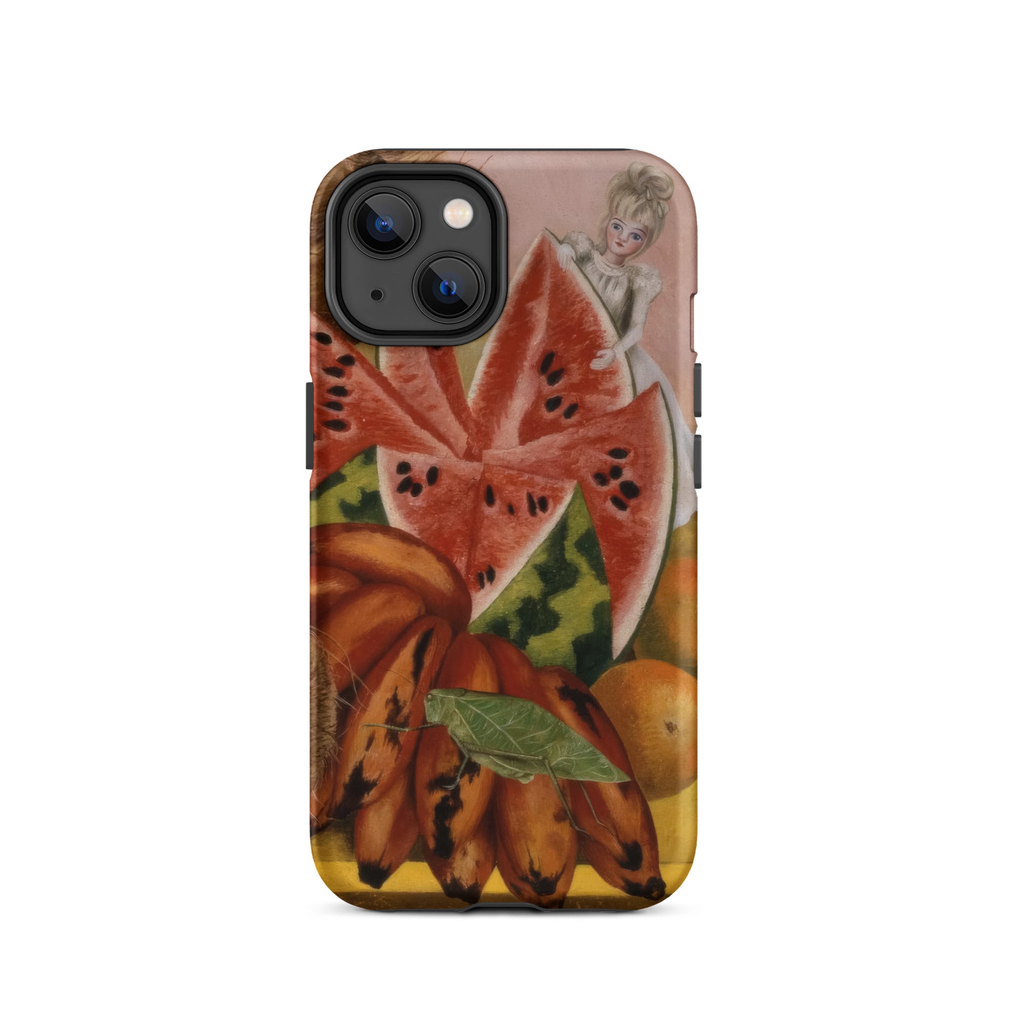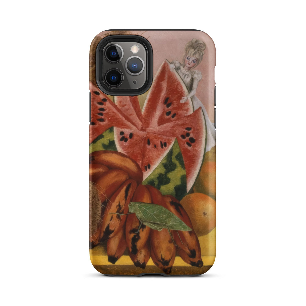 Kahlo forces innocence into collision with fertility’s raw spectacle, collapsing still life tradition into a surreal stage of desire, fear, and revelation. Printed edge to edge on this iPhone case, every detail of her charged composition—fruit flesh, insect wing, porcelain figure—remains vivid and unsettling. A portable museum of Mexican modernism charged with psychoanalytic undertones.