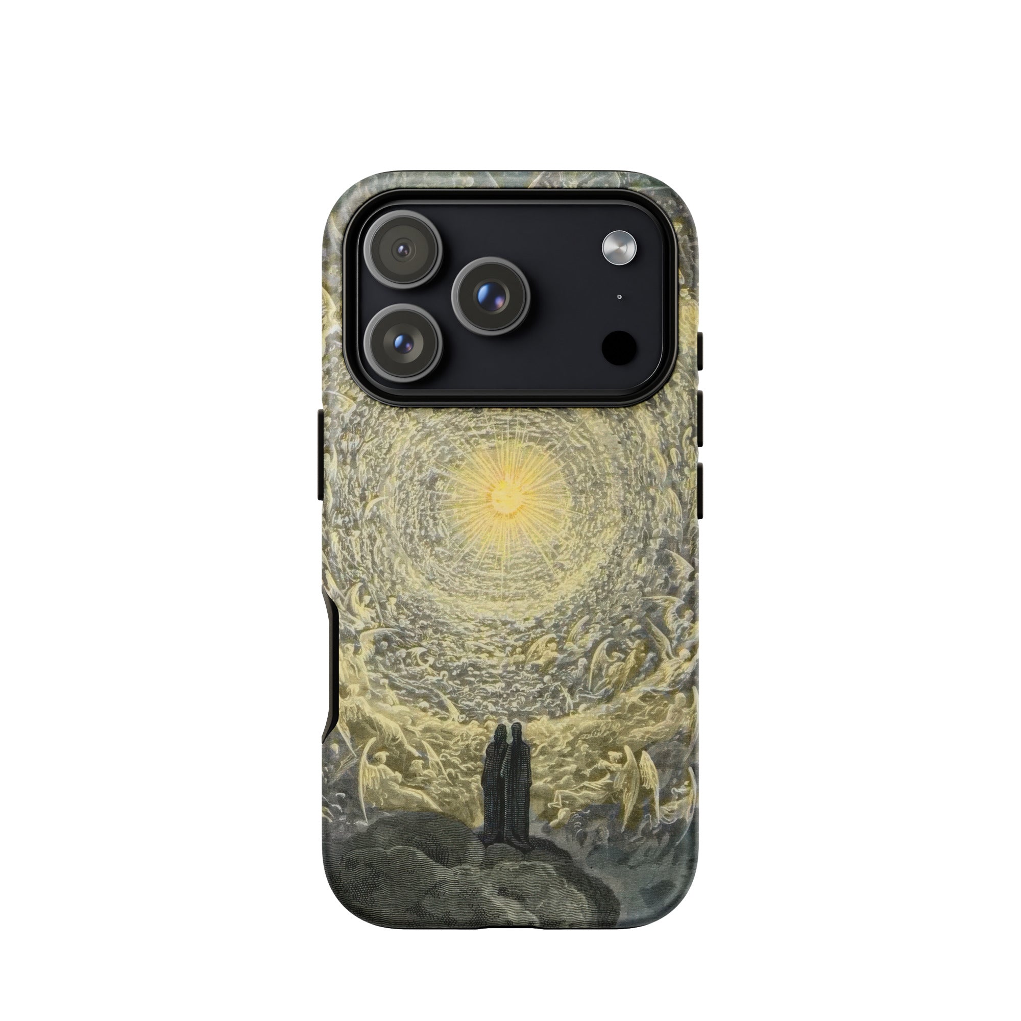 At the foot of this whirl, Dante and Beatrice gaze upward, their stillness countered by the motion of heaven itself. The engraving’s meticulous detail creates a vertigo of devotion, drawing the viewer into the gravitational pull of faith. On this iPhone case, eternity feels tactile, a portable portal into Doré’s most exalted plate from Paradiso.