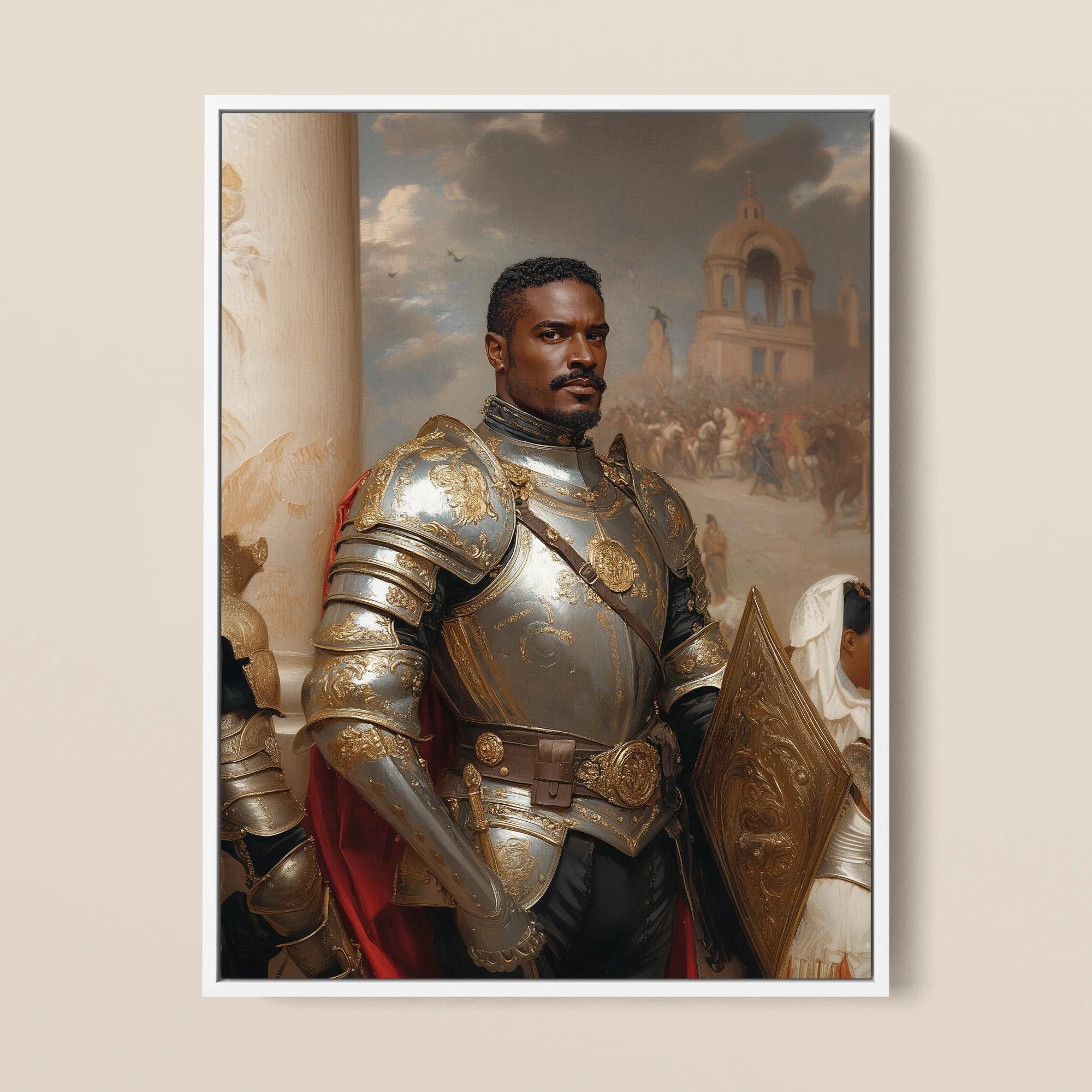 Here, the grandeur of Renaissance military portraiture collides with a radical reimagining of history. The polished baroque armor glows beneath an unseen sun, its engravings whispering of myth and might. Behind him, a city stirs—a crowd surges, an empire shifts. This is no passive relic of the past but a reclamation, a declaration: queer nobility immortalized in oil and gold.