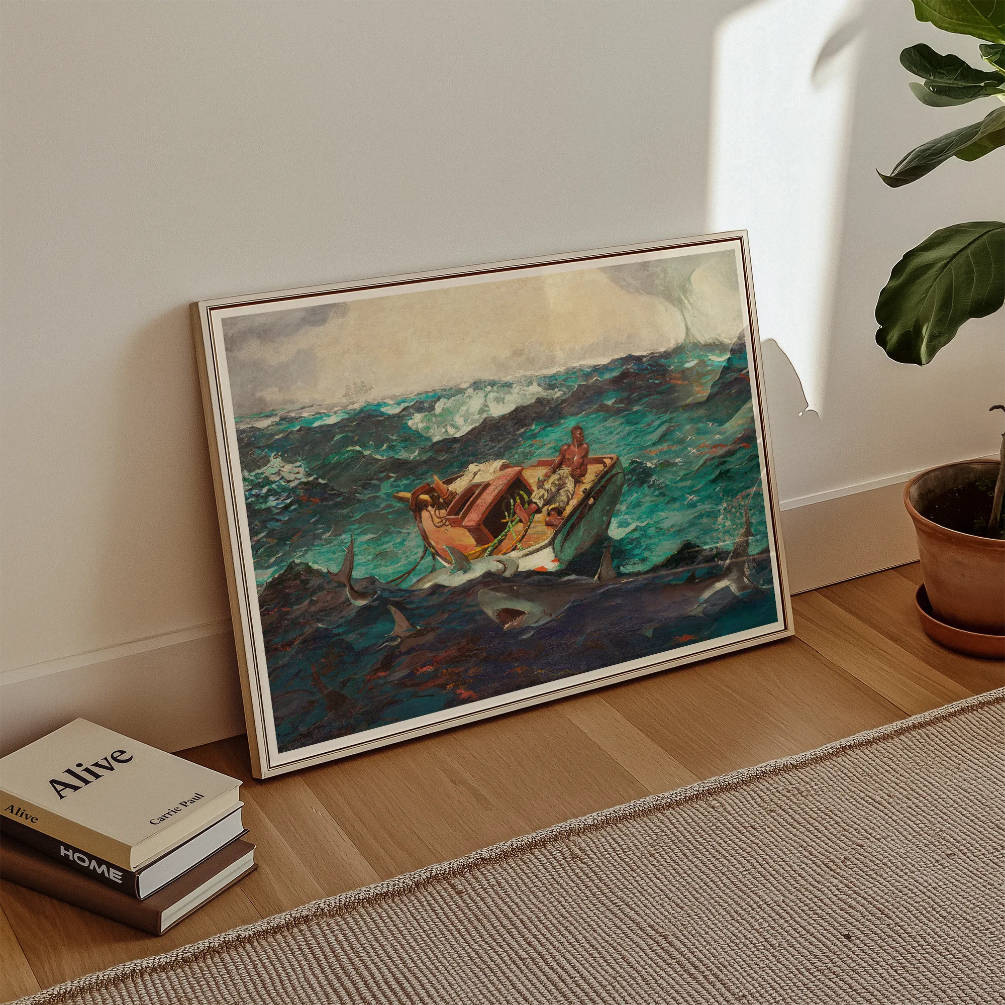 Dive into the tumultuous world of Winslow Homer's Gulf Stream with this mesmerizing fine art print. You'll be transported to a Caribbean maelstrom where turquoise waves clash with human resilience. Homer's masterful brushstrokes bring to life a scene of raw survival - a solitary Black sailor adrift on a battered vessel, circled by menacing sharks beneath an ominous waterspout.
