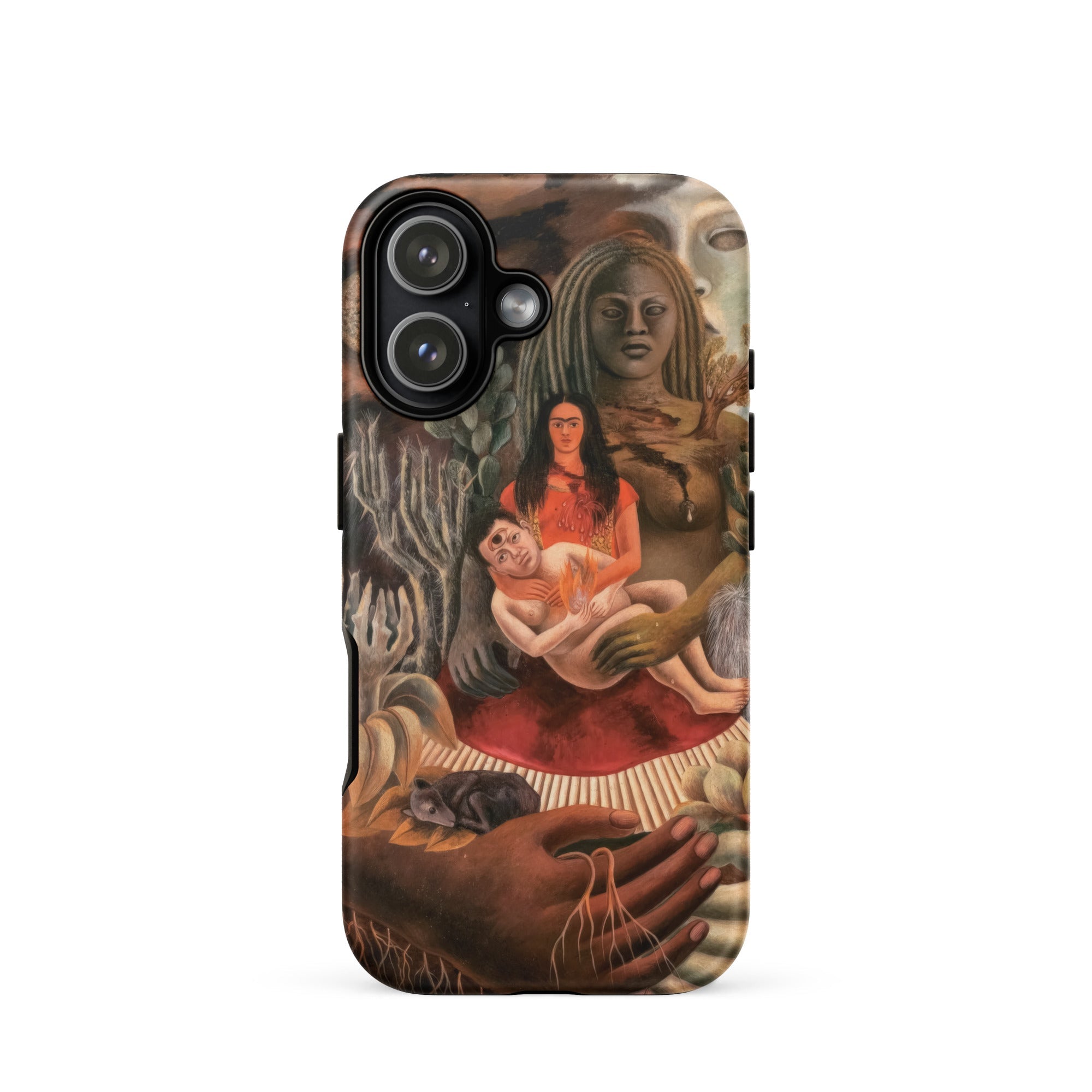 Frida Kahlo’s The Love Embrace of the Universe covers this iPhone case with fierce tenderness: the artist rendered in a crimson huipil, cradling Diego Rivera as an infant, their forms enveloped by colossal hands, cacti, earth tones, and a stoic maternal figure. Every contour trembles with her surrealist symbolism, rooted in pain, fertility, mortality, and devotion.