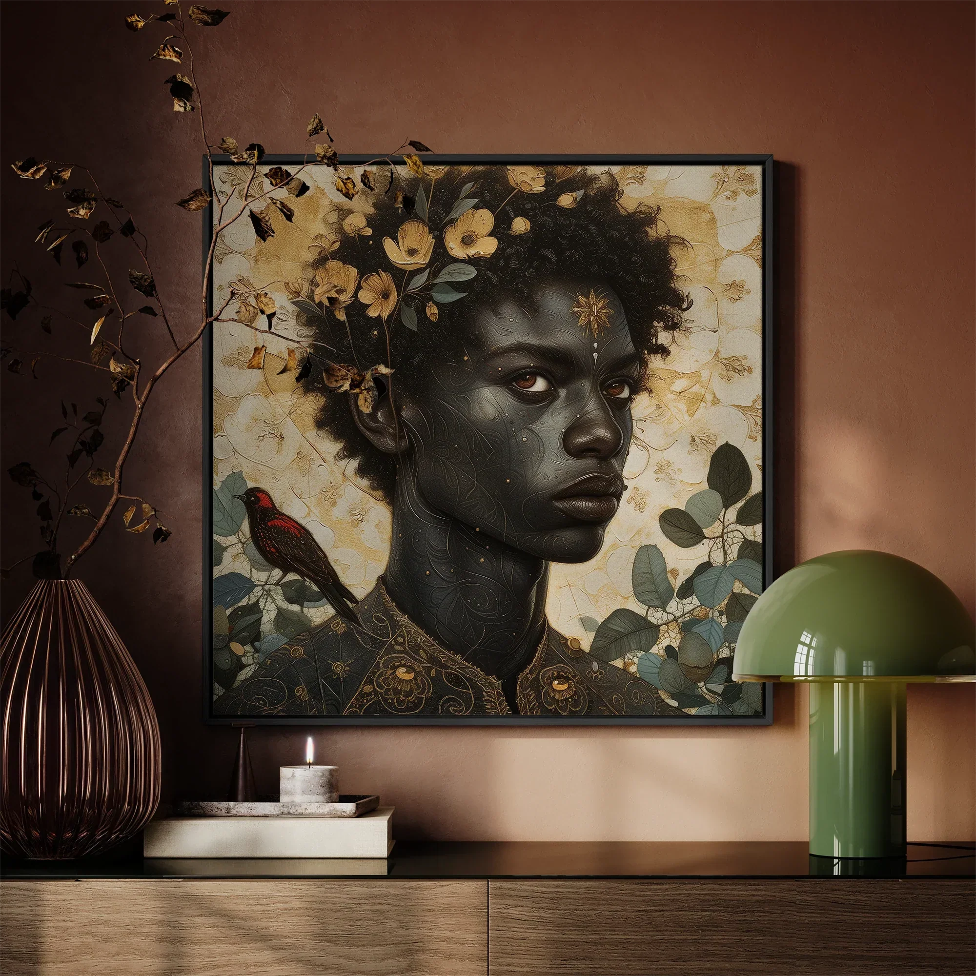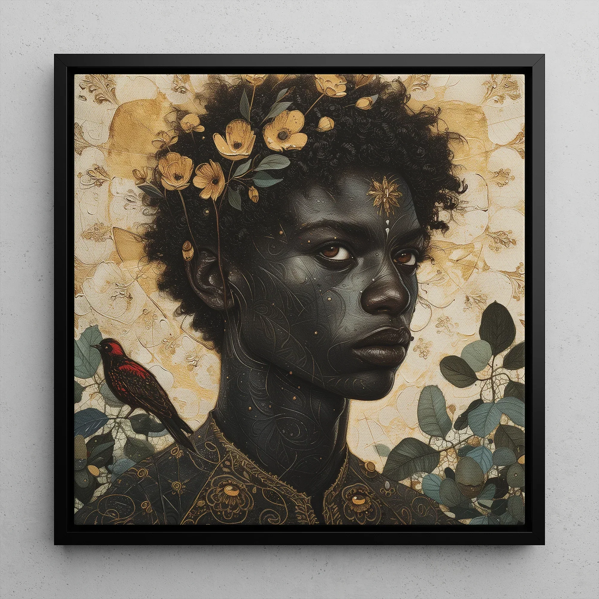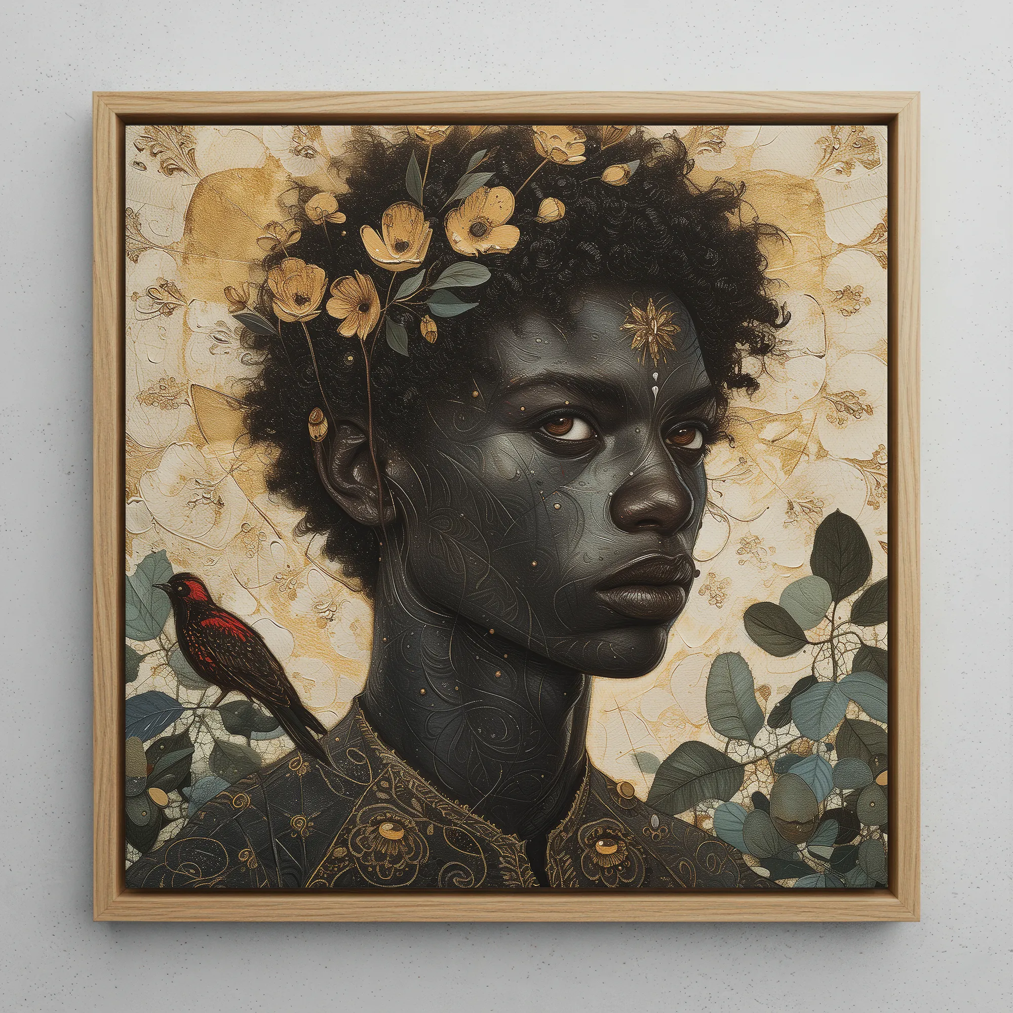 Flowers bloom from their hair, not as decoration, but as testament. Wild and ungoverned, they root themselves in divinity, proof that beauty and resilience are the same thing. The gold upon their brow pulses like a buried sun, like a power too great to dim. And then, the bird—a figure of quiet defiance. Red-feathered, watchful, perched at the threshold between seen and unseen. A witness. A companion. A mirror.