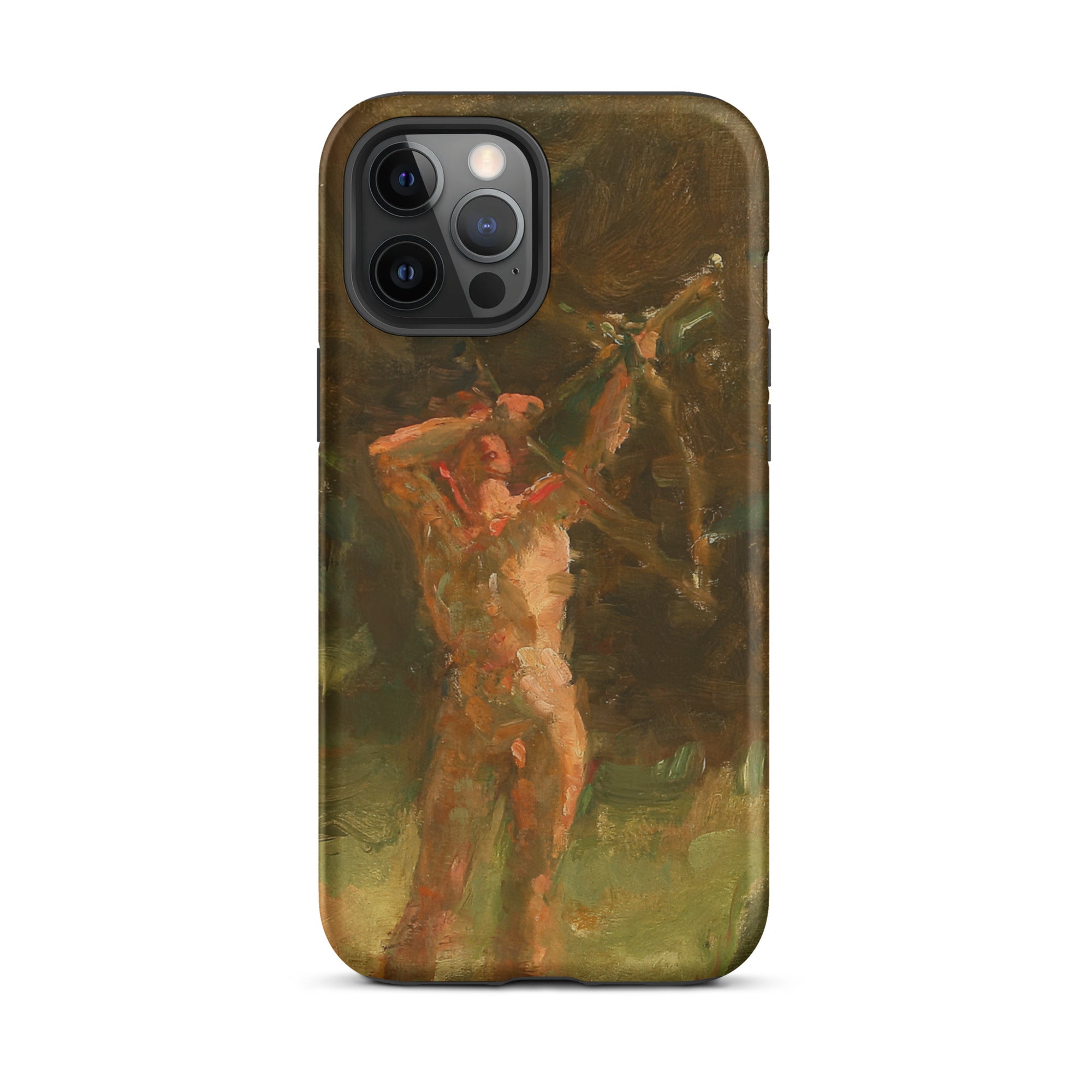 Julius Paulsen’s The Shooter ignites across this iPhone case with rough-hewn strokes of ochre, carmine, and olive shadow, shaping a nude male figure mid-draw with his bow.