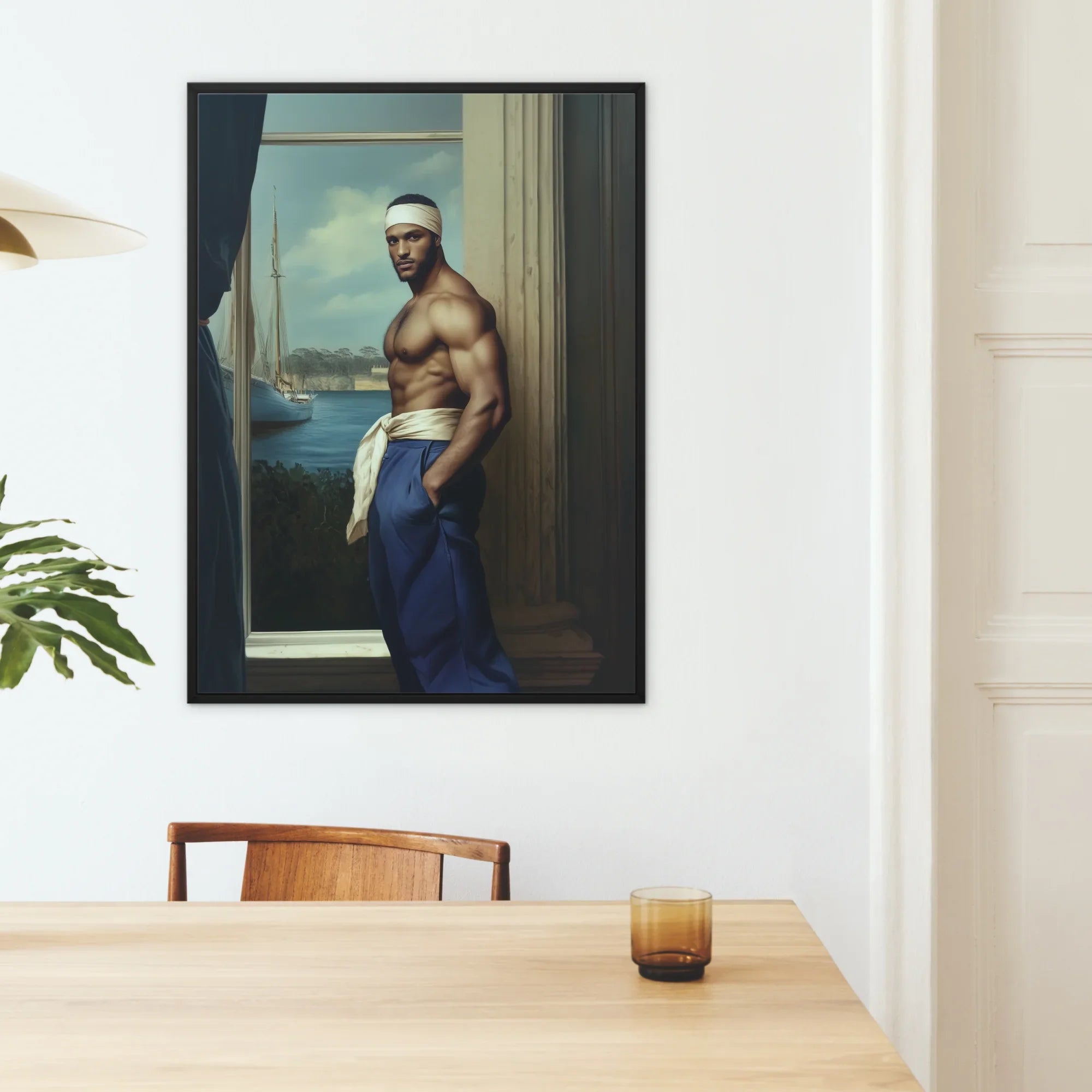 Through the grand window, the sea waits—restless, glimmering, forever calling. But he lingers. A black gay sea captain carved from labor and longing. Skin bronzed by salt and sun, his presence more myth than man. Wrapped in indigo fabric and the hush of something unsaid, he stands at the precipice of history, where Black masculinity meets the romance of the sea.