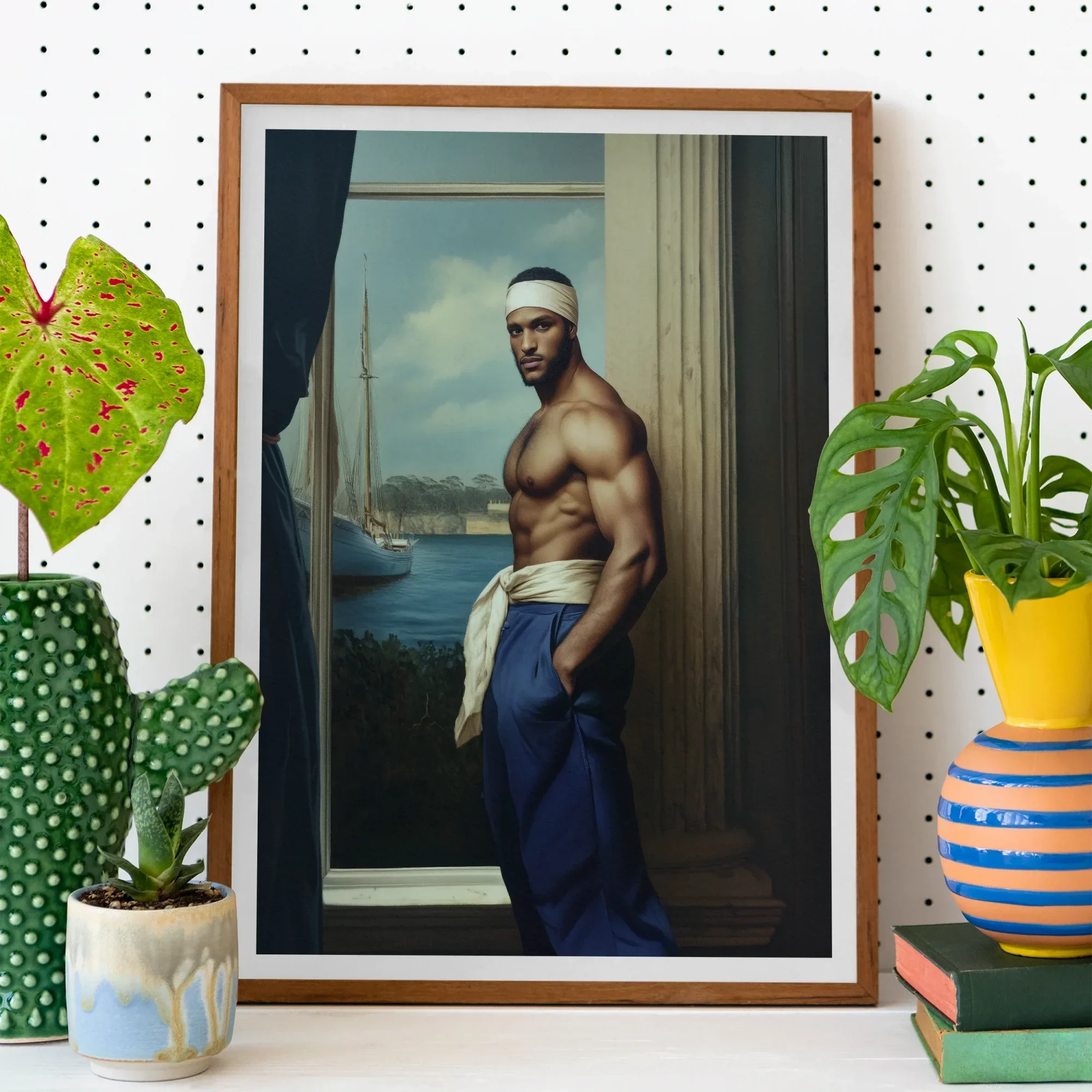 You're drawn into a world of sensual power and gay liberation. The Trade beckons, a Moorish sailor framed by history's window. His muscular form, an ode to masculine beauty, stands proudly against a backdrop of azure waters and billowing sails. This isn't just art—it's a window into homoerotic history made anew in this neoclassical fantasy.