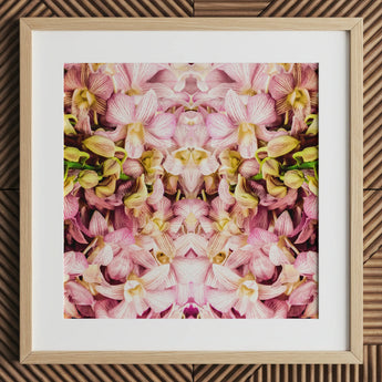 You'll be transported into a mesmerizing realm of floral fantasy with this kaleidoscopic orchid art print. Delicate petals unfurl in a hypnotic ballet, their blush and cream hues swirling in symmetrical splendor. Nature's elegance meets digital wizardry as mirrored segments create a portal to botanical bliss.