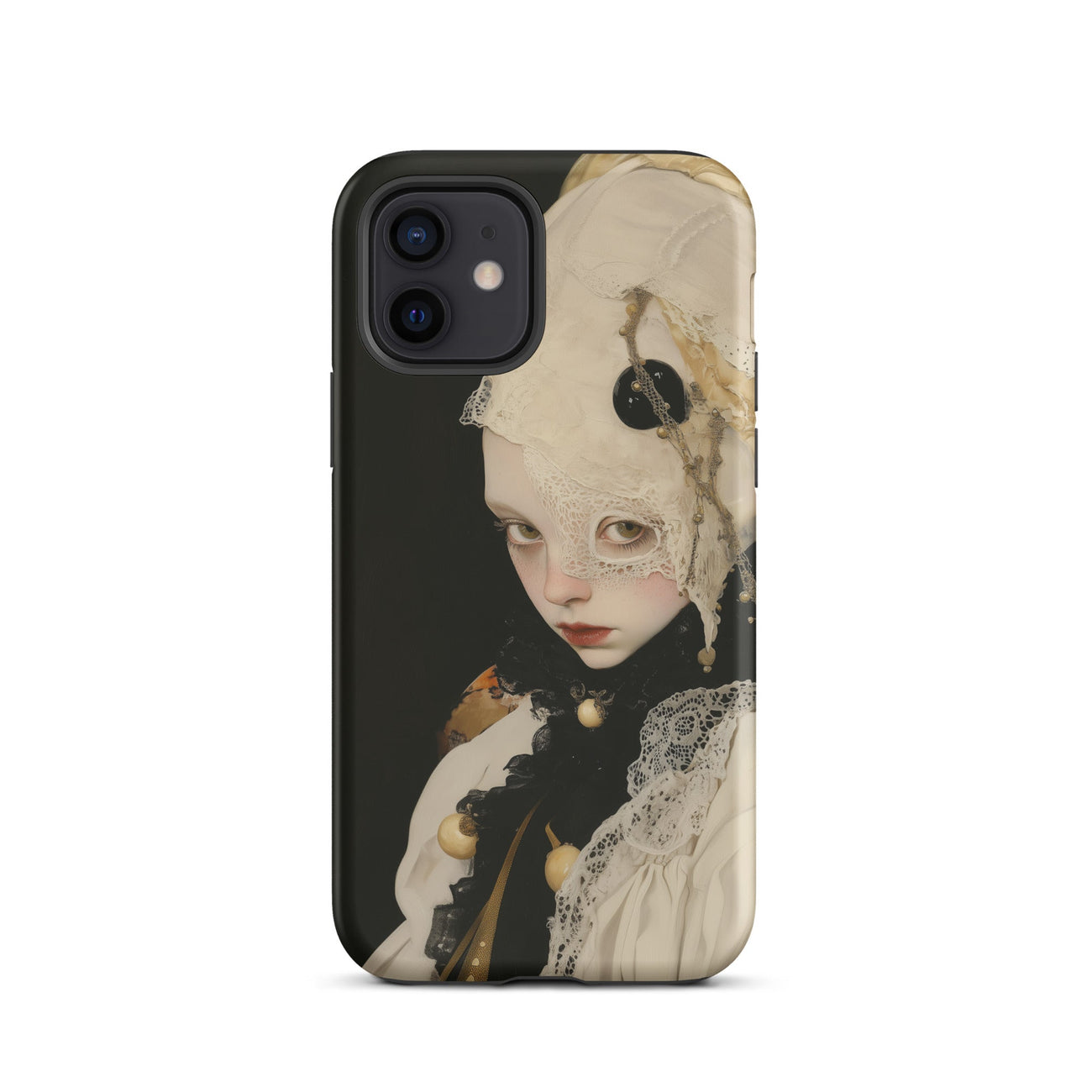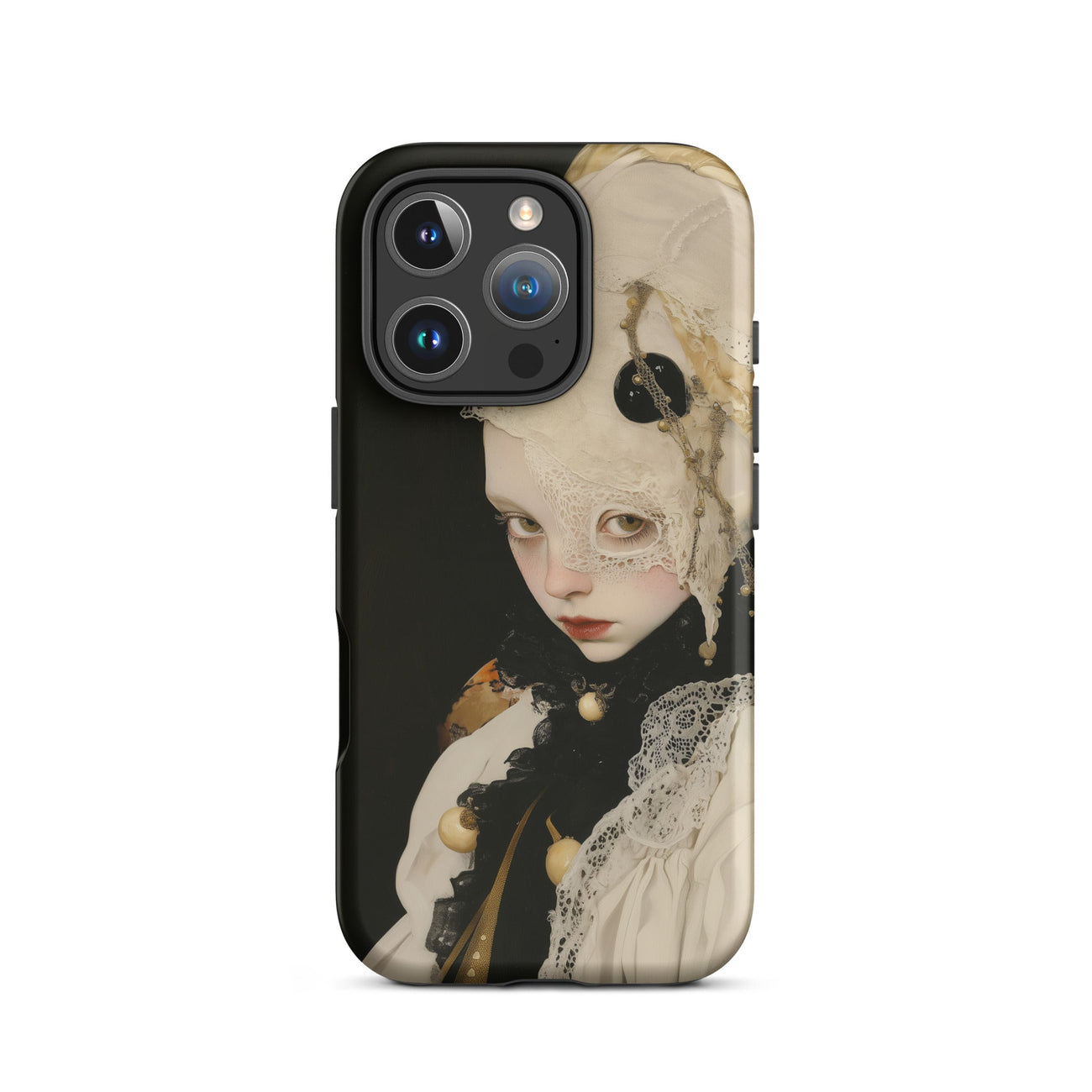 With Thomasin, you hold a portal in your hand—an iPhone case that connects you to a world where mysticism and gothic surrealism collide. Thomasin, the ethereal white witch, gazes out from the case with unsettling allure. Her eyes, half-shrouded by an intricate lace mask, seem to peer into your very soul, beckoning you into her world of forgotten rituals and arcane power.
