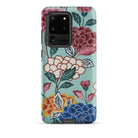On this Samsung case, the Bingata technique reveals itself in saturated pigments: crimson peonies layered with ivory petals, mustard-hued blossoms crowned by midnight blue leaves. Each motif sits against pale turquoise, echoing the breezes and waters of Okinawa, where resist-dye stencils first spread these florals across silk and cotton panels.