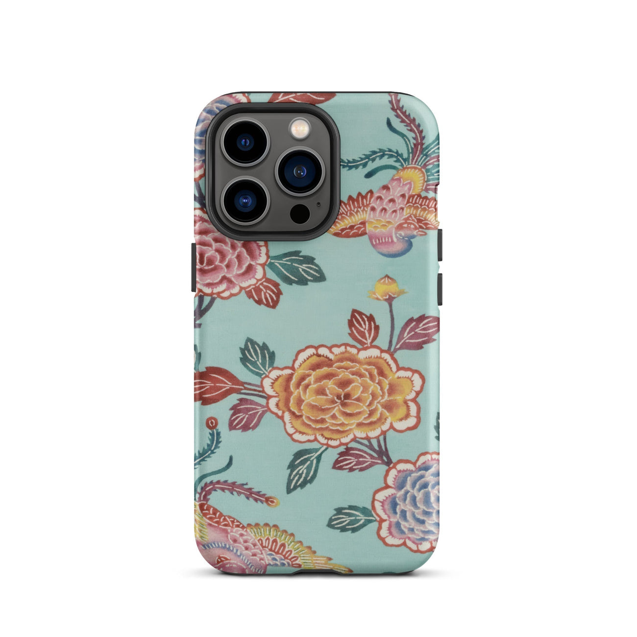 This iPhone case carries a fragment of Ryukyu heritage: hand-dyed bingata cloth where tree peonies bloom against cool celadon. Each flower unfurls in layered pigment—ochre, persimmon, coral, and mauve—outlined in cinnabar ink, echoing centuries of stencil craft. Between the blossoms, stylized peacocks stretch their patterned plumage, a symbol of dignity and longevity in Okinawan art.