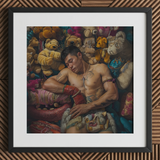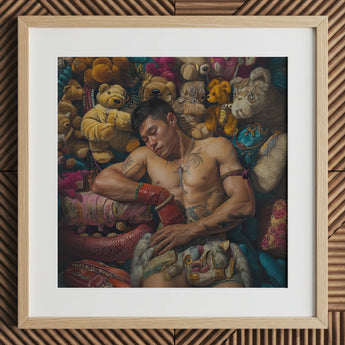 This isn’t just an art print. This tattooed Gaysian man becomes a reflection of the punk rebellion of queer culture's underbelly. Caught in a moment of quiet, surrounded by symbols of innocence, this scene is equal parts dreamlike and provocative. Made for gay folks who revel in the power of queer mischief and subversion.