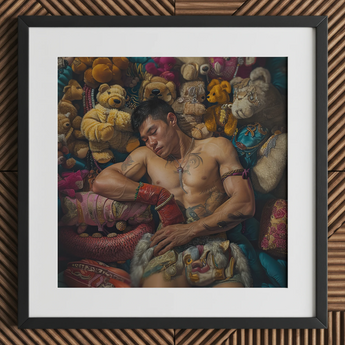 Eyes closed, he drifts into a serene moment, unaware that his slumber is both an invitation and a rebellion. Nestled among a sea of vibrant stuffed toys, this tattooed gaysian impresario becomes a surreal centerpiece. His limp, red-gloved hand charged with the power of a performer caught between acts. Every inch of his skin, decorated with trashy tattoos, tells a story of punk sensuality. Blurring the lines between lowbrow aesthetics and a homoerotic tableau.