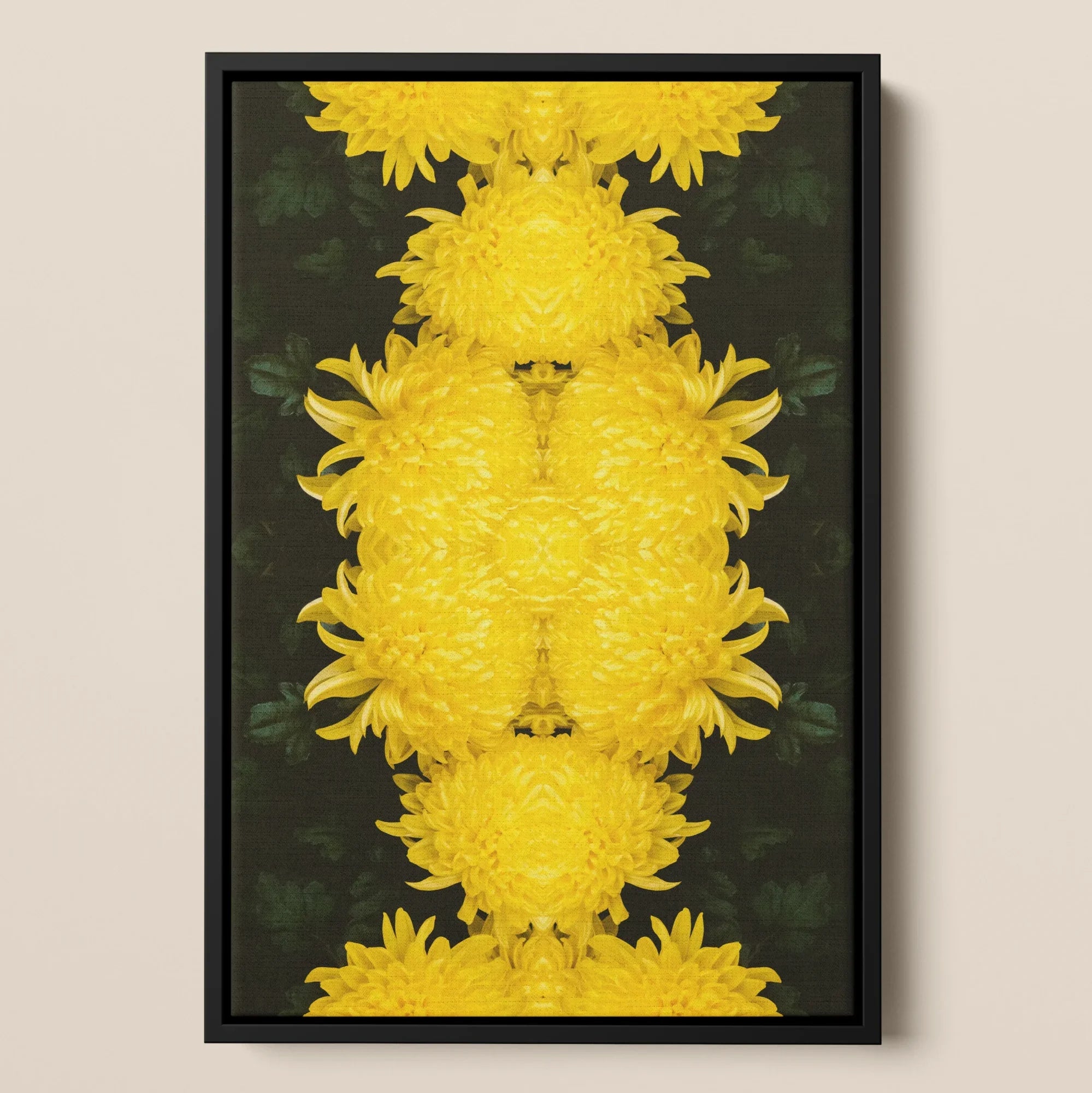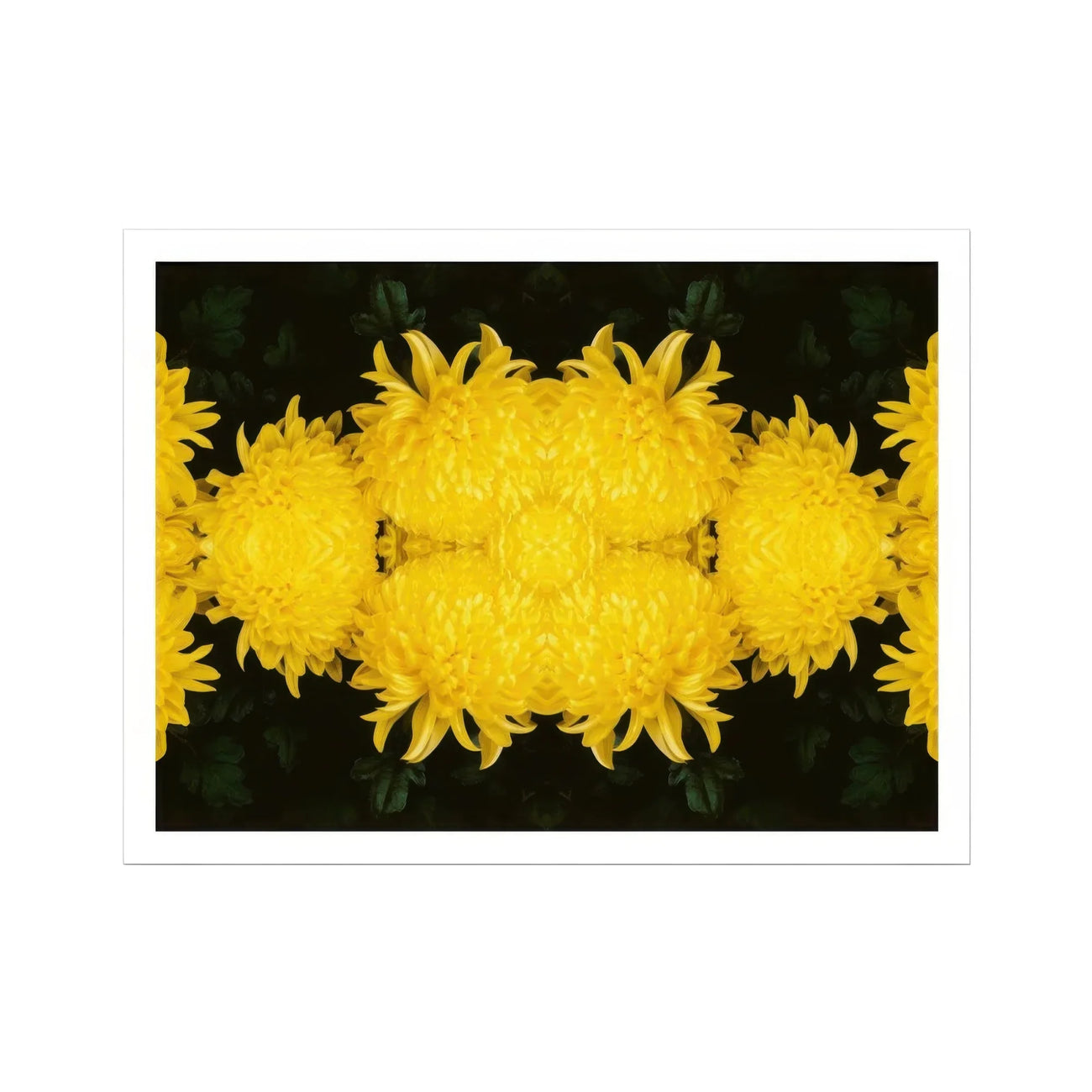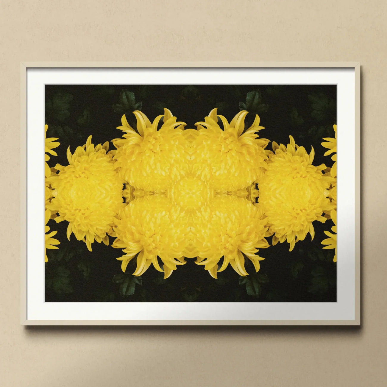 This avant-garde print will transform your space into a botanical dreamscape. You'll be mesmerized by the symmetrical dance of golden chrysanthemums, their petals unfurling against an enigmatic ebony backdrop. The horizontal composition creates a floral Rorschach, inviting endless interpretation.