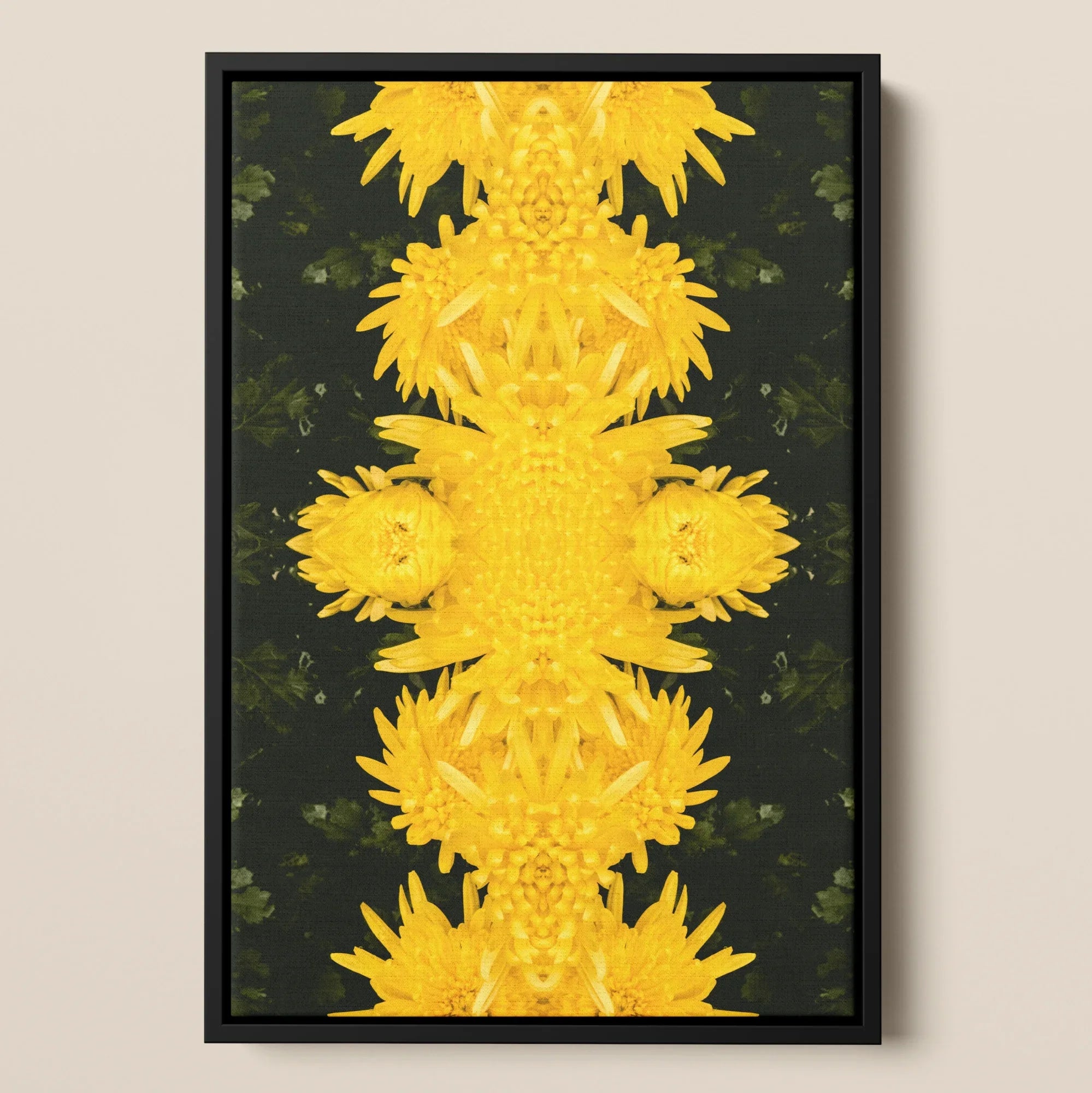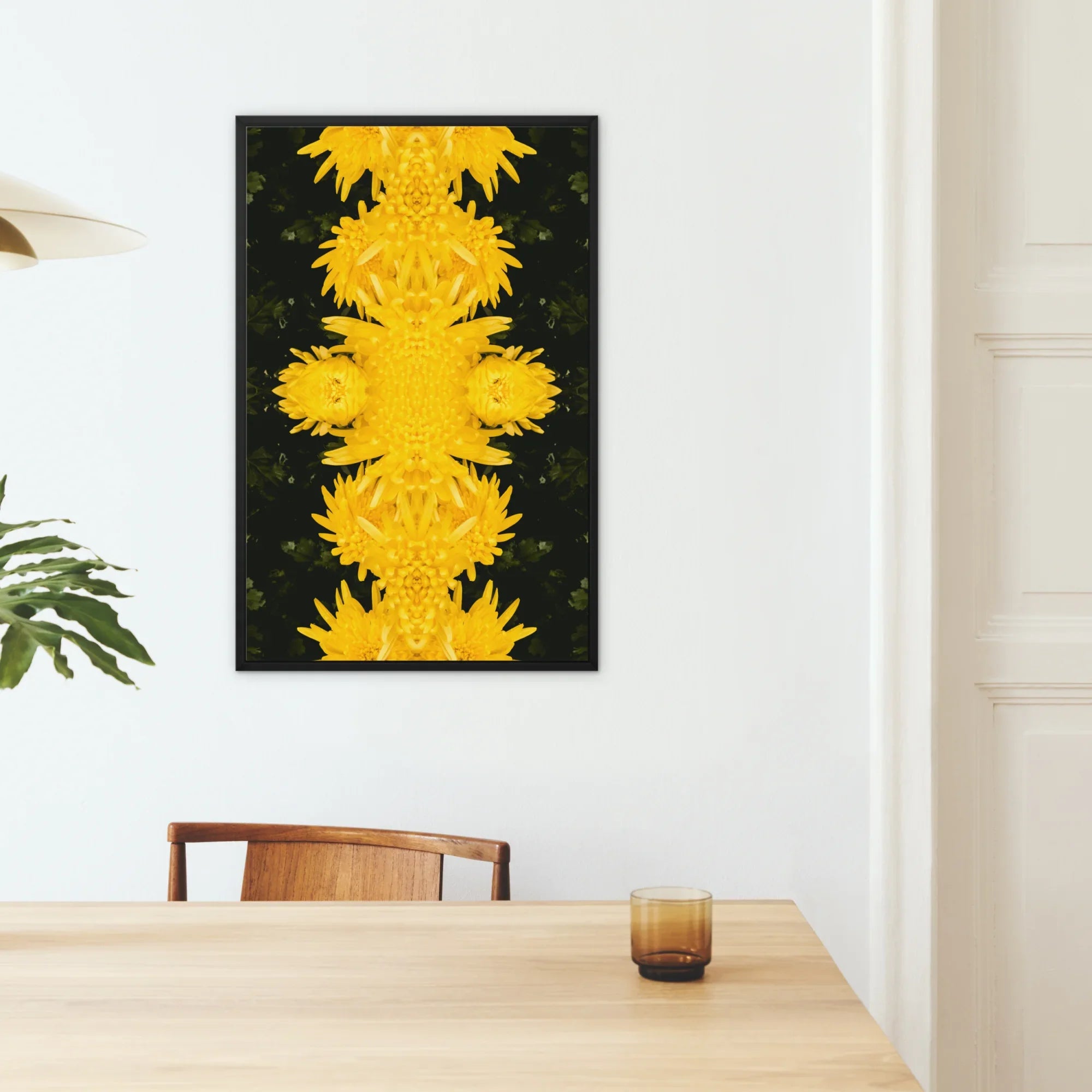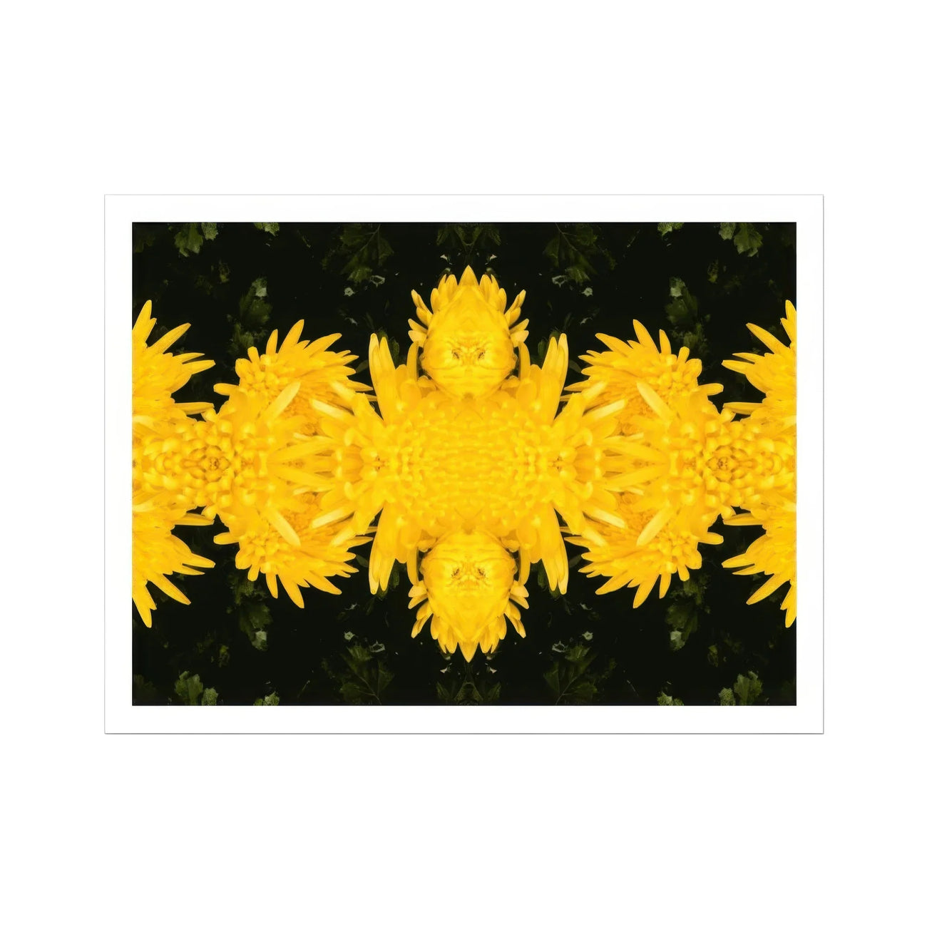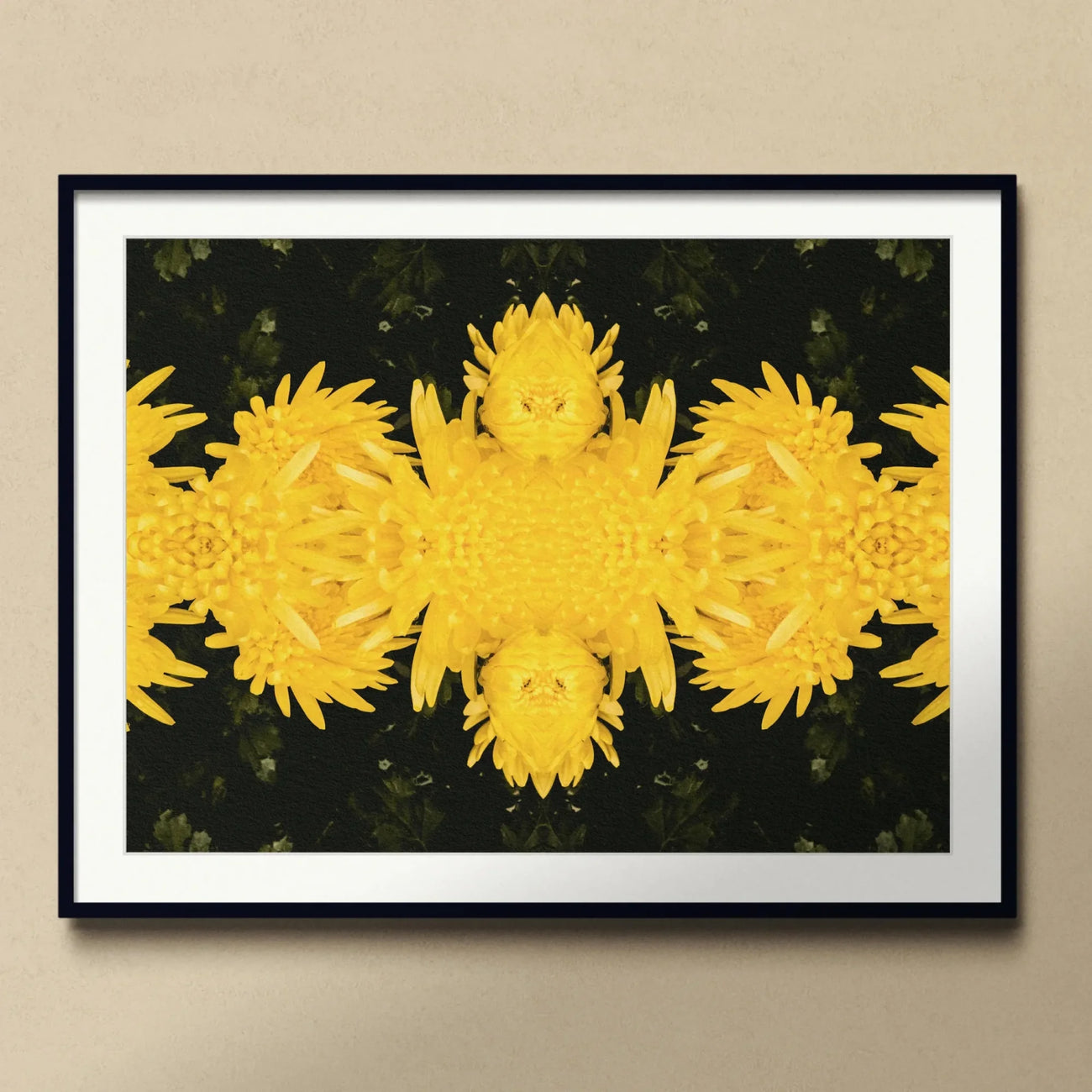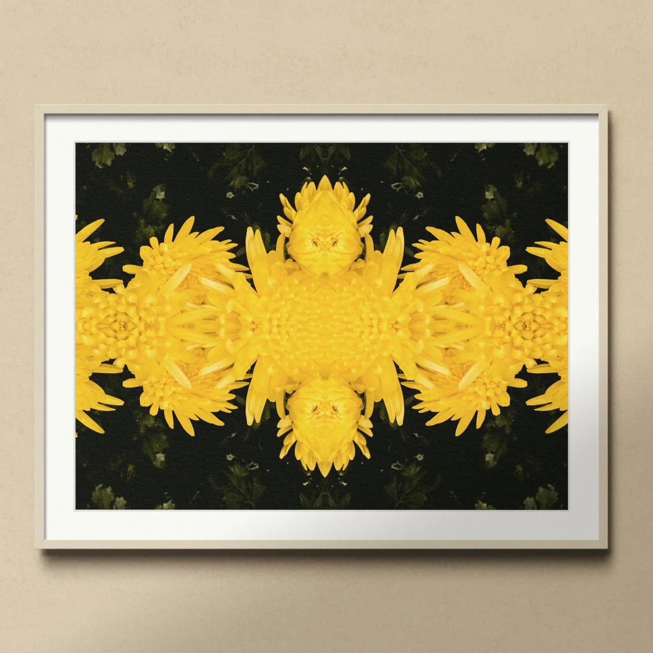 You'll be captivated by this avant-garde chrysanthemum print, where nature's golden blooms pirouette in digital splendor. Mirrored petals unfurl with fractal precision, creating a symmetrical sunburst against an inky void. The incandescent yellow hues will electrify your walls, their radiance rivaling a summer solstice.