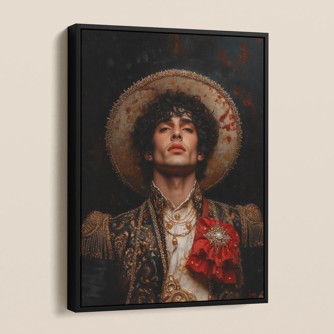 Smoke curls in unseen alleyways, the hush before a spectacle, the breath before a reckoning. Victor is not a matador—he is a revolution stitched in gold, a gay Spanish art icon carved from defiance. His stare—piercing, immutable—challenges the weight of tradition itself, casting aside the brittle armor of expectation. This is queer baroque portraiture, not of conquest, but of reclamation.