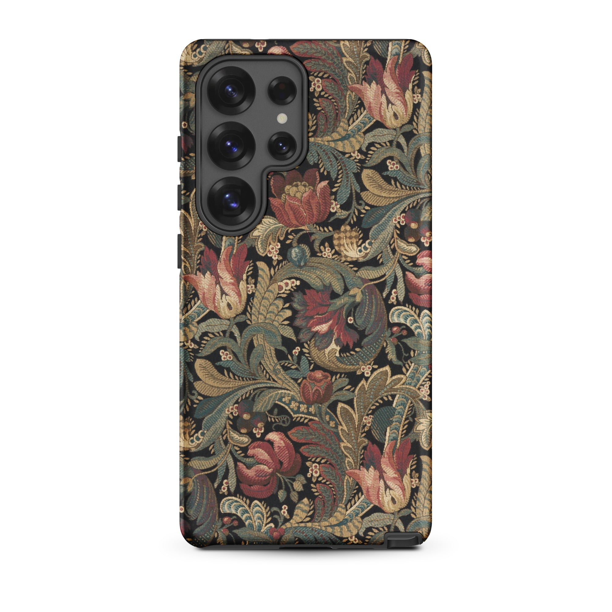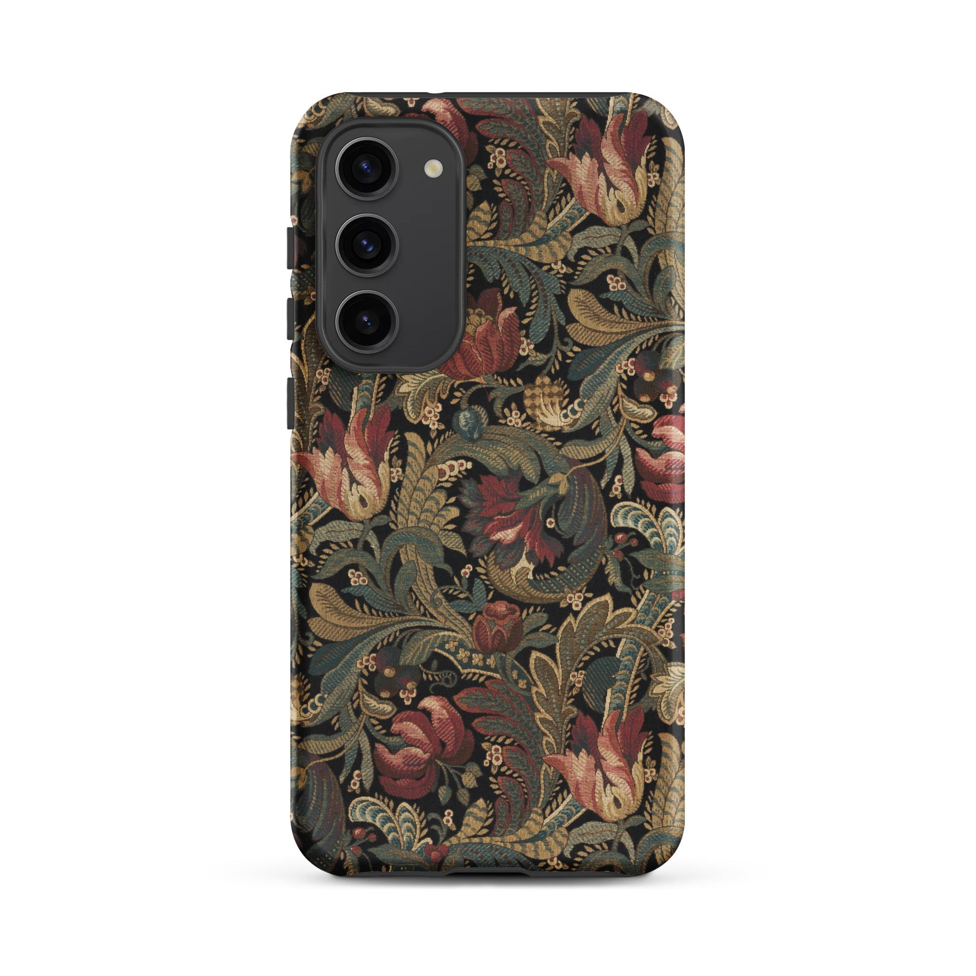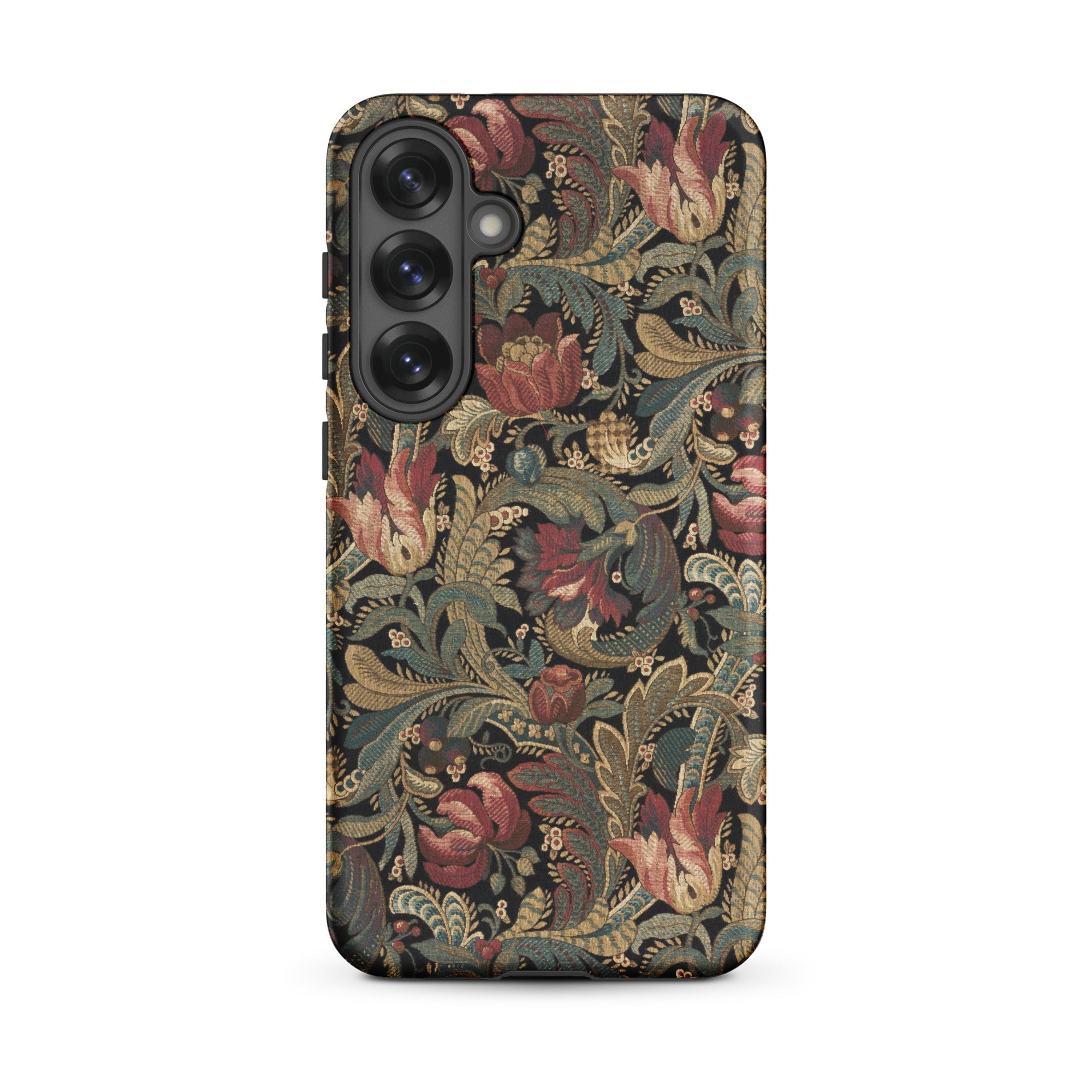 Jacobean crewelwork blooms across this vintage floral pattern Samsung case, where burgundy-crimson tulips unfurl beside dusty rose peonies against charcoal darkness. Sage-olive acanthus leaves spiral through antique gold-tan stems, their serrated edges recalling seventeenth-century English embroidery traditions born in manor houses and merchant parlors.