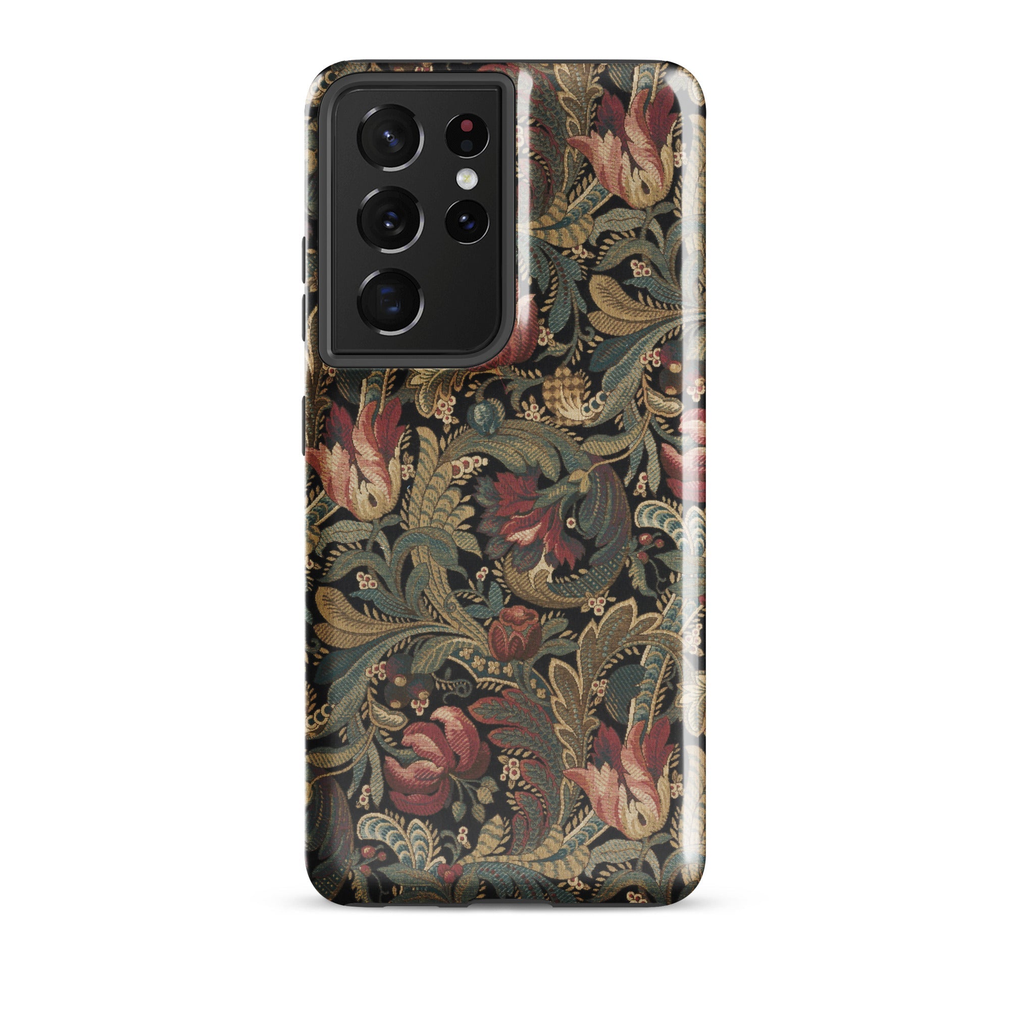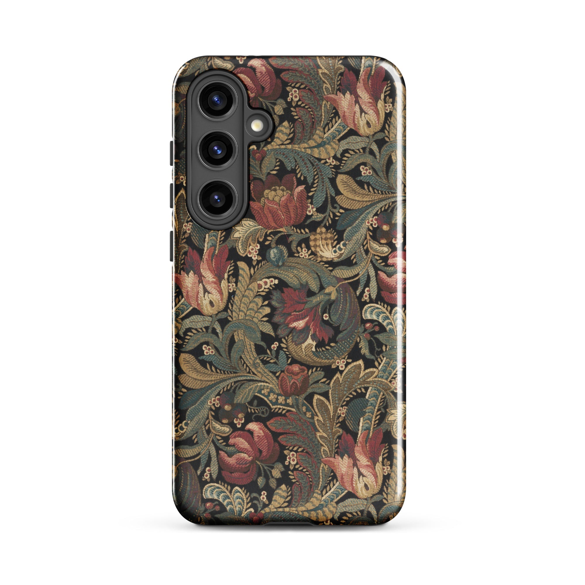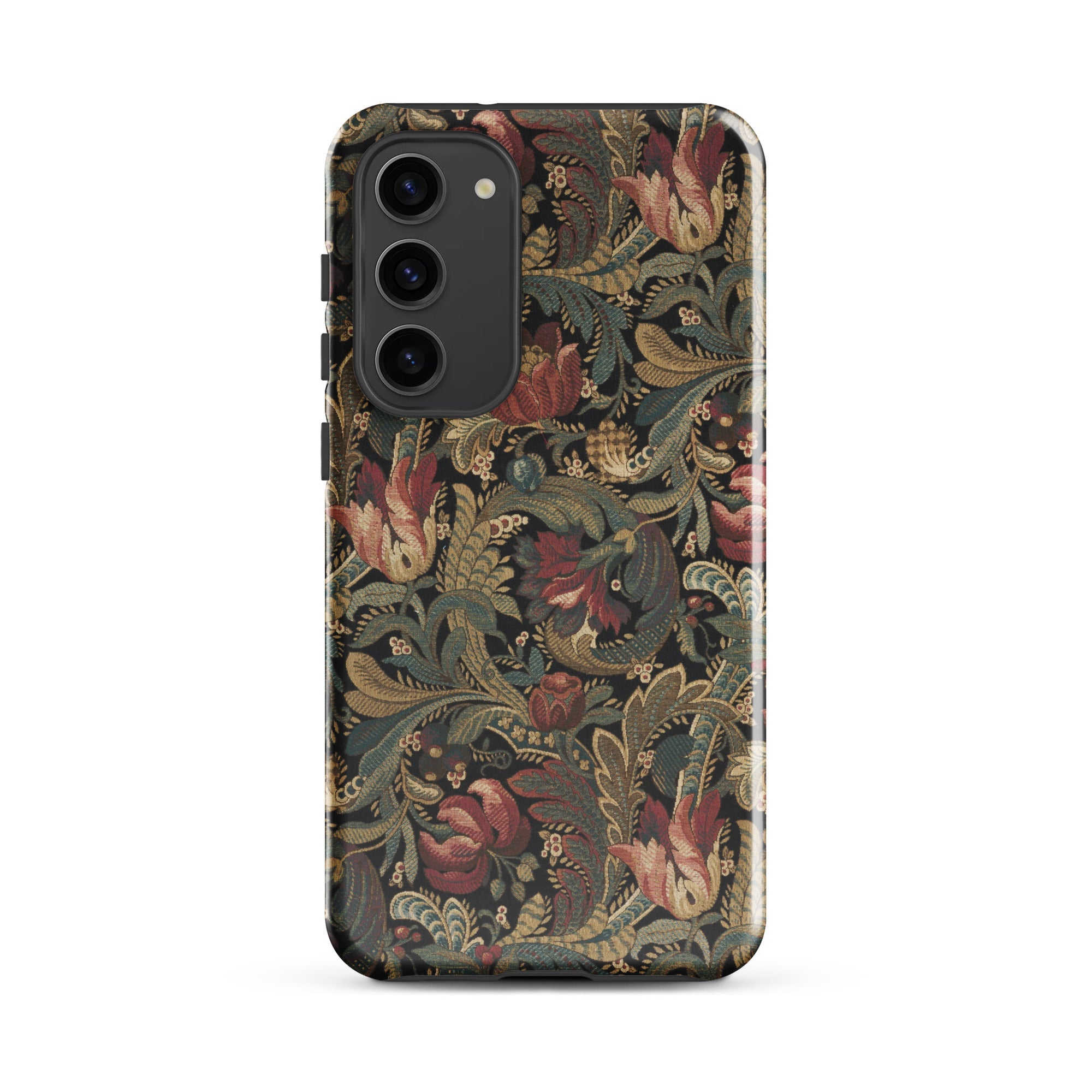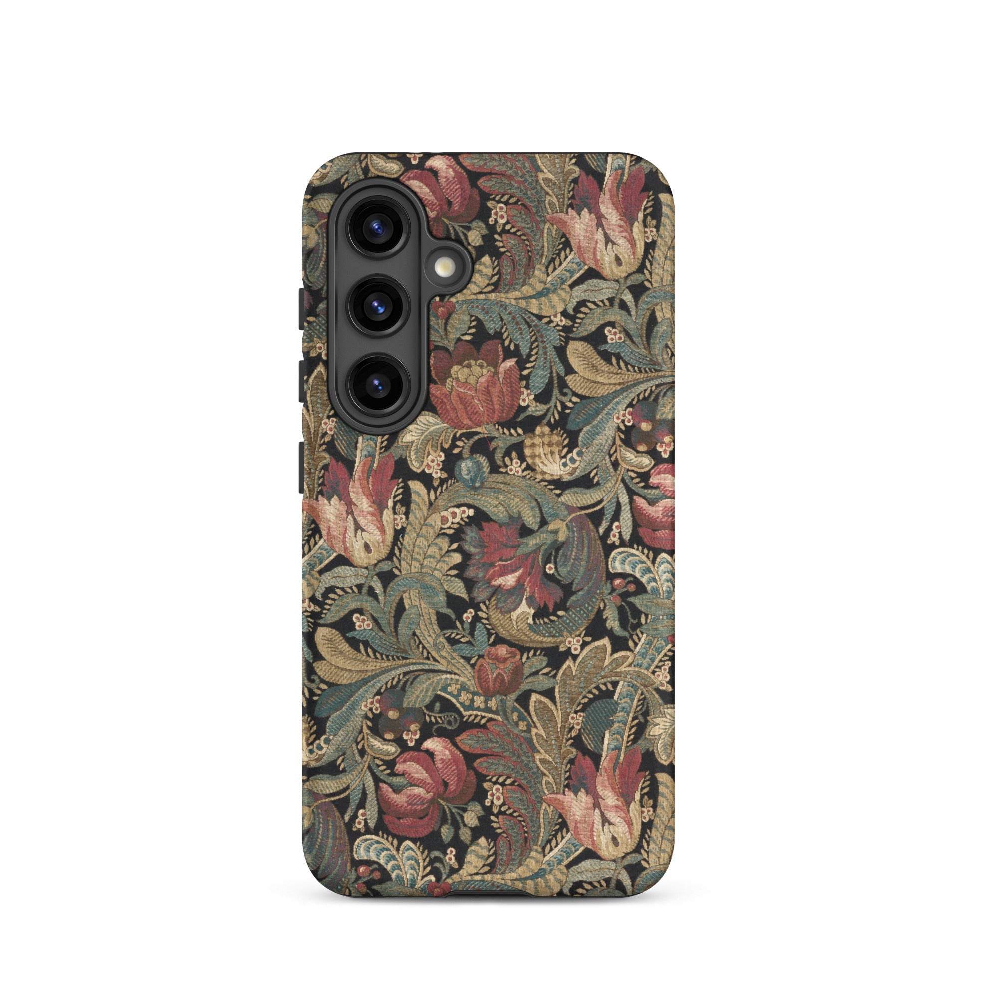 Jacobean crewelwork blooms across this vintage floral pattern Samsung case, where burgundy-crimson tulips unfurl beside dusty rose peonies against charcoal darkness. Sage-olive acanthus leaves spiral through antique gold-tan stems, their serrated edges recalling seventeenth-century English embroidery traditions born in manor houses and merchant parlors.