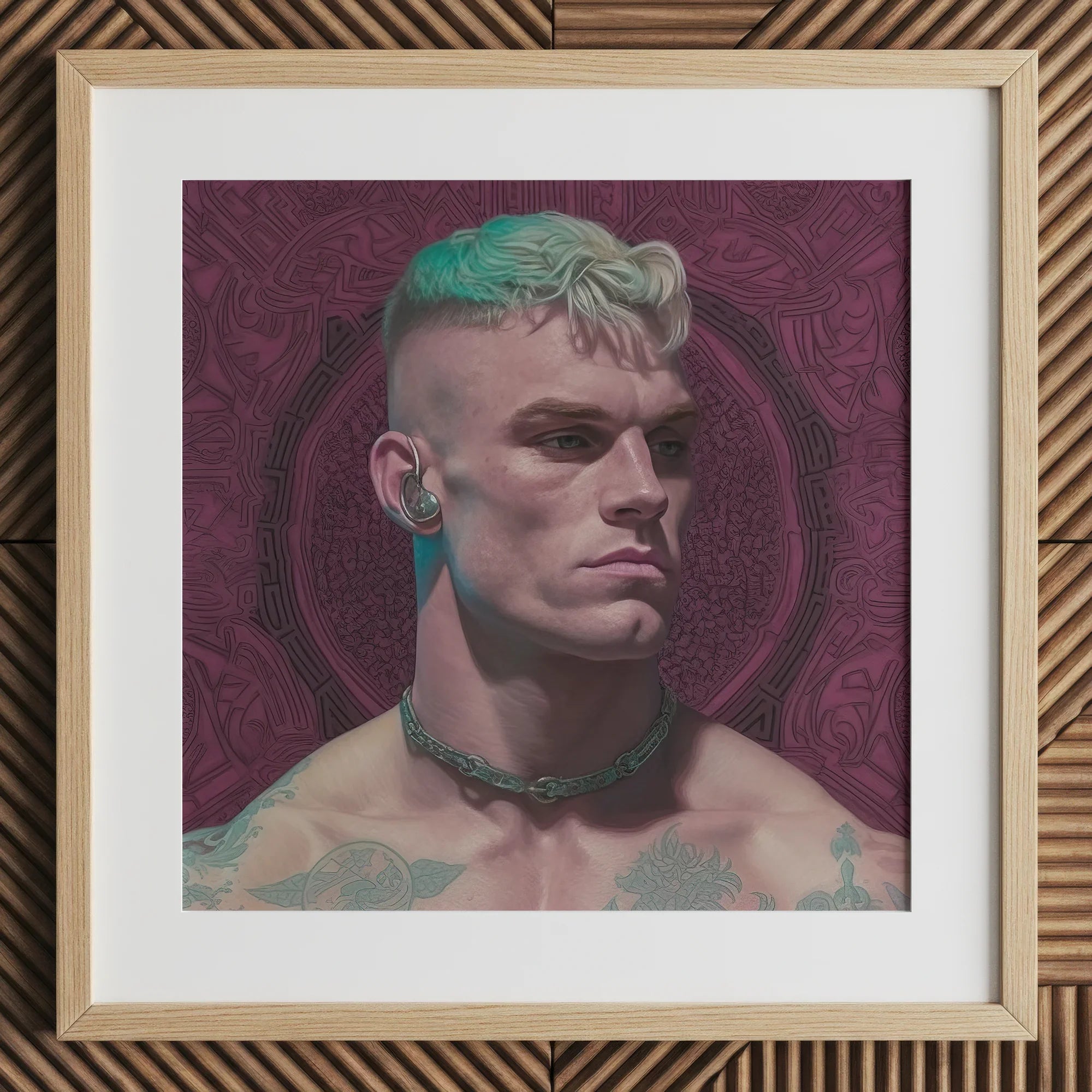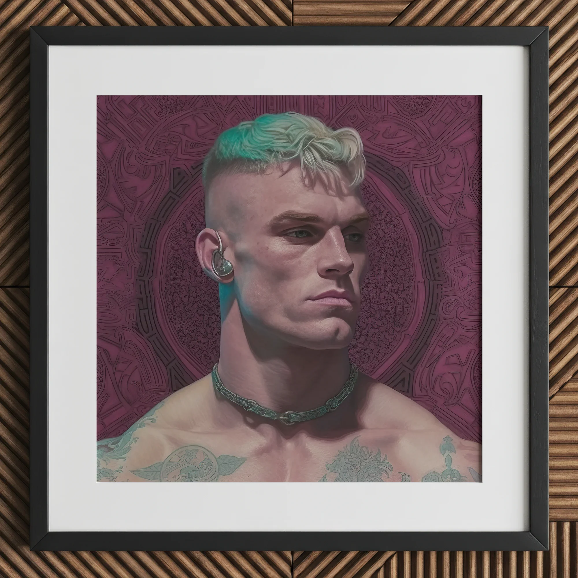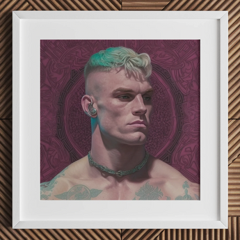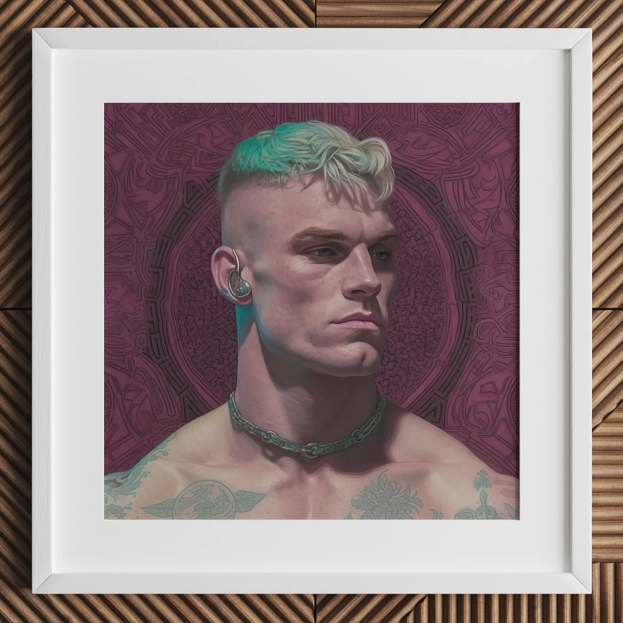 This striking portrait print captures the essence of gay cyberpunk aesthetics, blending traditional portraiture with futuristic elements.