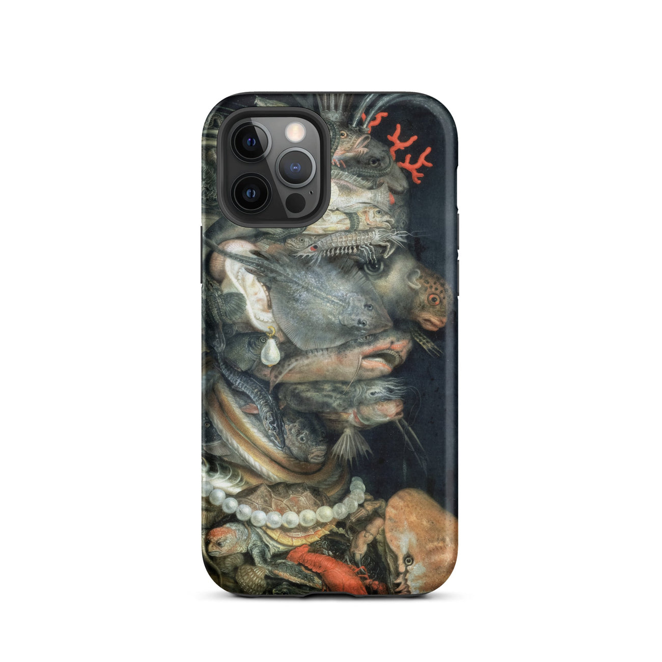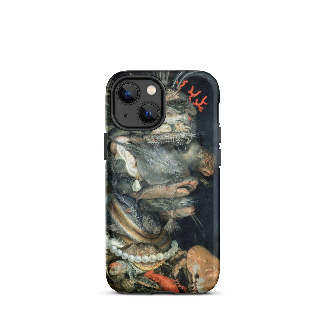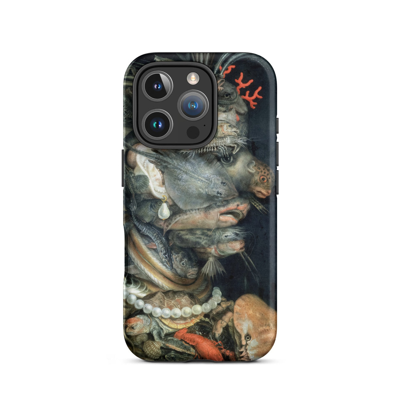 Arcimboldo’s Water swells across this iPhone case in a tide of uncanny harmony, each creature stacked into a profile that startles the eye. Scales glisten like armor, pearl strands curve against turtle shell, a coral sprig rises as ornament. Catfish, lobster, and flounder twist into anatomy, creating a visage both grotesque and enthralling.