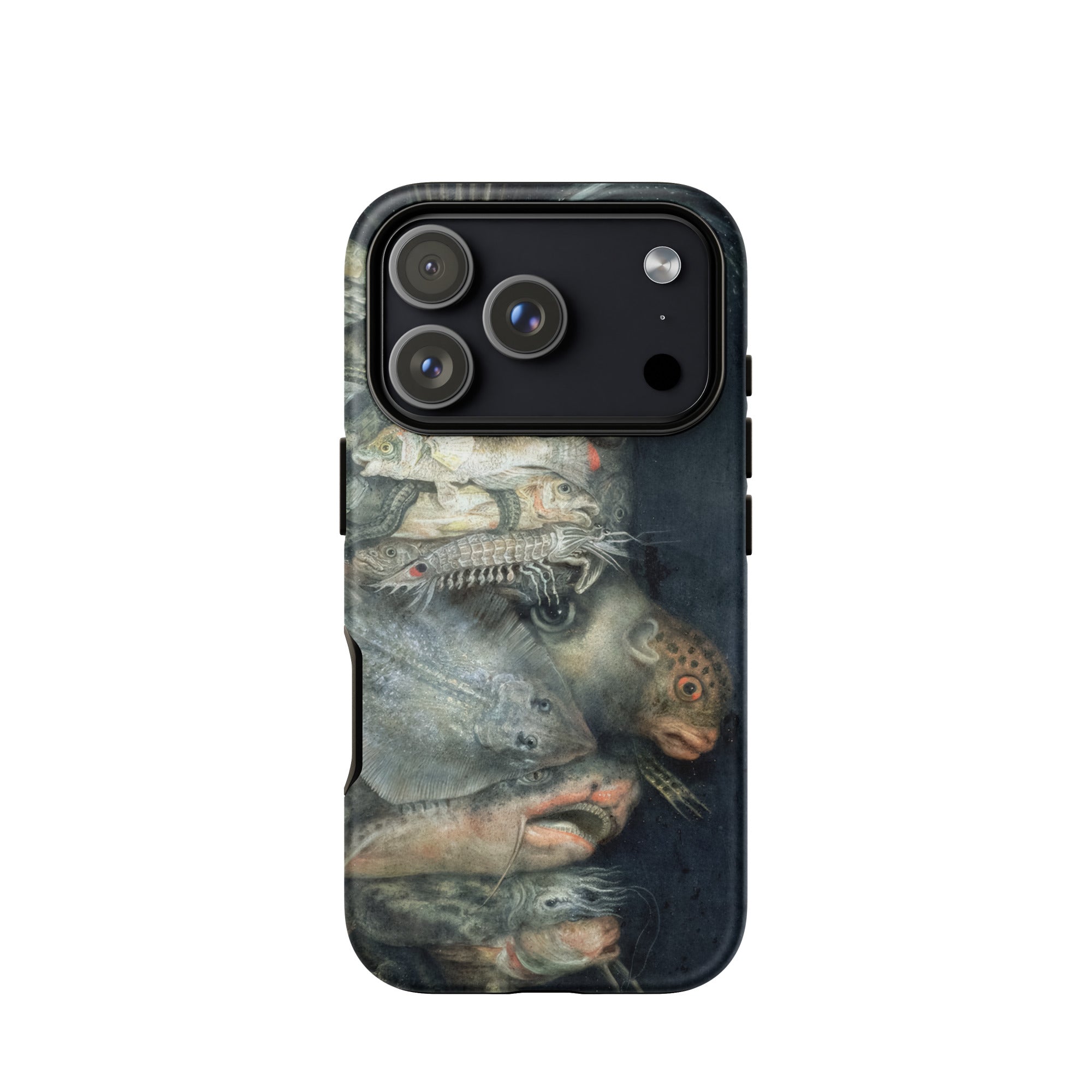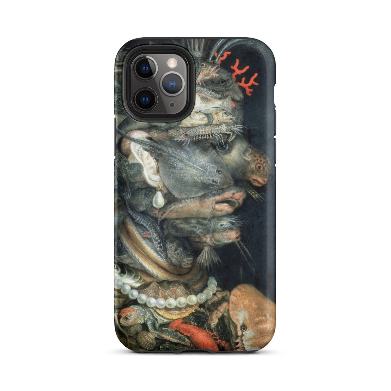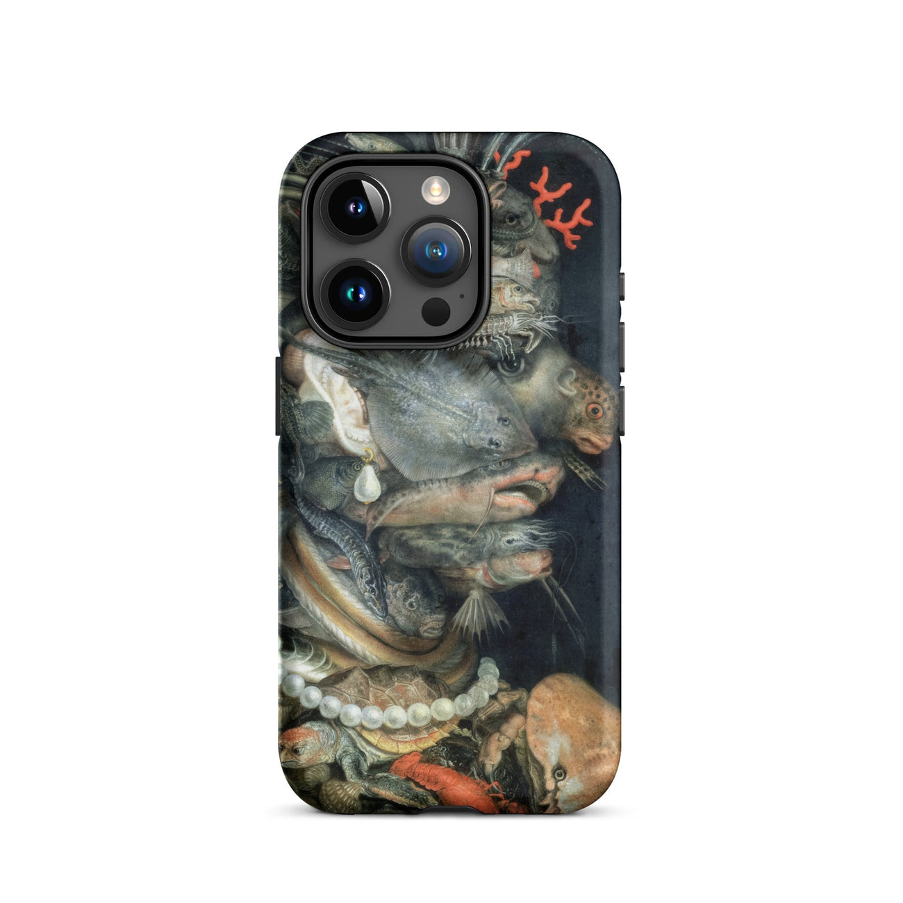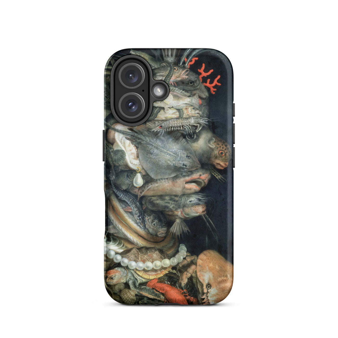 Arcimboldo’s Water swells across this iPhone case in a tide of uncanny harmony, each creature stacked into a profile that startles the eye. Scales glisten like armor, pearl strands curve against turtle shell, a coral sprig rises as ornament. Catfish, lobster, and flounder twist into anatomy, creating a visage both grotesque and enthralling.