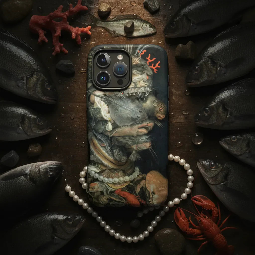Painted in 1566 for Emperor Maximilian II, this allegorical portrait fused natural history with mannerist imagination, embodying Renaissance fascination with cataloging species. The iPhone case carries that eccentric curiosity, transforming shell, claw, fin, and bone into a living taxonomy, a portable cabinet of wonders that confronts you with the strangeness of water’s abundance.