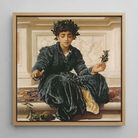 In Weaving the Wreath, Frederic Leighton's canvas unfurls a Hellenic reverie where mortal craft ascends to Olympian grace. Our garland-weaver, brow kissed by Daphne's legacy, sits enthroned in velvet splendor, his nimble digits dancing a silent paean to Flora's bounty. Beneath him, a dreamscape blooms in woven glory, while behind, stone guardians of antiquity stand sentinel.