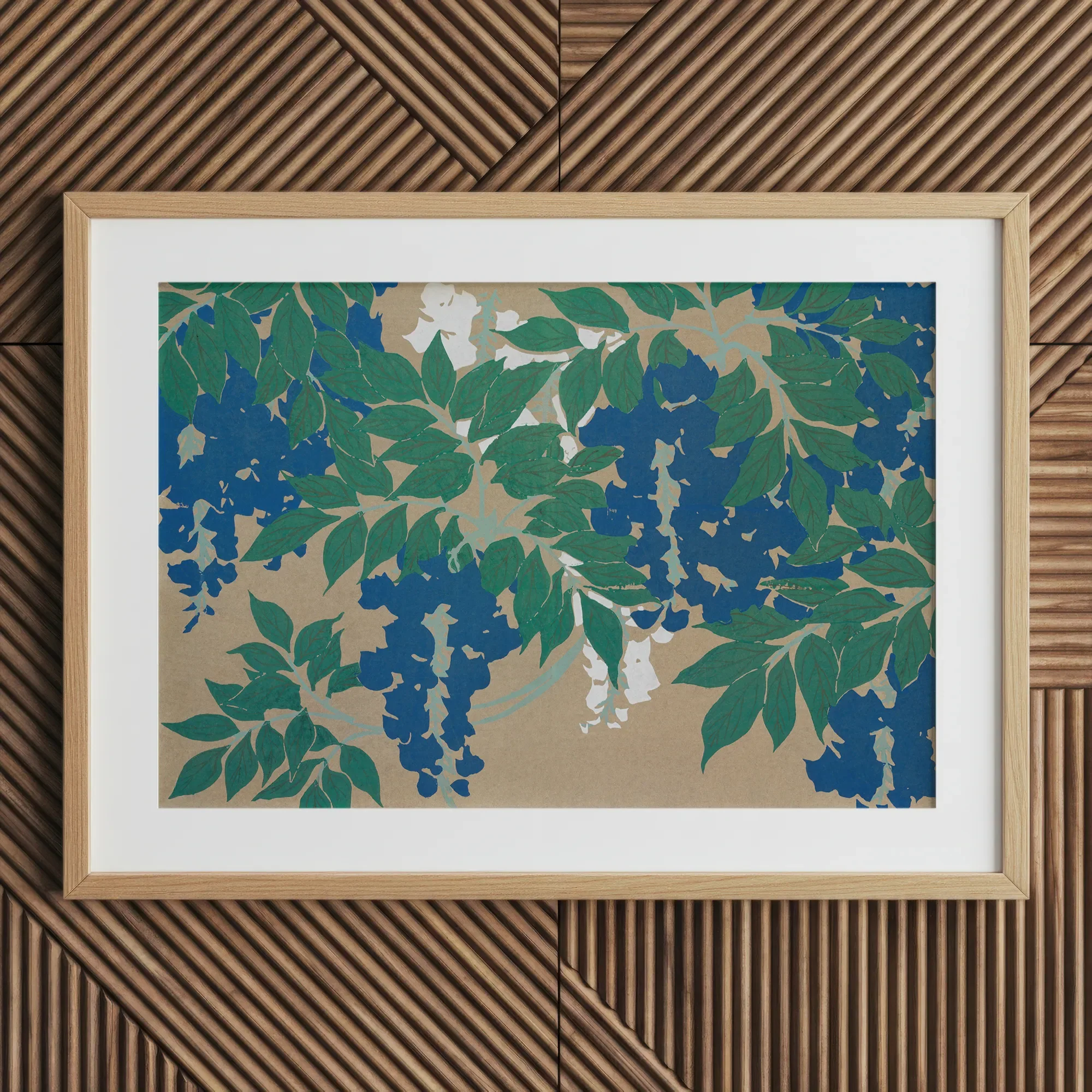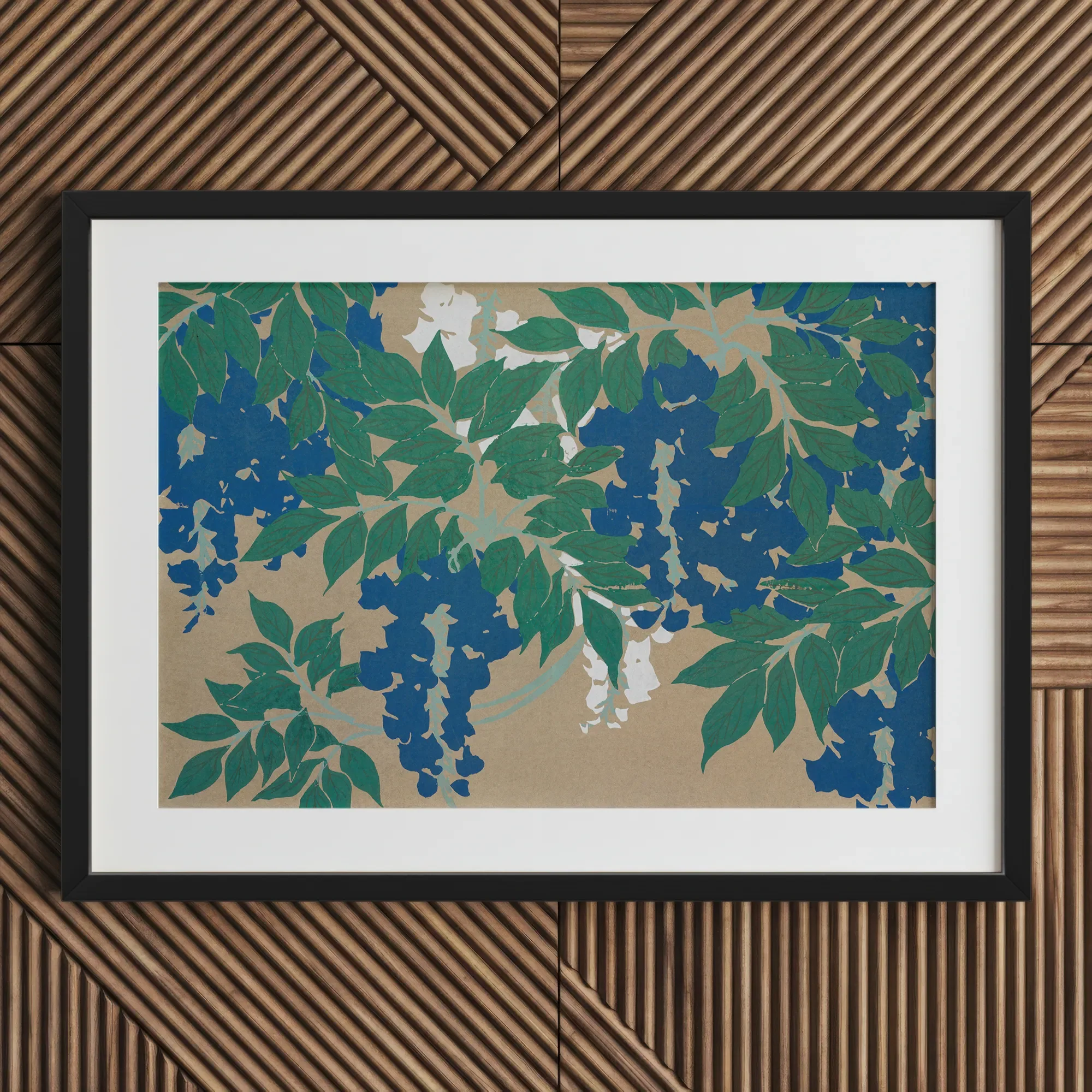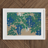 Sekka's Wisteria from Momoyogusa print will enchant your space with its hypnotic dance of indigo blooms and emerald foliage. Be transported to a mesmerizing world of Meiji-era artistry. Set sgainst a sandy backdrop, sinuous vines twist and unfurl, their rhythmic patterns echoing Art Nouveau's fluid grace.