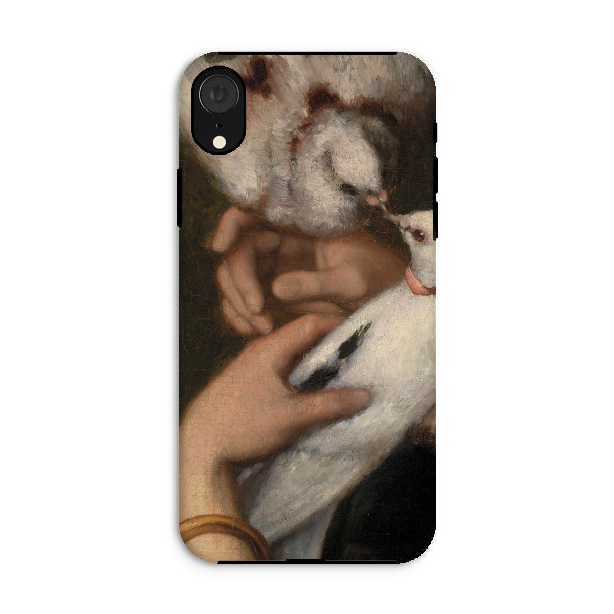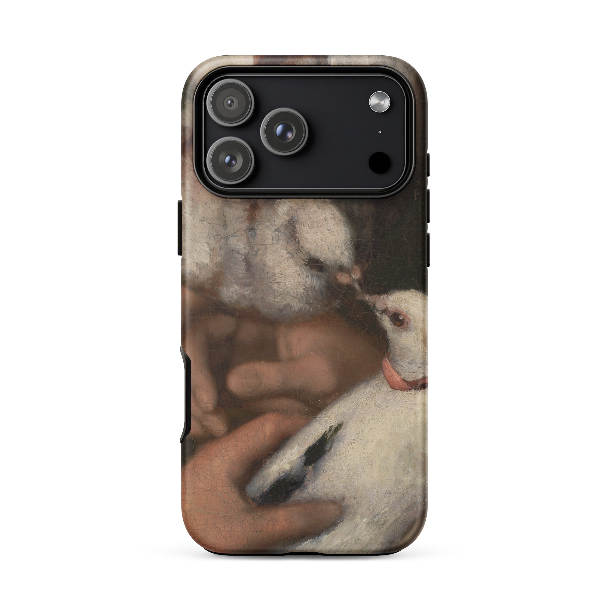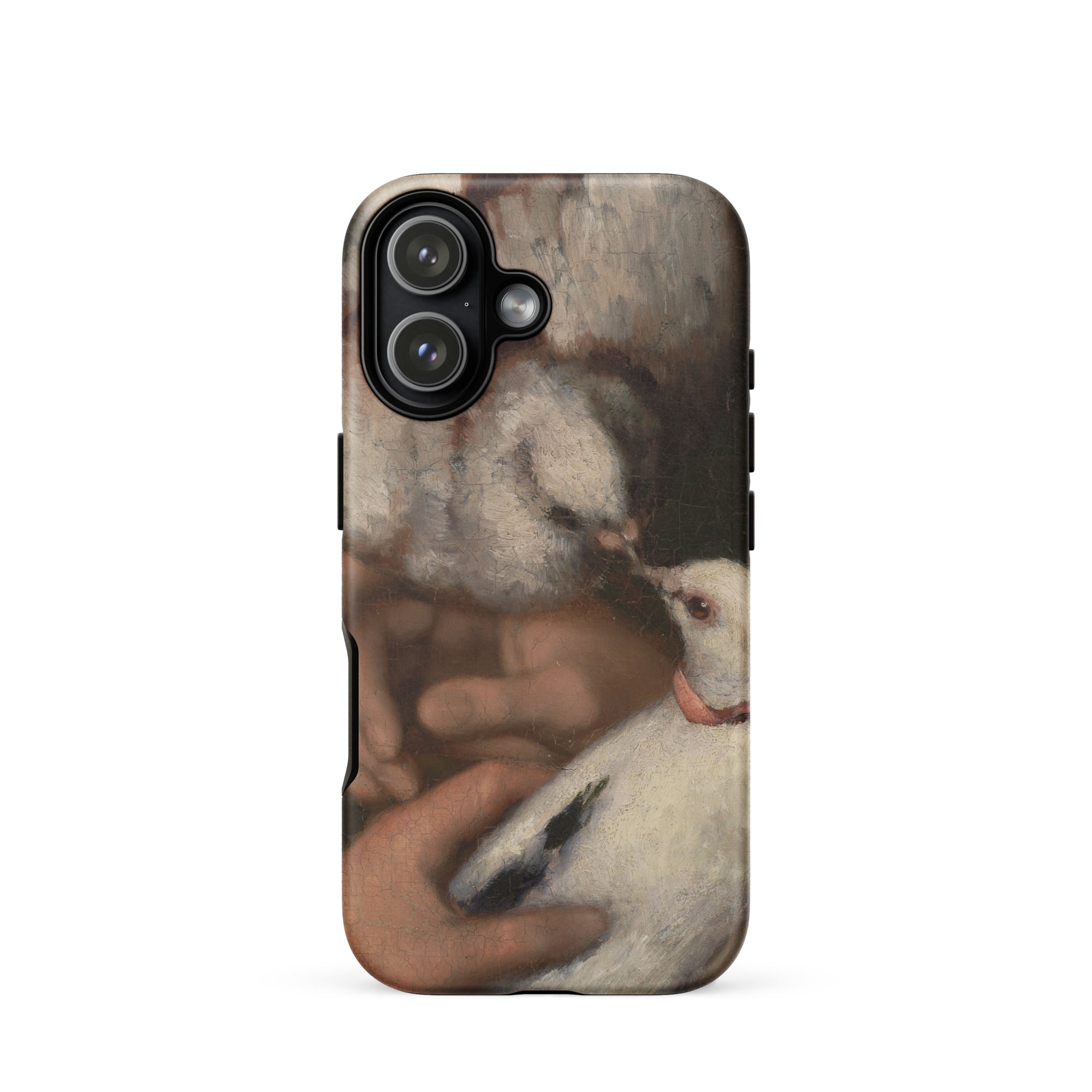 A hand meets the curve of a bird’s back the way a thought meets silence—without warning, but with the full weight of knowing. In this detail from Woman with Pigeons, the pigeons are more than birds: they’re breath held in a cupped moment, wings folded into the soft choreography of fingers. This Gustave Courbet iPhone case suspends time in a tangle of skin and plumage, capturing the realist painter’s gift for rendering flesh and feather with equal, aching precision.